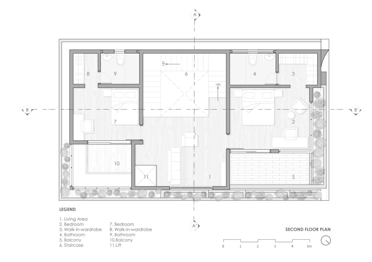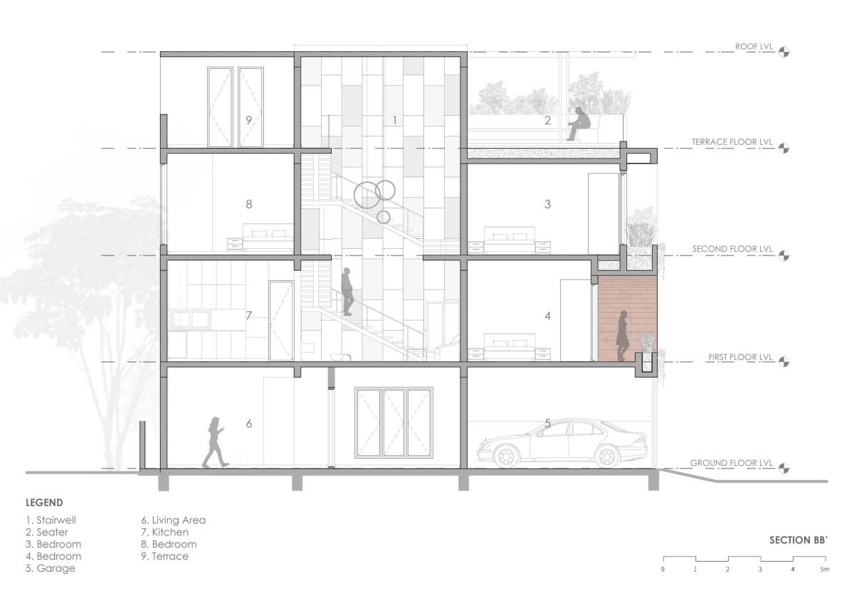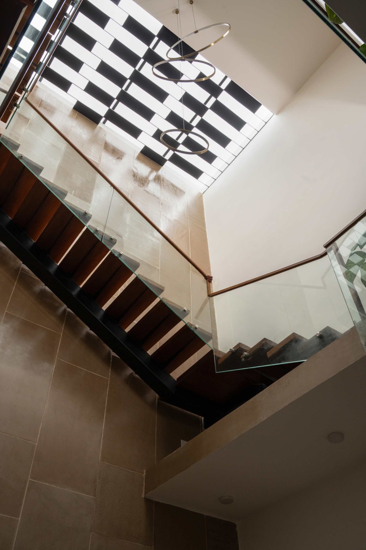 Set within a developing neighborhood, the house anticipates a future where nearby plots will rise into built forms. To remain luminous as the surroundings, densify, the planning brings daylight from above, rather than relying on open edges. A skylight above the dining area and another over the staircase draw sunlight deep into the heart of the home, tracing ever-shifting patterns across floors and walls.