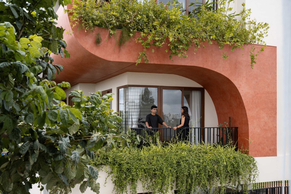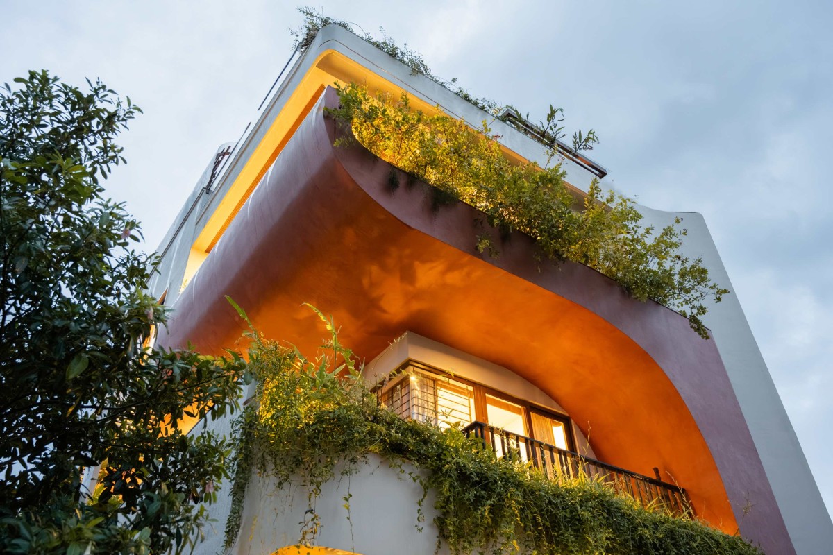 The residence takes its name from a sweeping curve that wraps the façade in a continuous reddish-brown ribbon of micro-cement. This gesture ties the floors into a single sculptural mass, shaped through persistence, experimentation, and countless on-site refinements, the curve became both the challenge and the triumph of the project, holding the cantilevered structure together, while the arched openings draw light into the house.