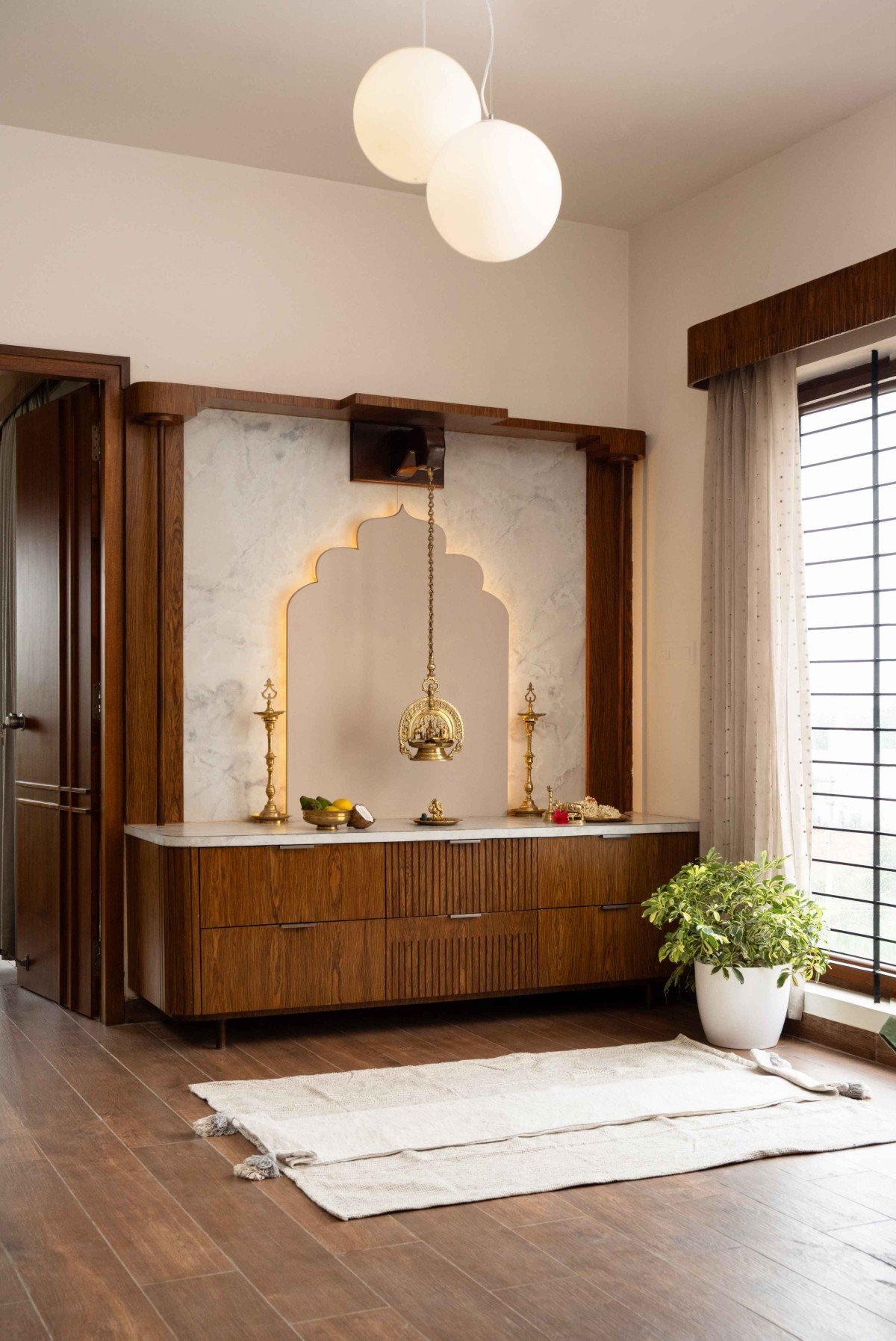 The upper-level houses two bedrooms and a serene Kodava-style puja space. Here, a suspended brass lamp, the thook bolcha, glows at the centre — a quiet echo of ancestral memory, floating in warm light.