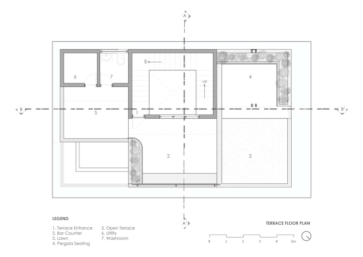 The terrace completes the home with a small bar opening into a patch of lawn — an informal retreat where evenings stretch into the openness of sky, conversations flow freely, and matches are watched under the night sky.