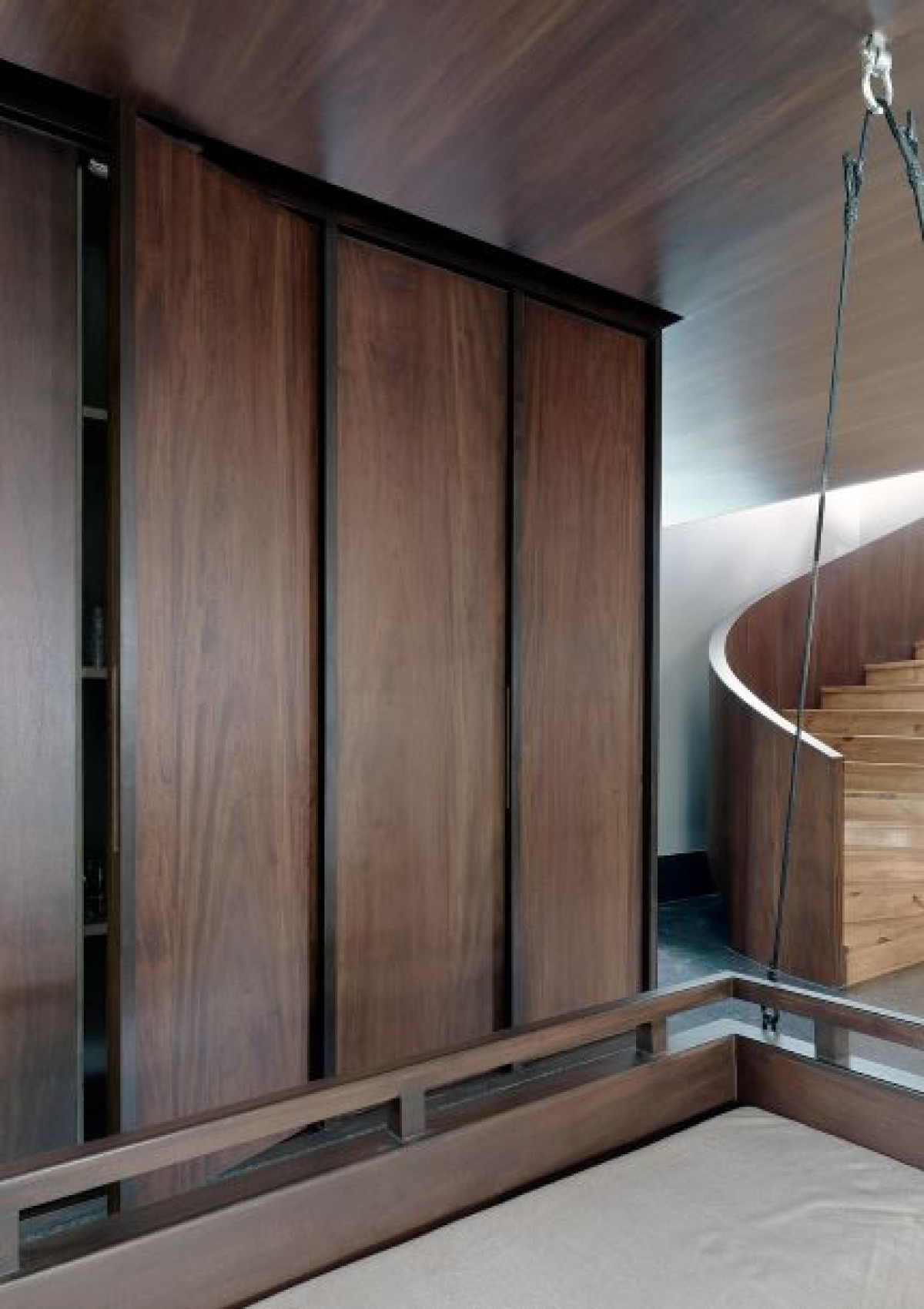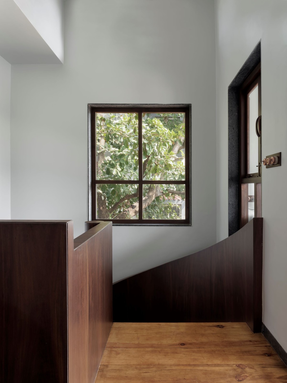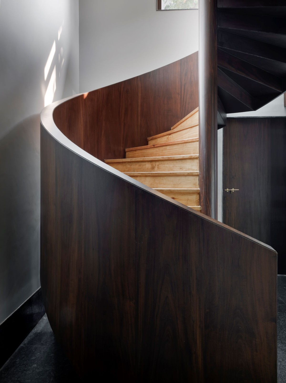 The traditional wooden stair and placed it centre stage. The teak stair is bent and pulled up through two levels, unravelling through the core of the home. It retains the materiality of traditional staircases found in Maharastrian homes, but creates a sense of ornament through quite a modern manner. It becomes something monolithic, sculptural and object-like.