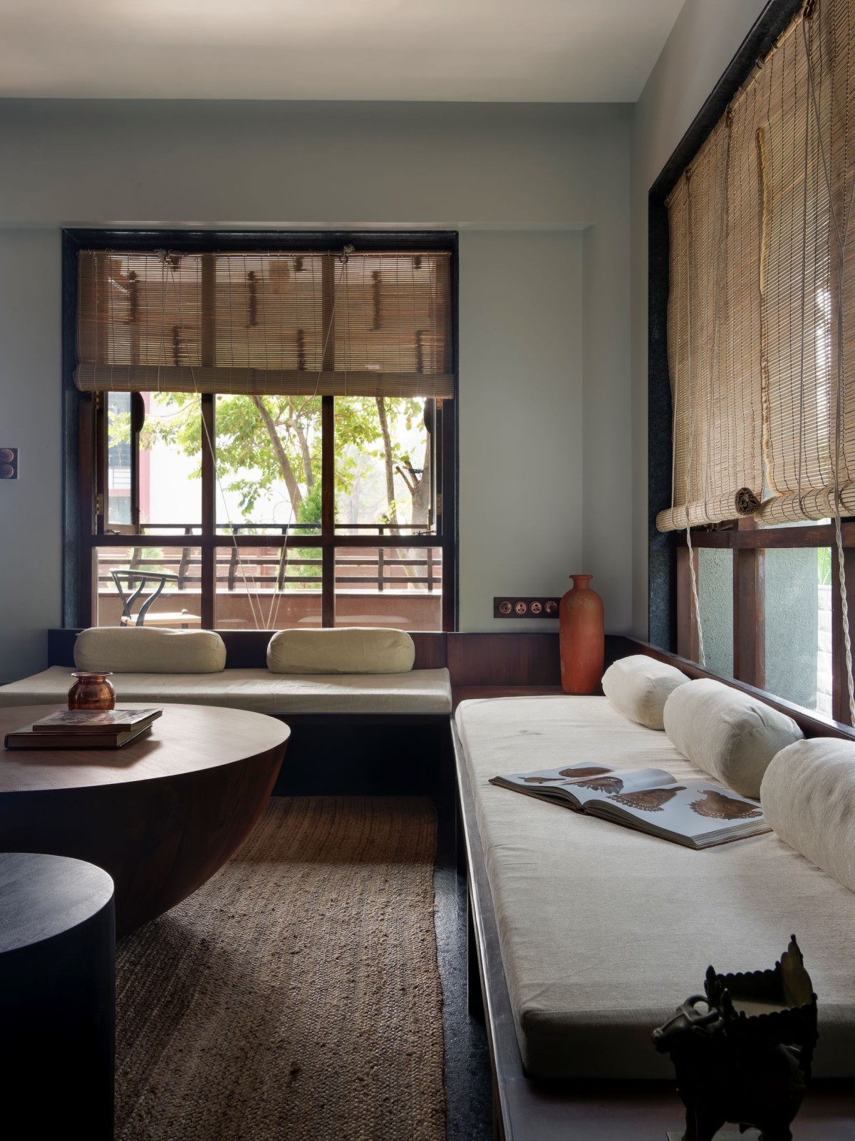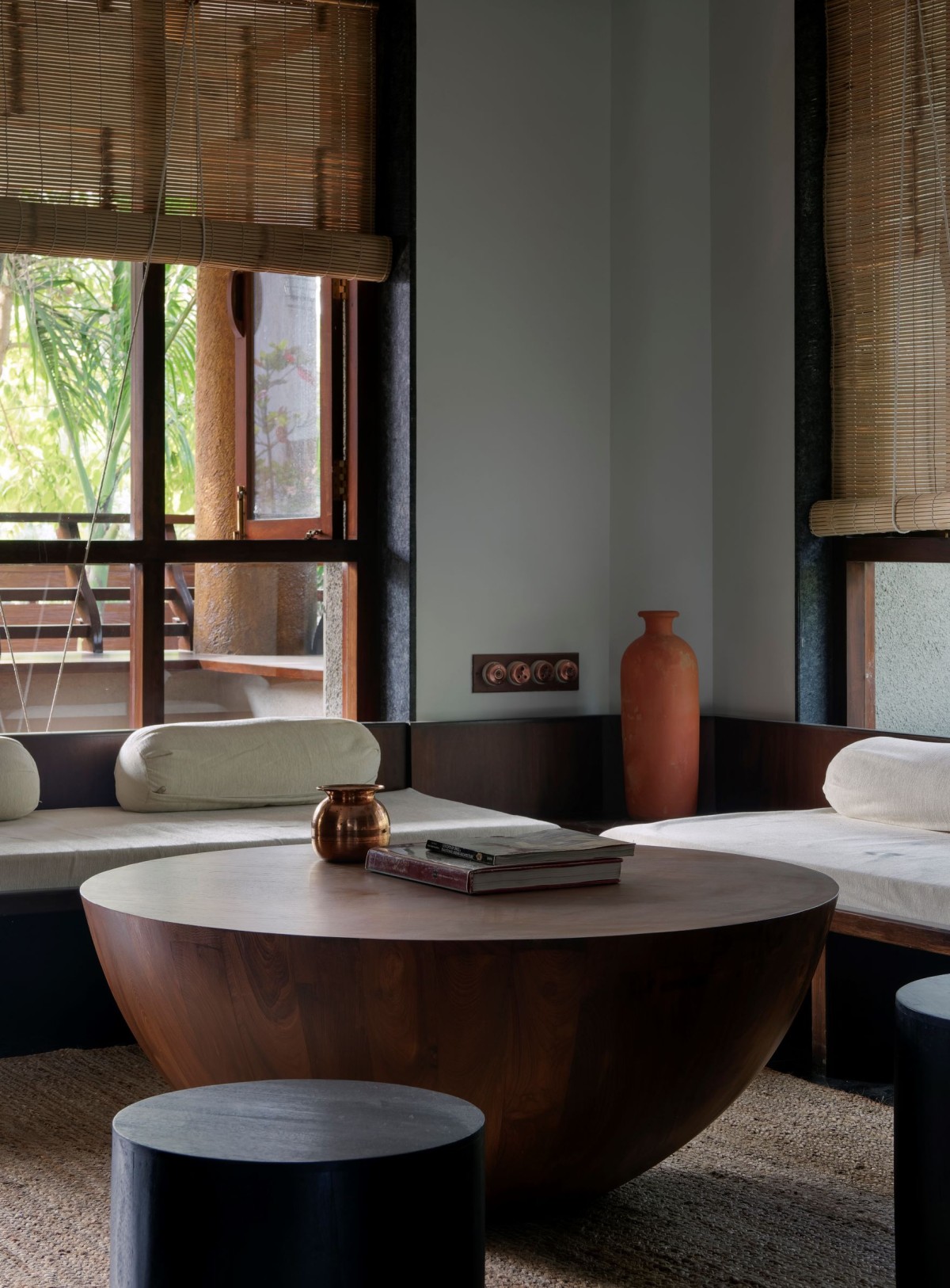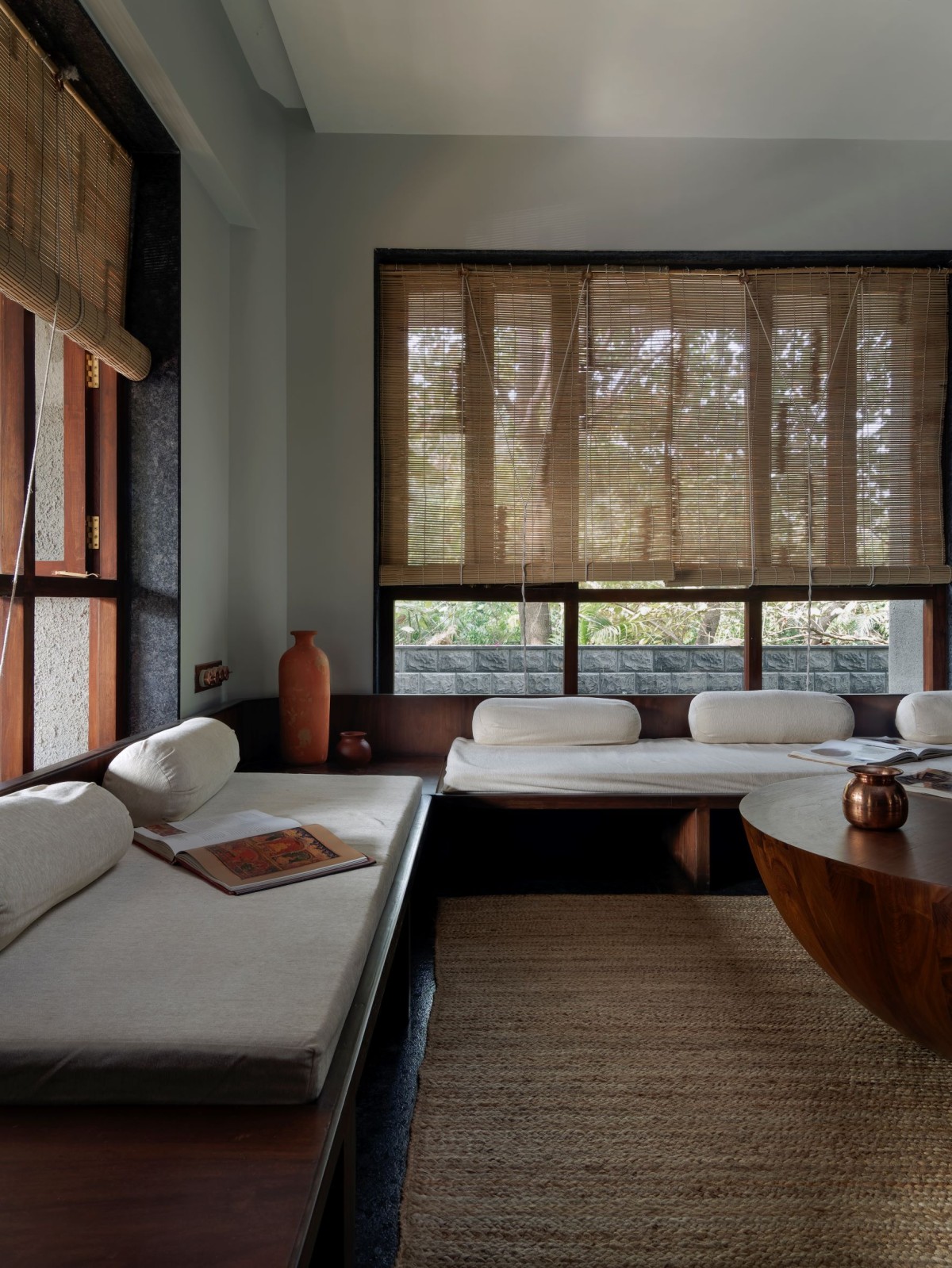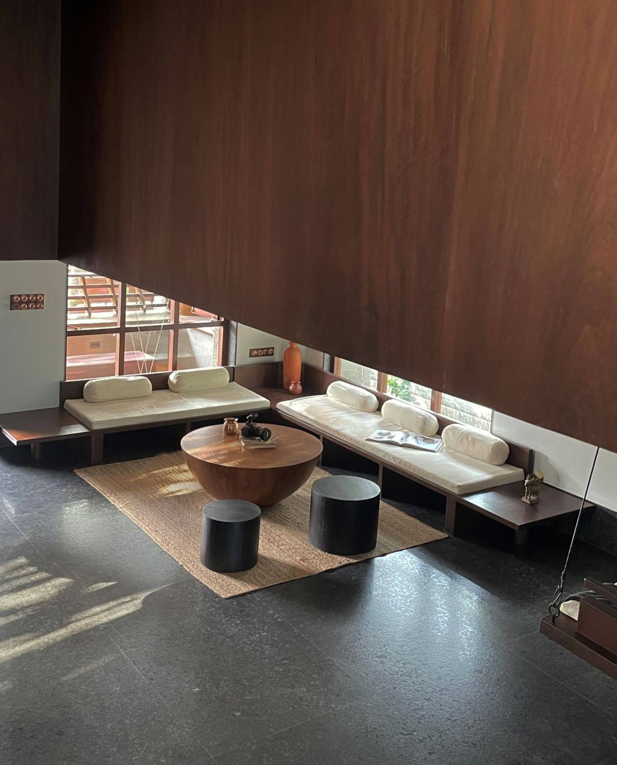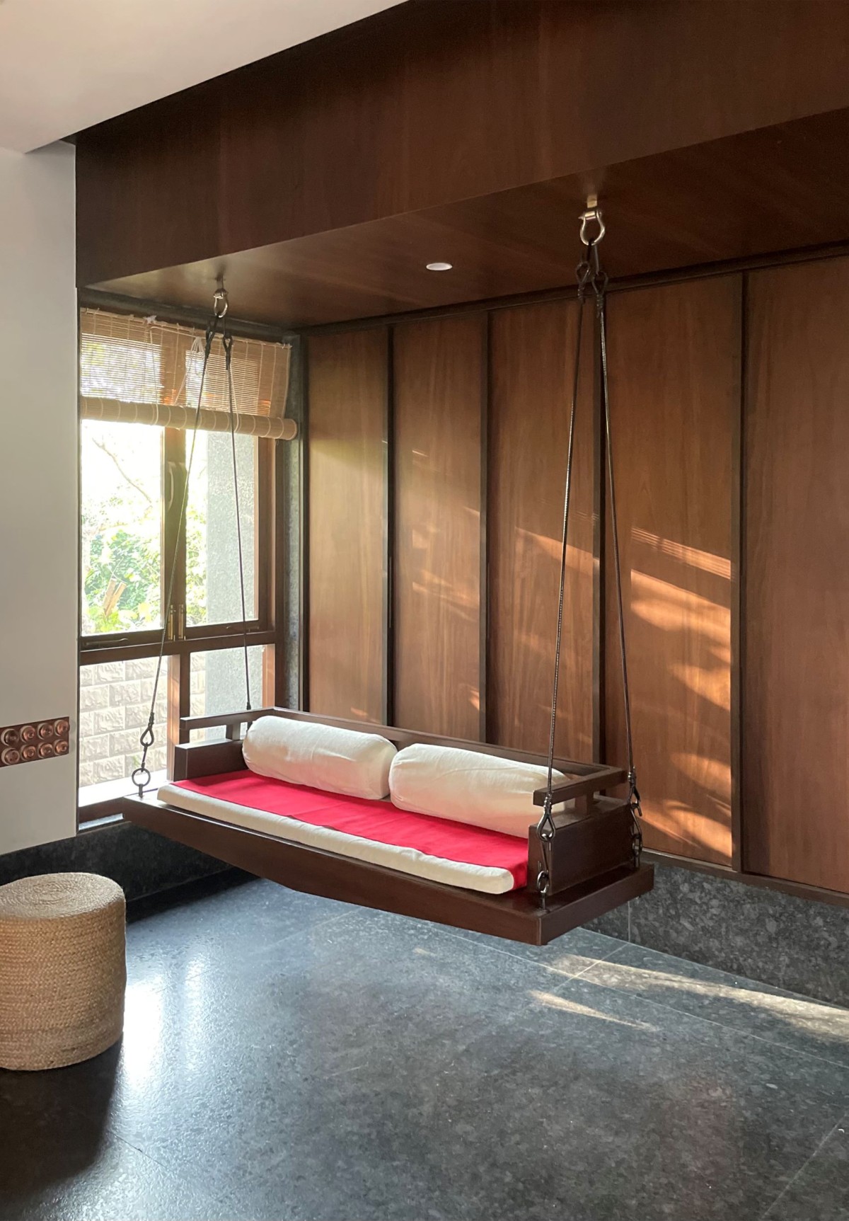 Many of the bold gestures and strong materiality are offset by a calm softness, brought in through upholstery and dressings. The windows, lined with bamboo blinds, present what Karan refers to as “a meditative quality”. Views from windows placed at various heights provide soft outlooks to foliage beyond. Feeling pretty relaxed already, right? We haven’t even got to the living area. This key room is split into two parts and presents two traditional comforts found in Indian homes -the divan and the jhula.