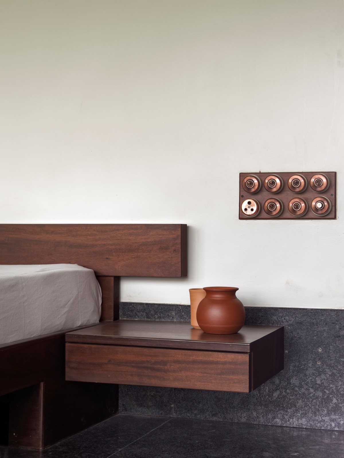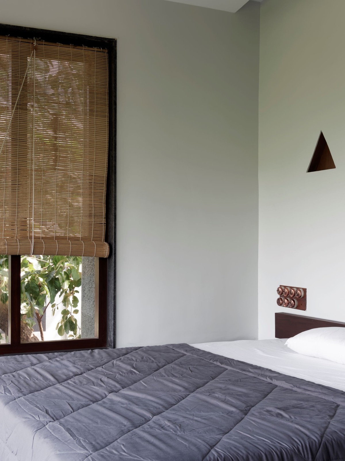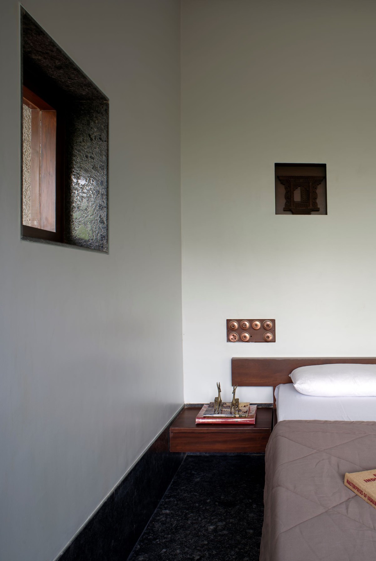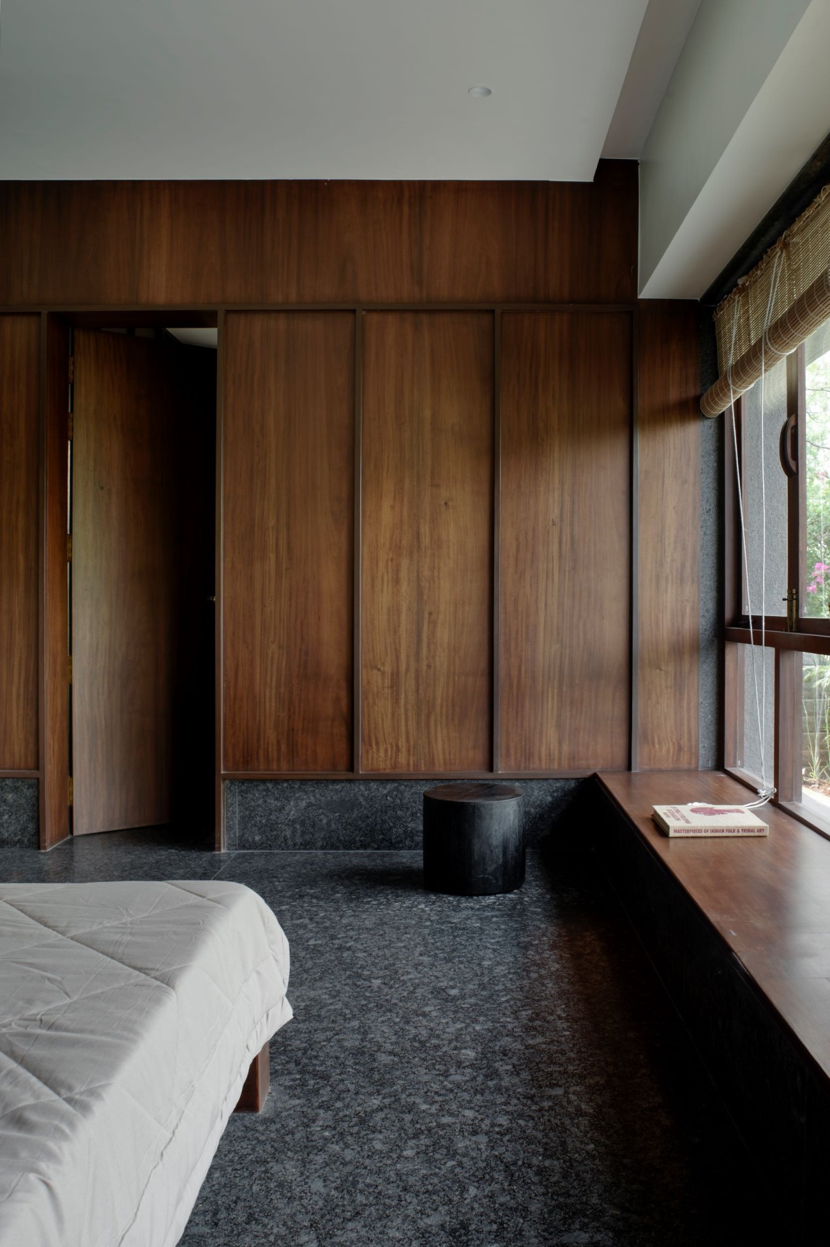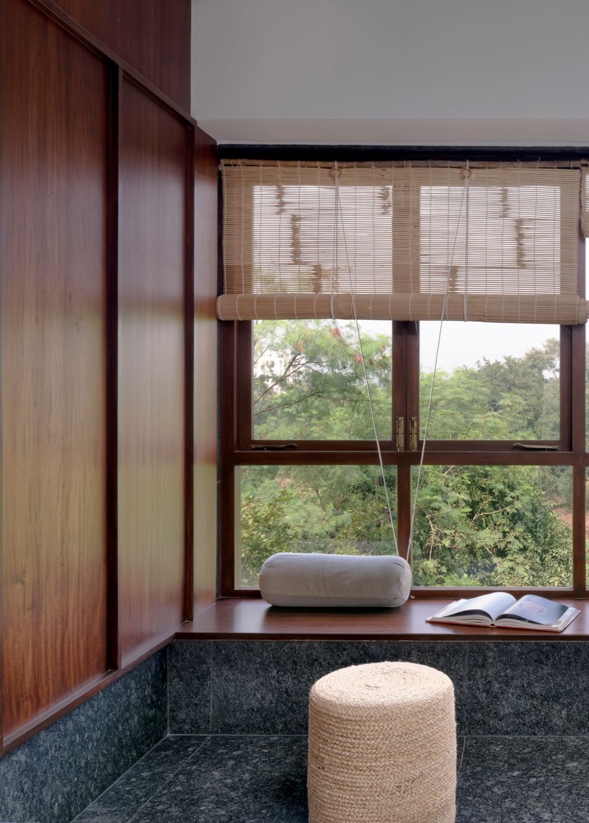 Many of the bold gestures and strong materiality are offset by a calm softness, brought in through upholstery and dressings. The windows, lined with bamboo blinds, present what Karan refers to as “a meditative quality”. Views from windows placed at various heights provide soft outlooks to foliage beyond. Feeling pretty relaxed already, right? We haven’t even got to the living area. This key room is split into two parts and presents two traditional comforts found in Indian homes -the divan and the jhula.