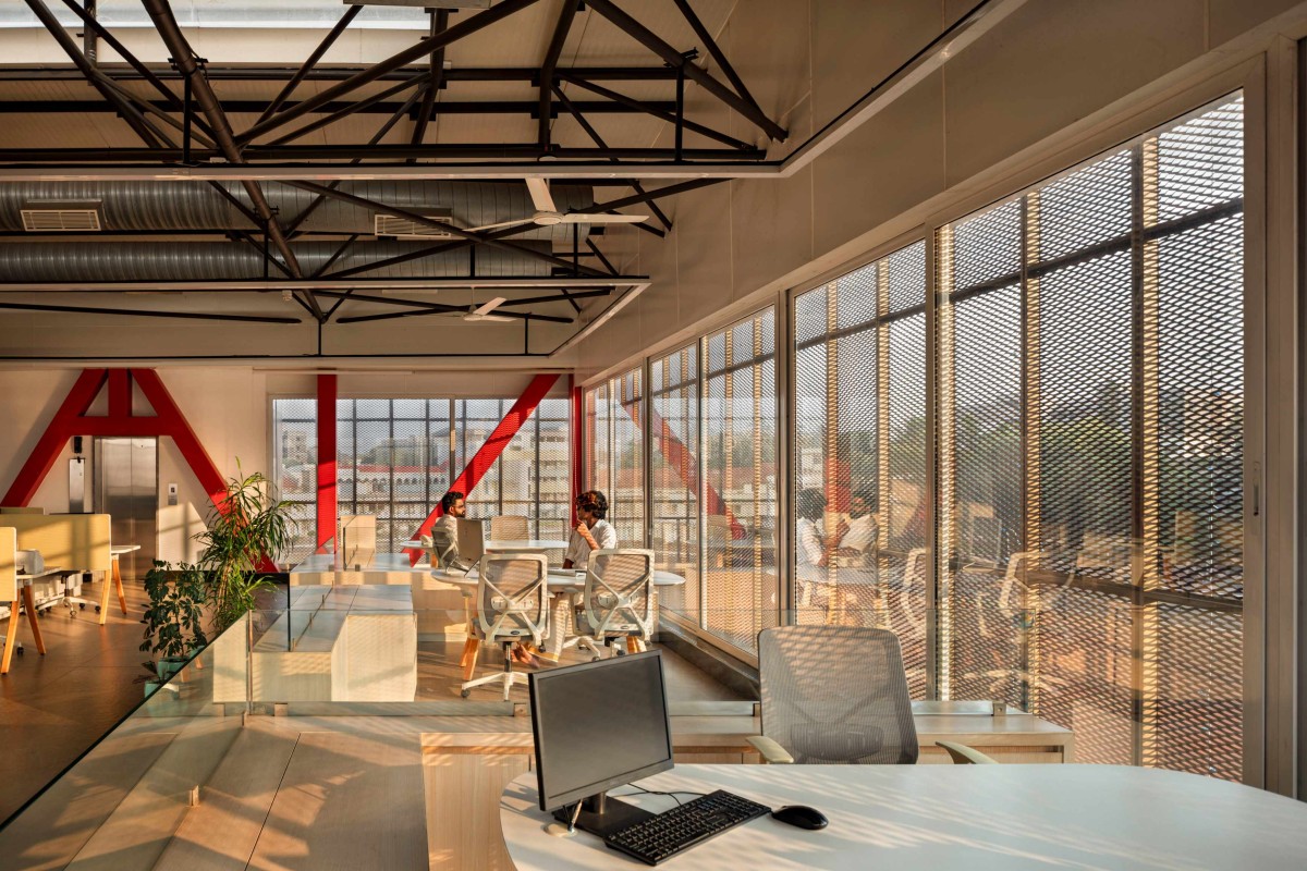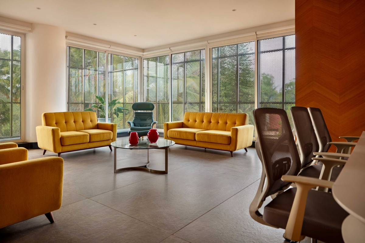 Wrapped in a continuous verandah inspired by colonial architecture, the new office engages with its surroundings while mitigating climate. The verandah serves as a social space and climatic buffer, shielding the interiors from sun and rain. Operable aluminium fins and expanded mesh control light and views, while sliding glass doors allow seamless access to the outdoors. Inside, a neutral palette, vibrant accents, and indoor plants create a tranquil, daylit workspace.