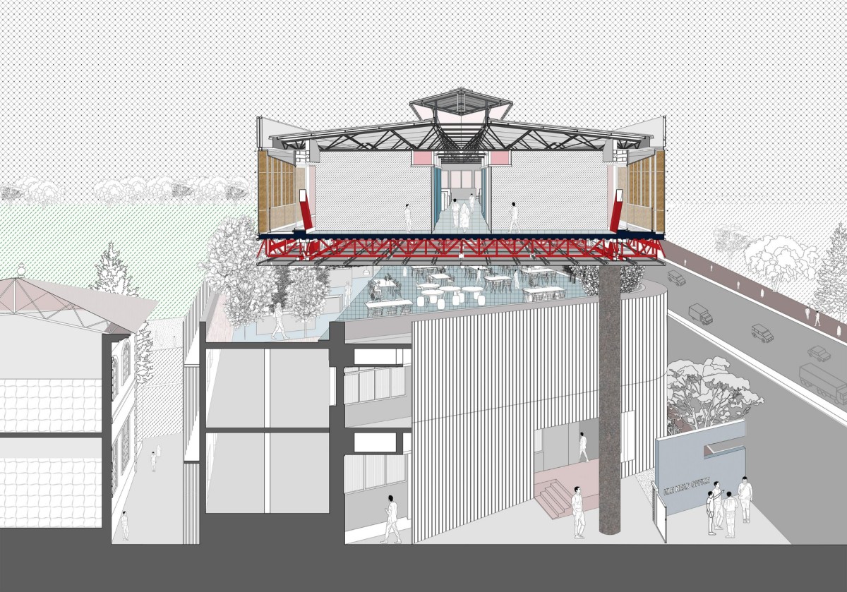 Sectional Perspective of Hover Space – Extension to the KLE Society Head Office by Thirdspace Architecture Studio