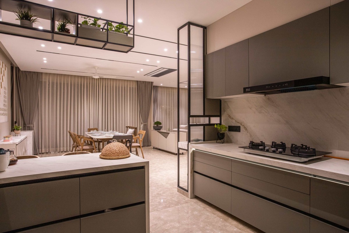The kitchen flows directly into the dining area, making the whole space feel large and perfect for family time. The modular cabinets are designed with clean lines and no clutter, giving the kitchen a very sophisticated and high-end look.
