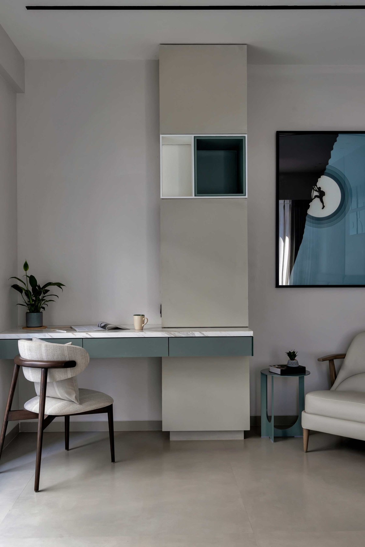Micro-Concrete or Smooth Plaster: The left side of the feature wall uses a seamless, matte finish to provide a "visual rest" for the eye.