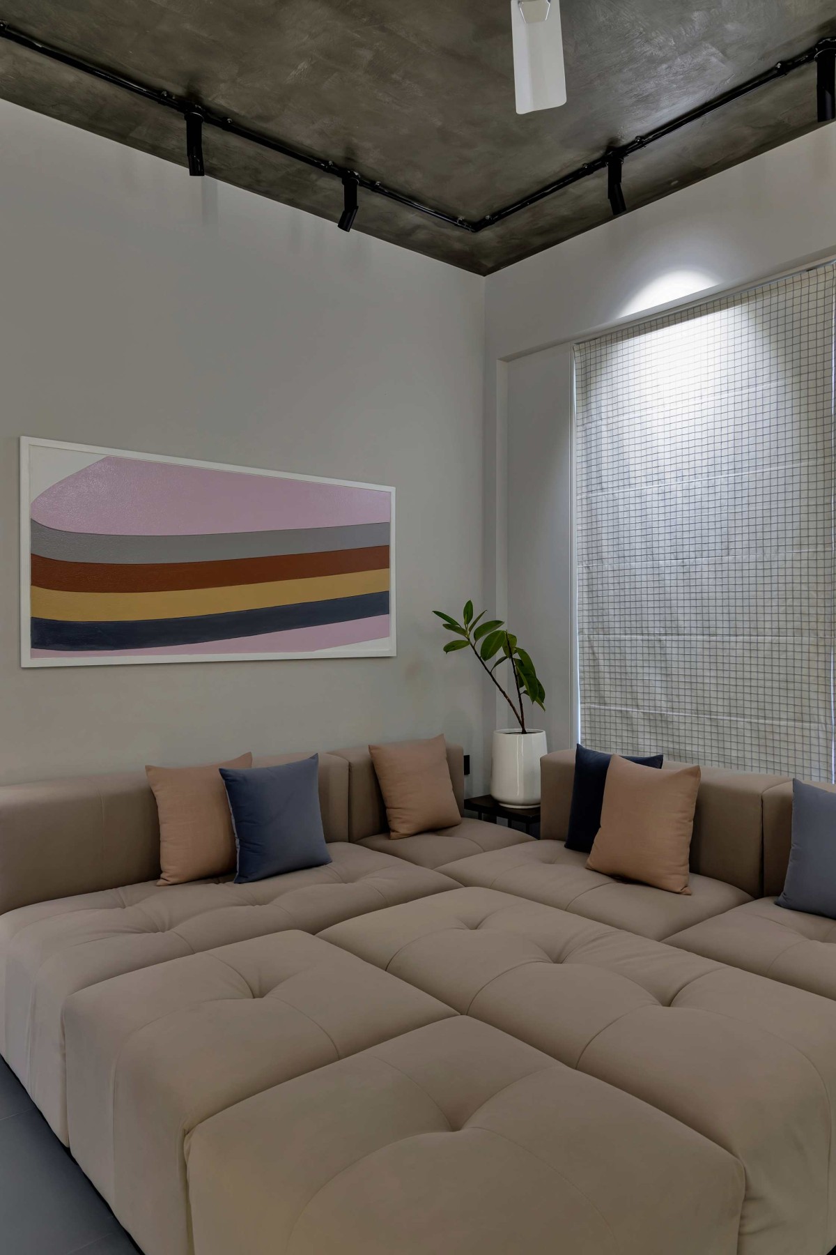 Powder-Coated Metal: The slim legs of the furniture and the ceiling track lighting are finished in matte black, providing "sharp ink lines" that define the boundaries of the space.