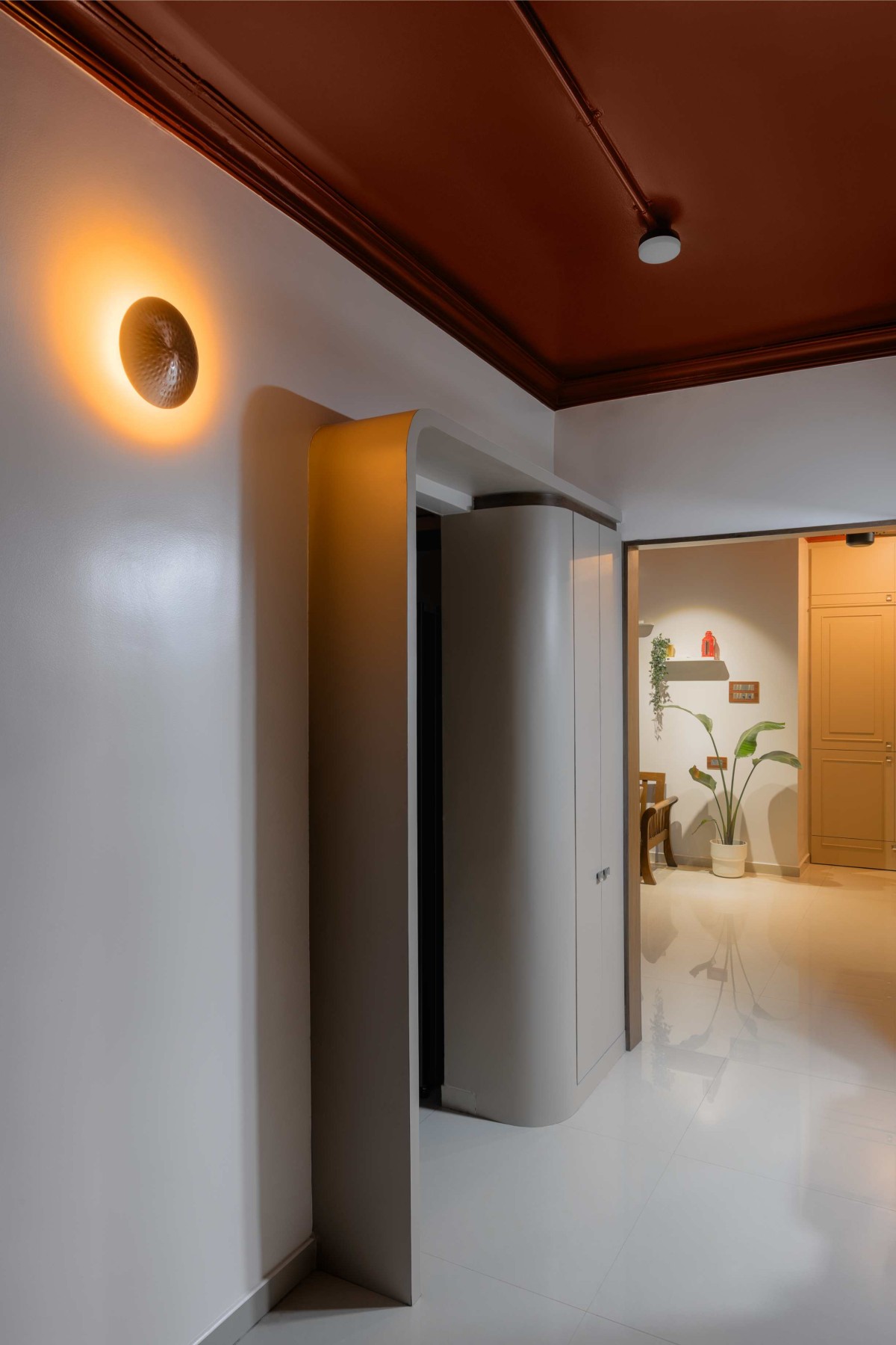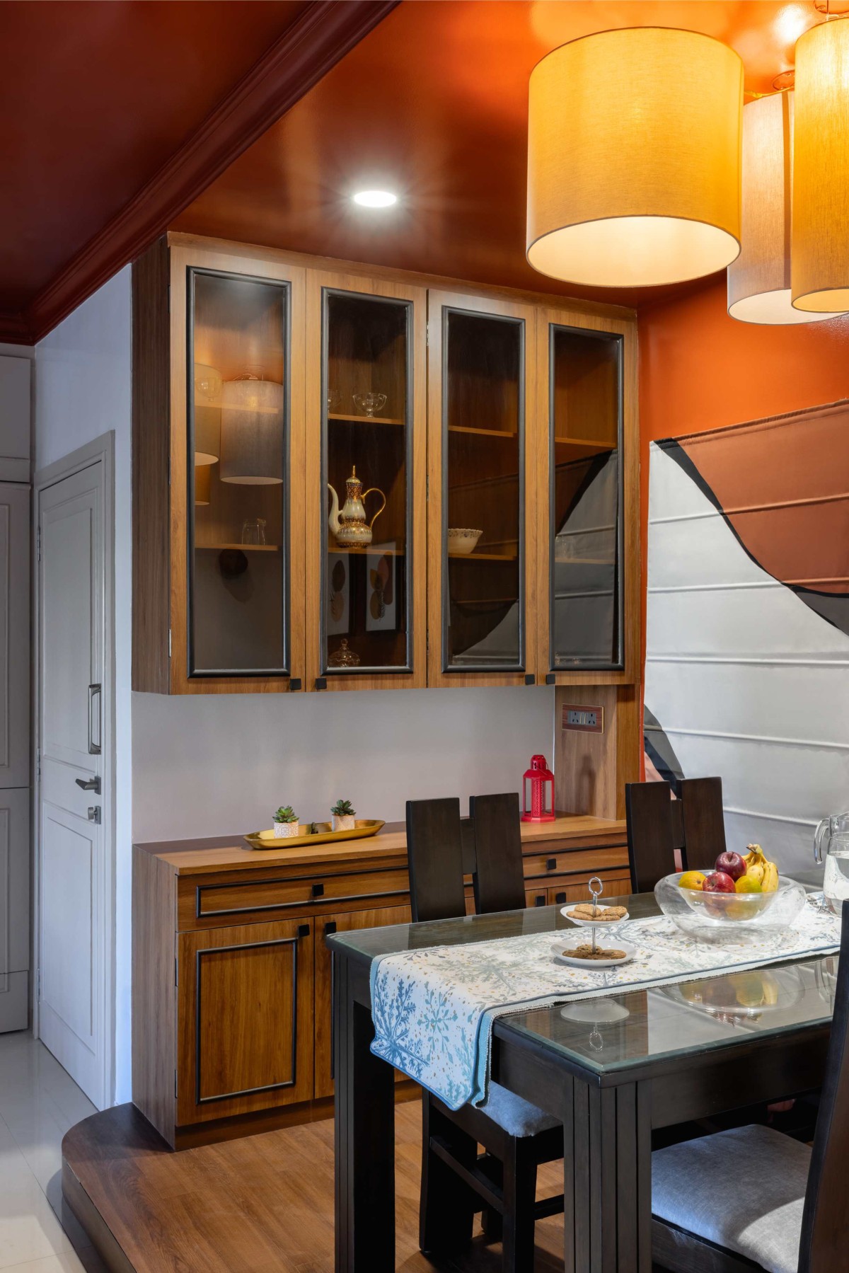 The kitchen’s vibrant carrot punch hues energise the space. The protruded opening ingeniously incorporates storage solutions, making the kitchen not only aesthetically pleasing but also highly functional. This space is designed to be the heart of the home, where culinary creativity can thrive.
