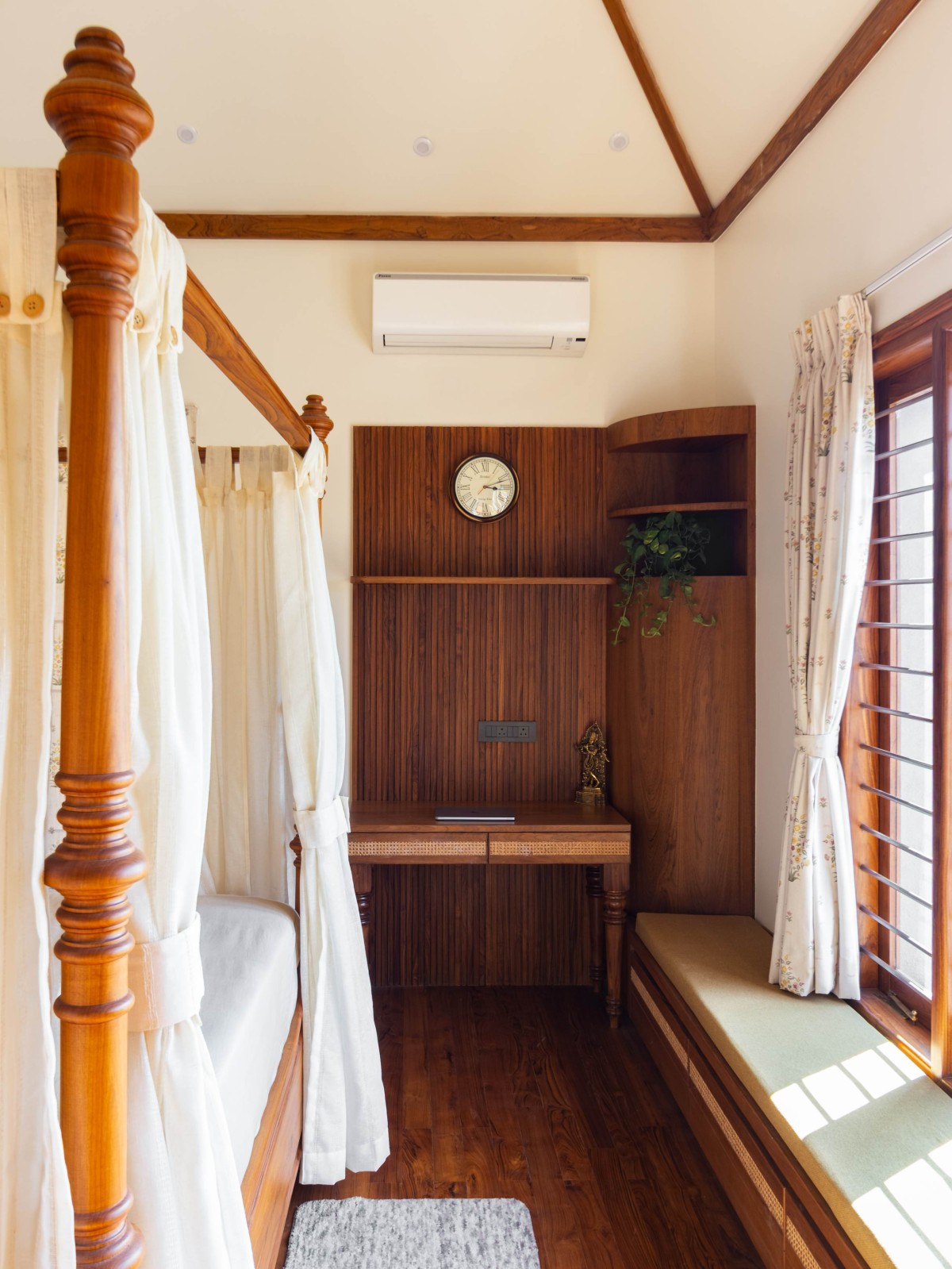 The first master bedroom follows a European aesthetic, where elegant mouldings, soft grey hues, and a restrained palette come together. The second master bedroom, defined by its sloping roof and generous ceiling height, is a more dramatic yet intimate space, enriched with intricate wooden detailing that adds character.