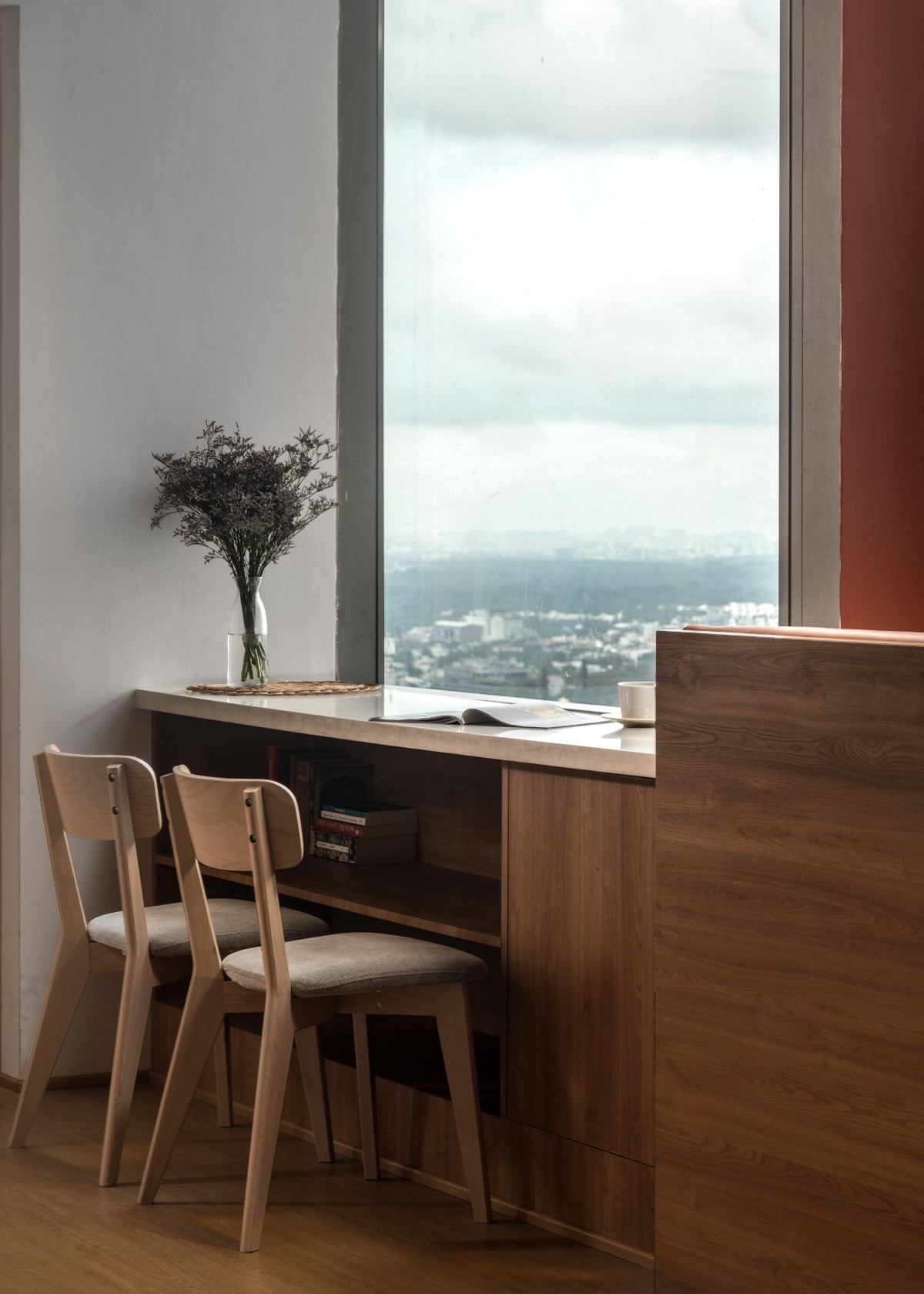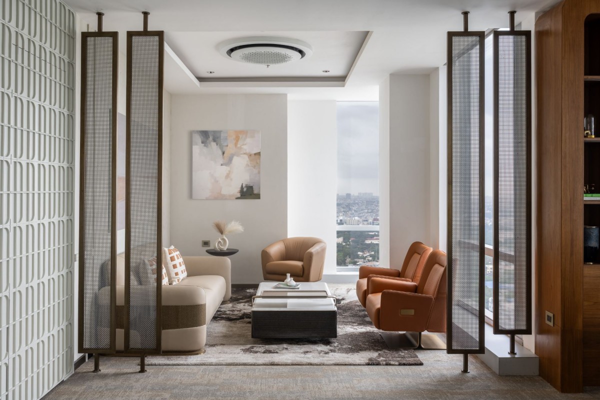 A custom table was the designer's favourite piece and A custom patterned sofa became the focal point of the lounge area. Wall art and patterned cushions bring in playful textures, while the transparent partitions frame the space with subtle definition. The design blends comfort and sophistication to suit both casual and formal settings.