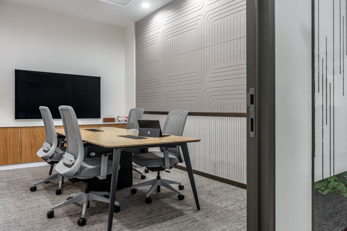 Sleek design with purposeful comfort neutral tones with subtle accents focused on productivity and collaboration where form meets function effortlessly. Thoughtful lighting enhances focus and calm materials chosen for durability and elegance a space that promotes clarity and connection designed to inspire confidence and creativity.