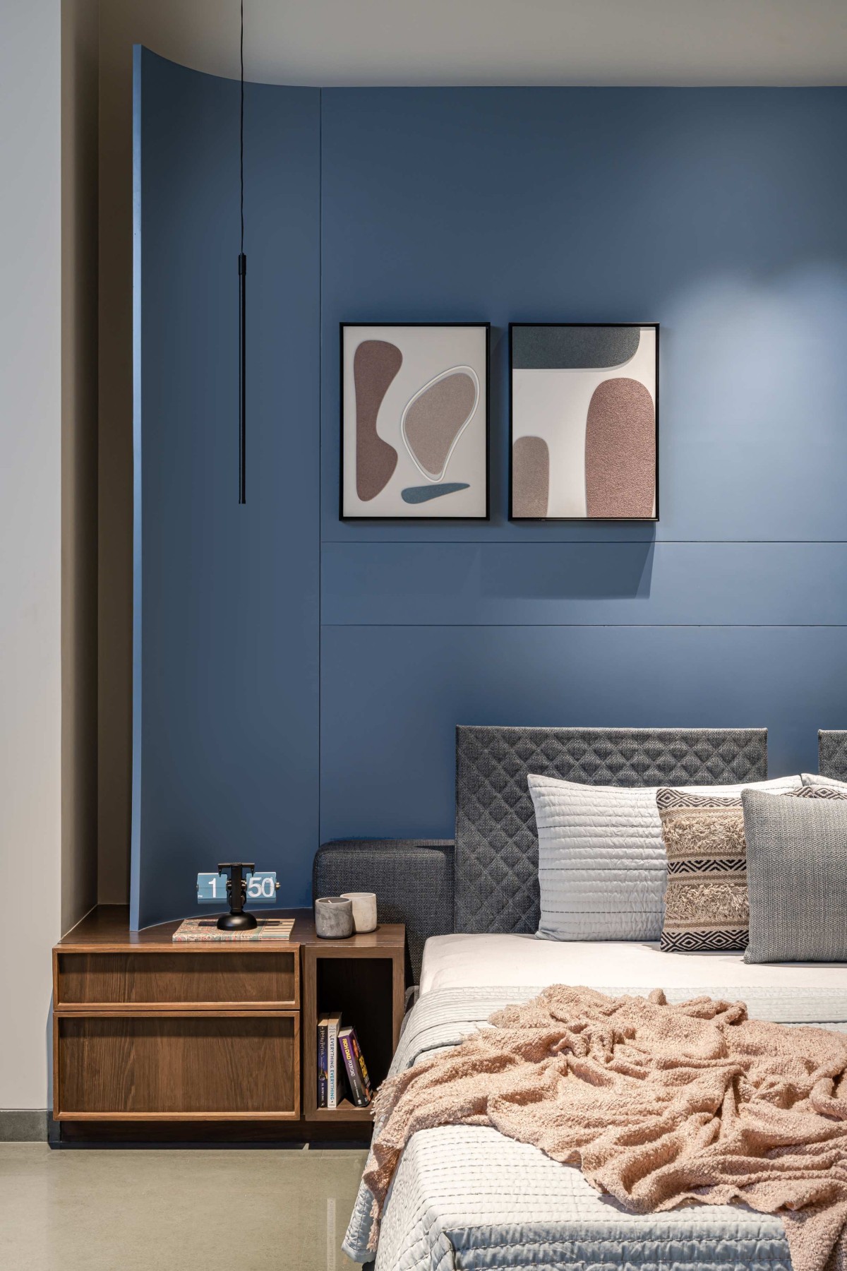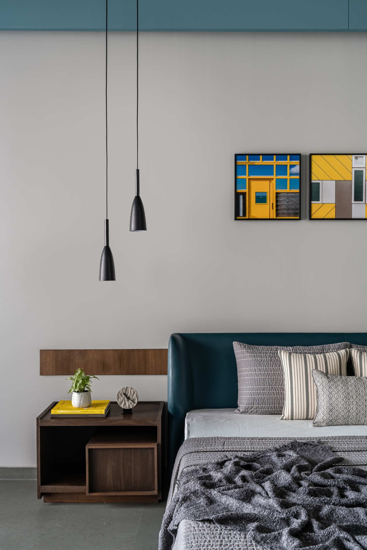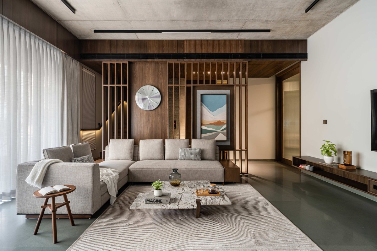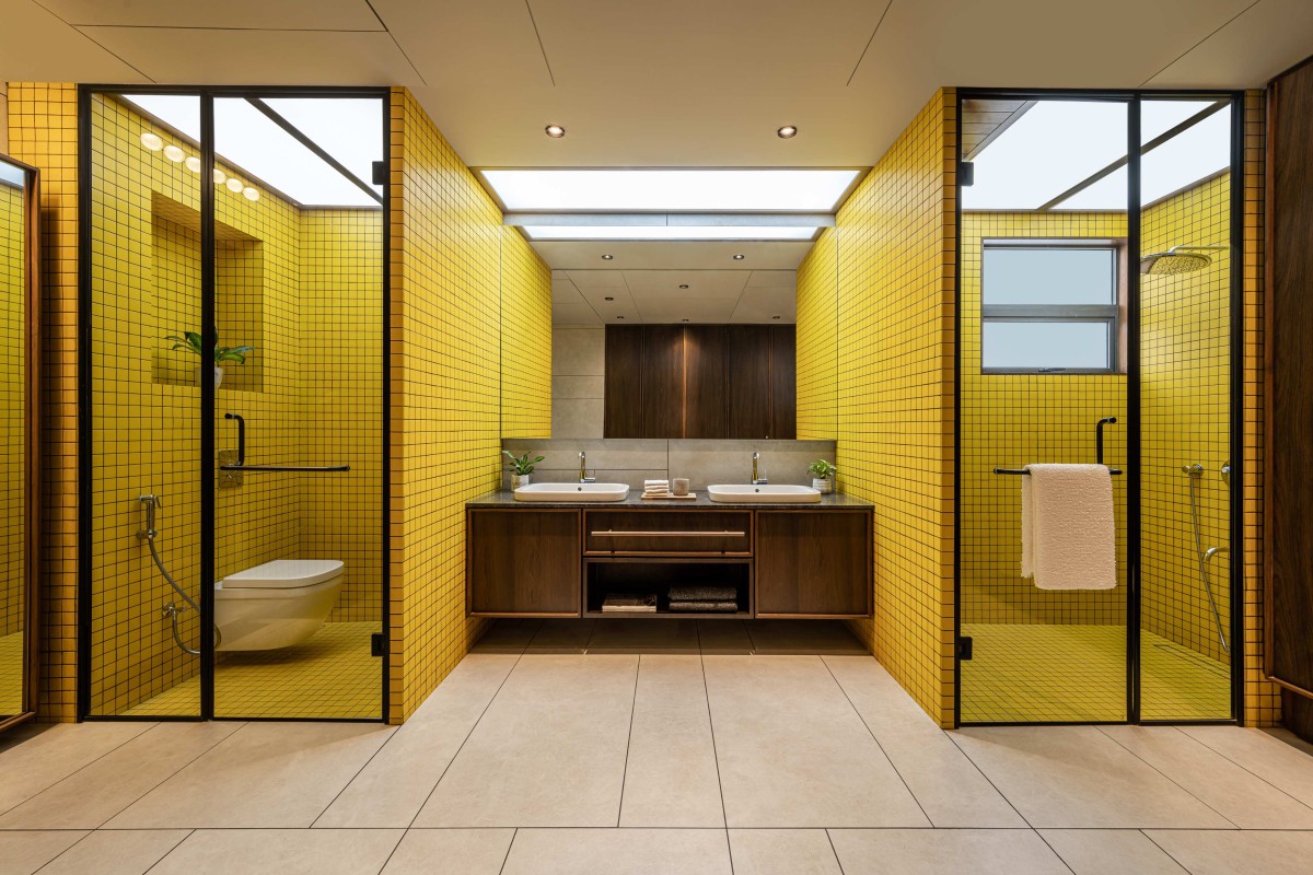 In the façade we have used exposed R.C.C. ceilings. To balance the texture of exposed concrete we have used kota stone in the flooring which adds warmth to the space. Public areas are designed with neutral colour palette to balance it we have used colours in private areas. As you can see, we have used piccolo in bathrooms and each bathroom has a different coloured piccolo according to the user. That colour is carry forwarded into bedrooms with natural colour palette which makes the space lively.