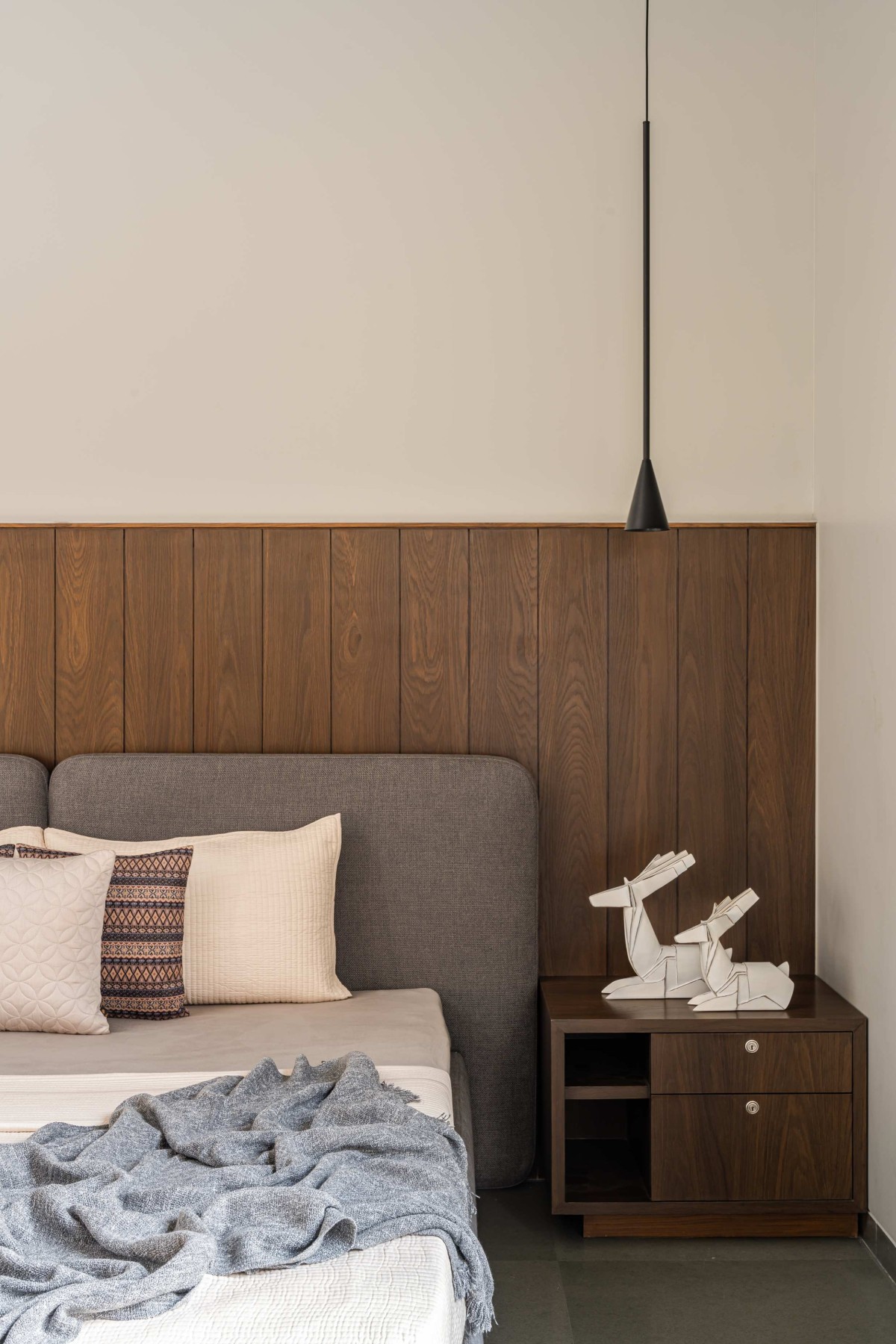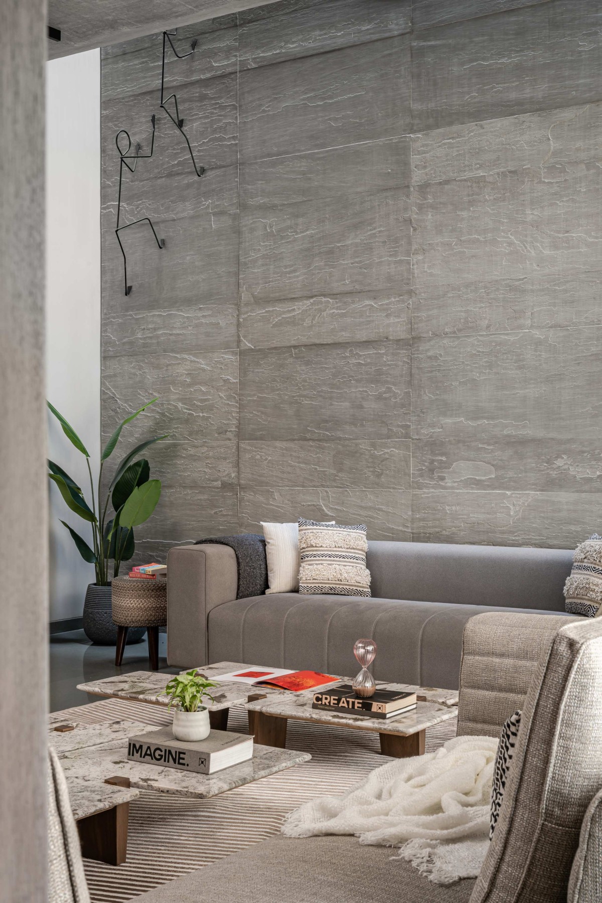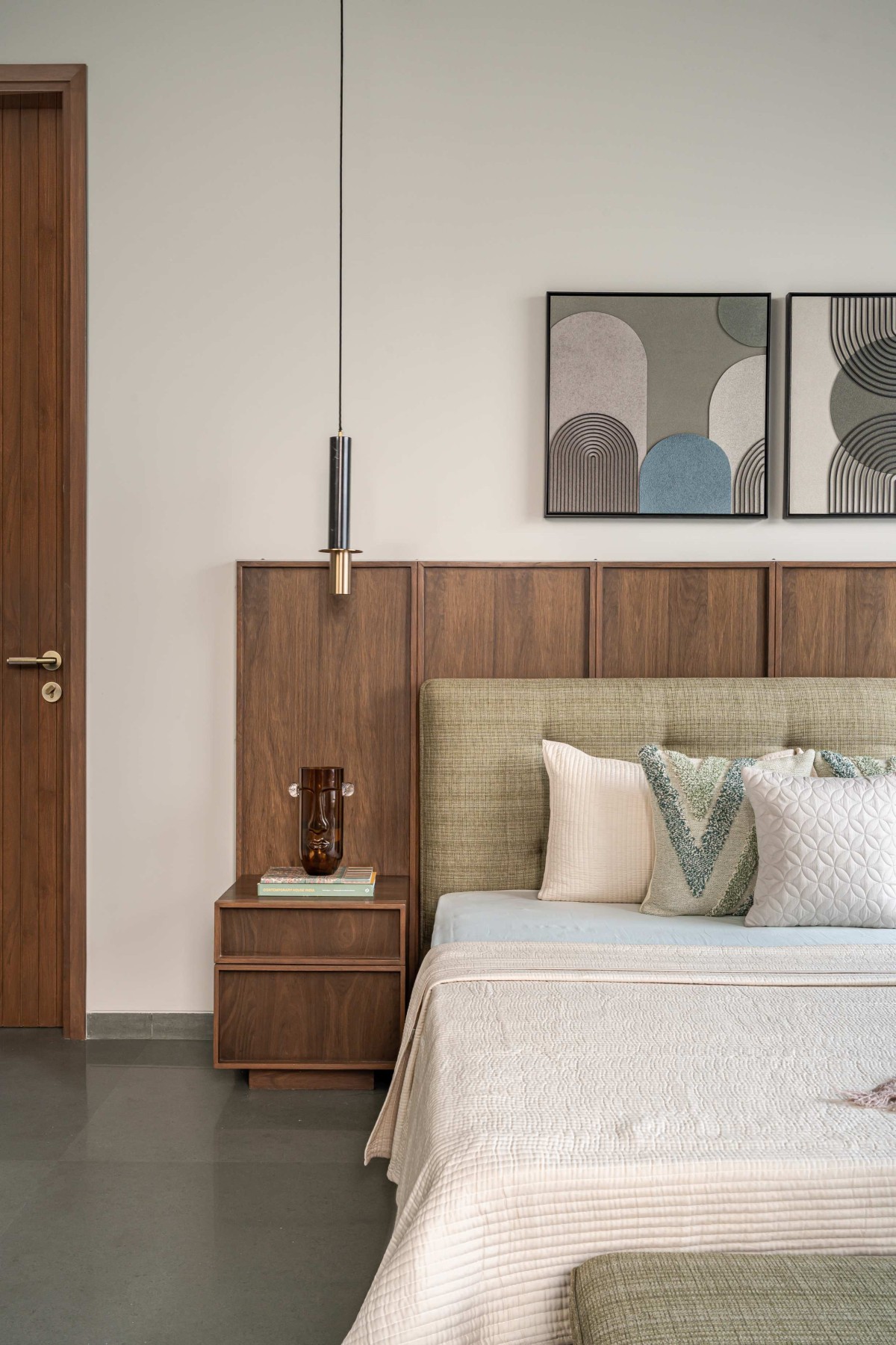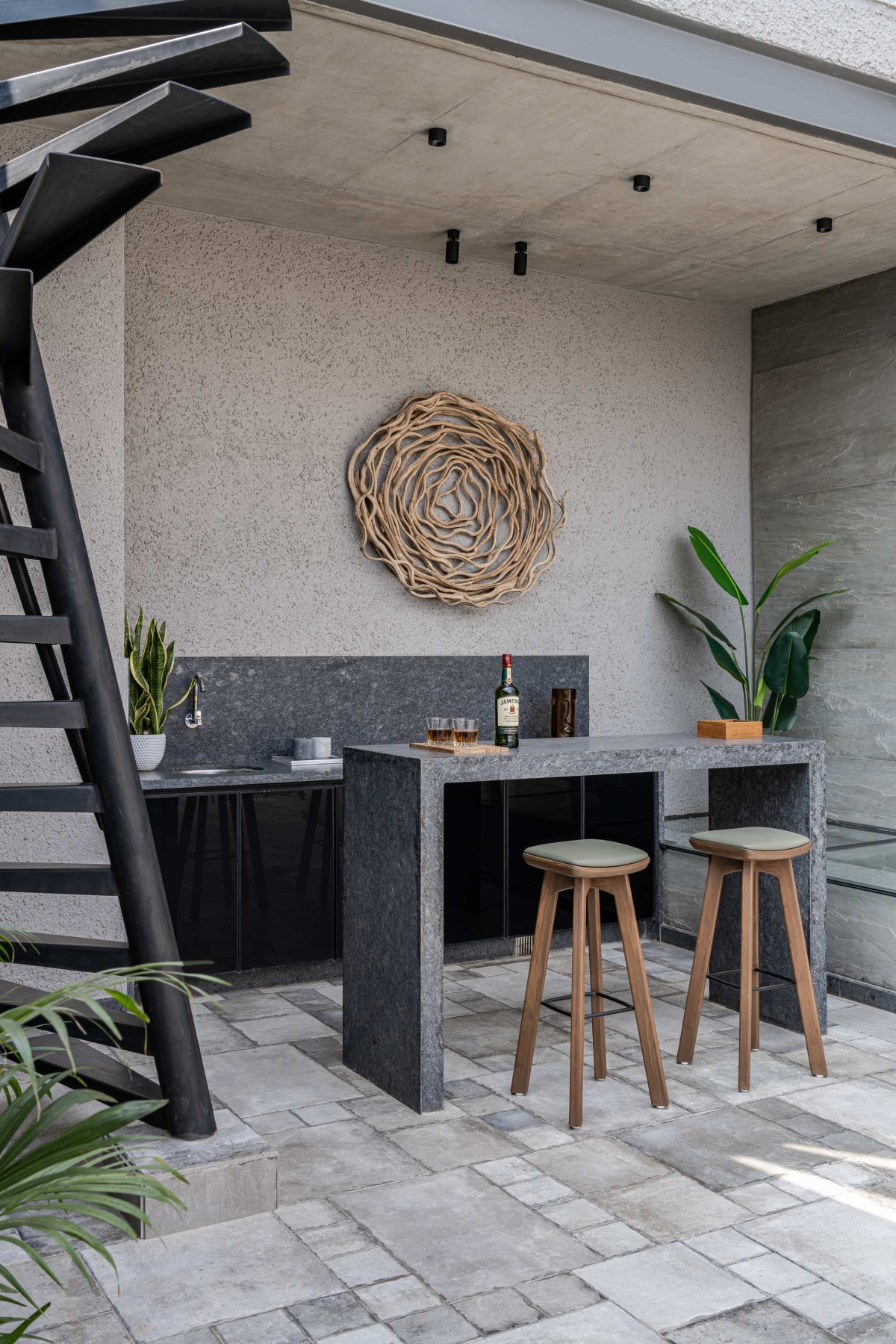 In the façade we have used exposed R.C.C. ceilings. To balance the texture of exposed concrete we have used kota stone in the flooring which adds warmth to the space. Public areas are designed with neutral colour palette to balance it we have used colours in private areas. As you can see, we have used piccolo in bathrooms and each bathroom has a different coloured piccolo according to the user. That colour is carry forwarded into bedrooms with natural colour palette which makes the space lively.