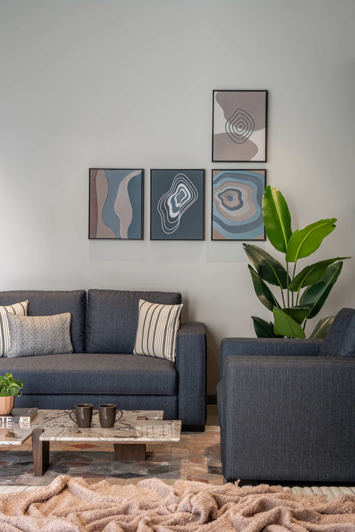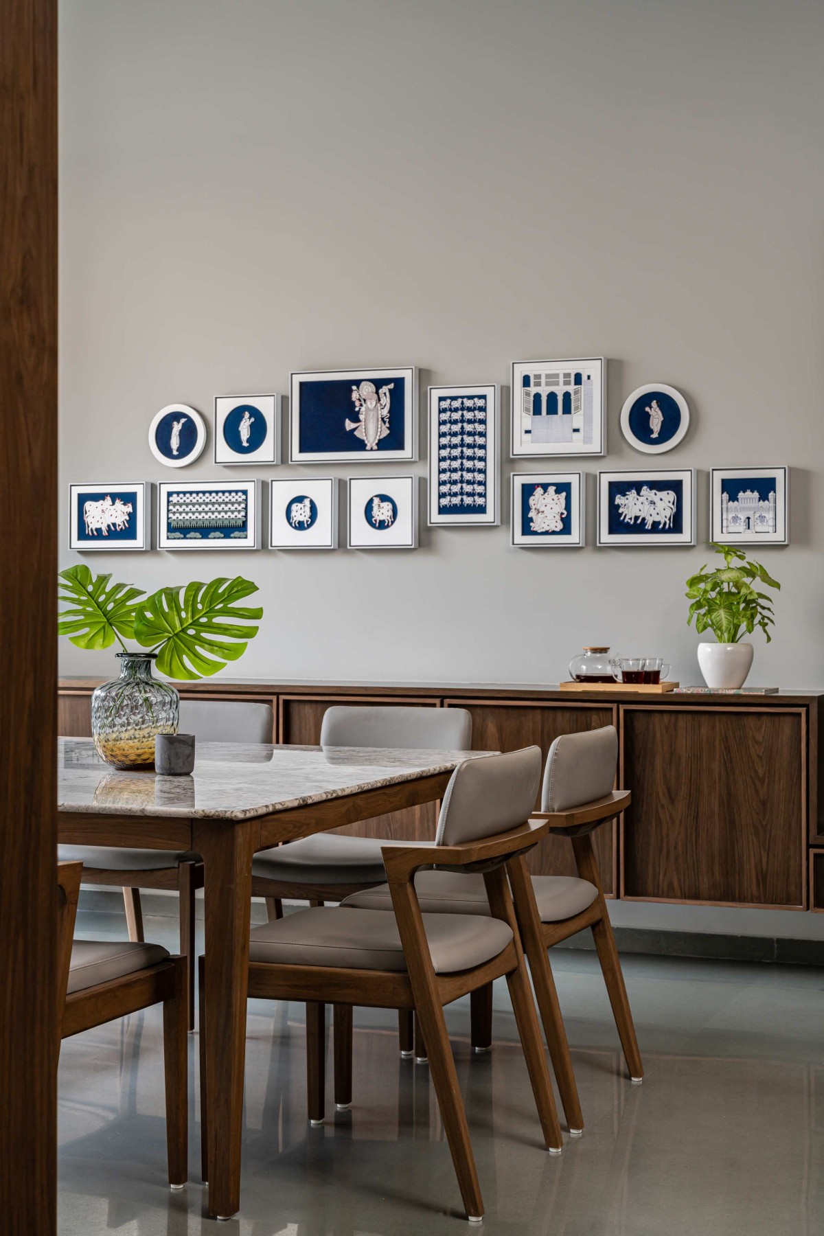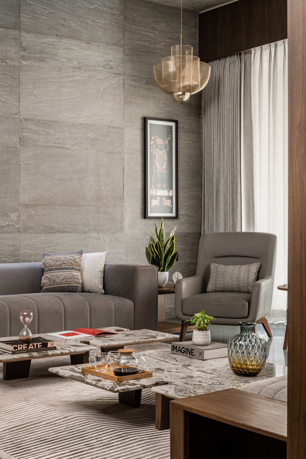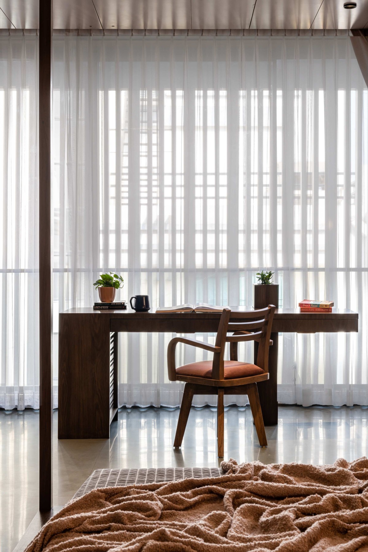 In the façade we have used exposed R.C.C. ceilings. To balance the texture of exposed concrete we have used kota stone in the flooring which adds warmth to the space. Public areas are designed with neutral colour palette to balance it we have used colours in private areas. As you can see, we have used piccolo in bathrooms and each bathroom has a different coloured piccolo according to the user. That colour is carry forwarded into bedrooms with natural colour palette which makes the space lively.