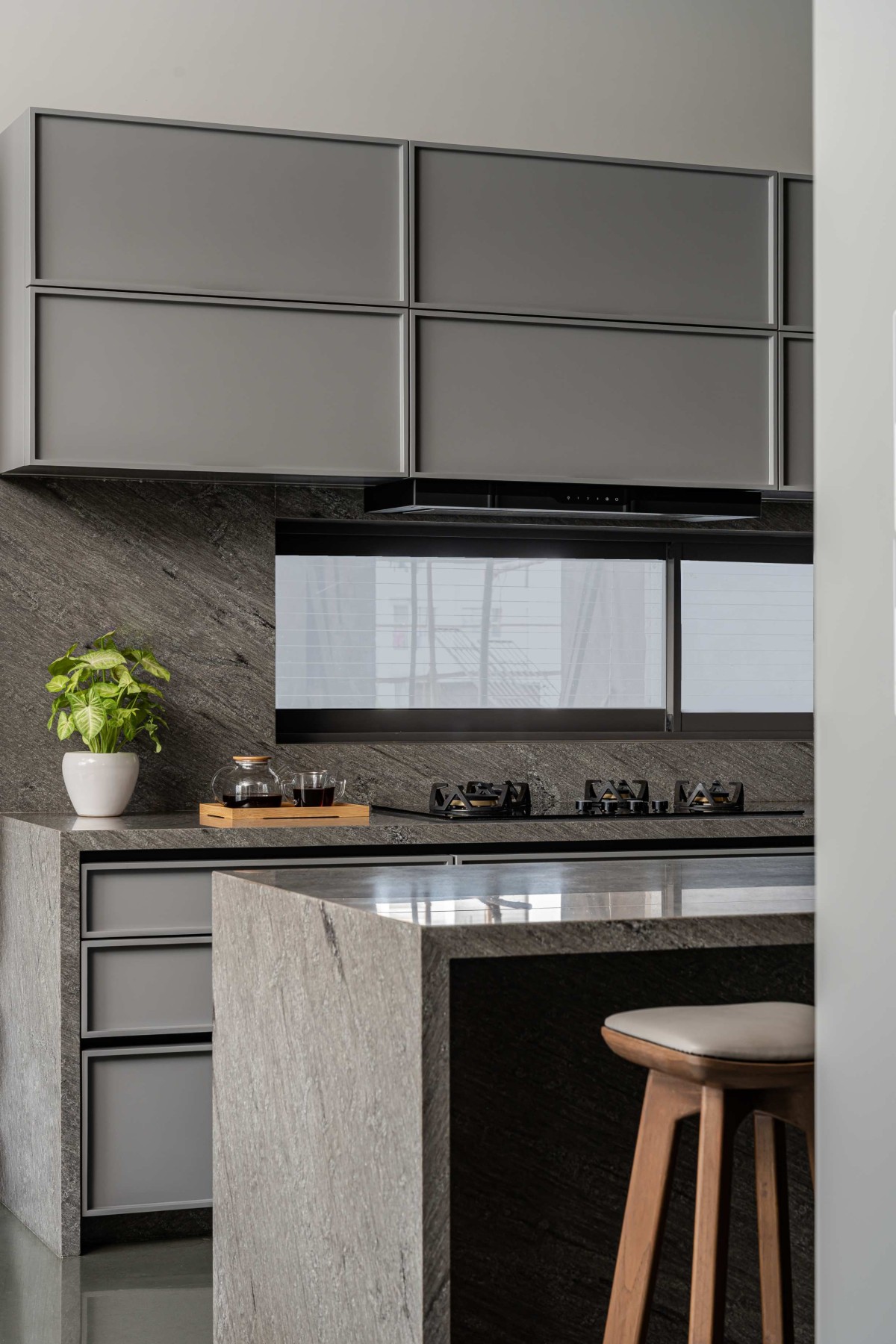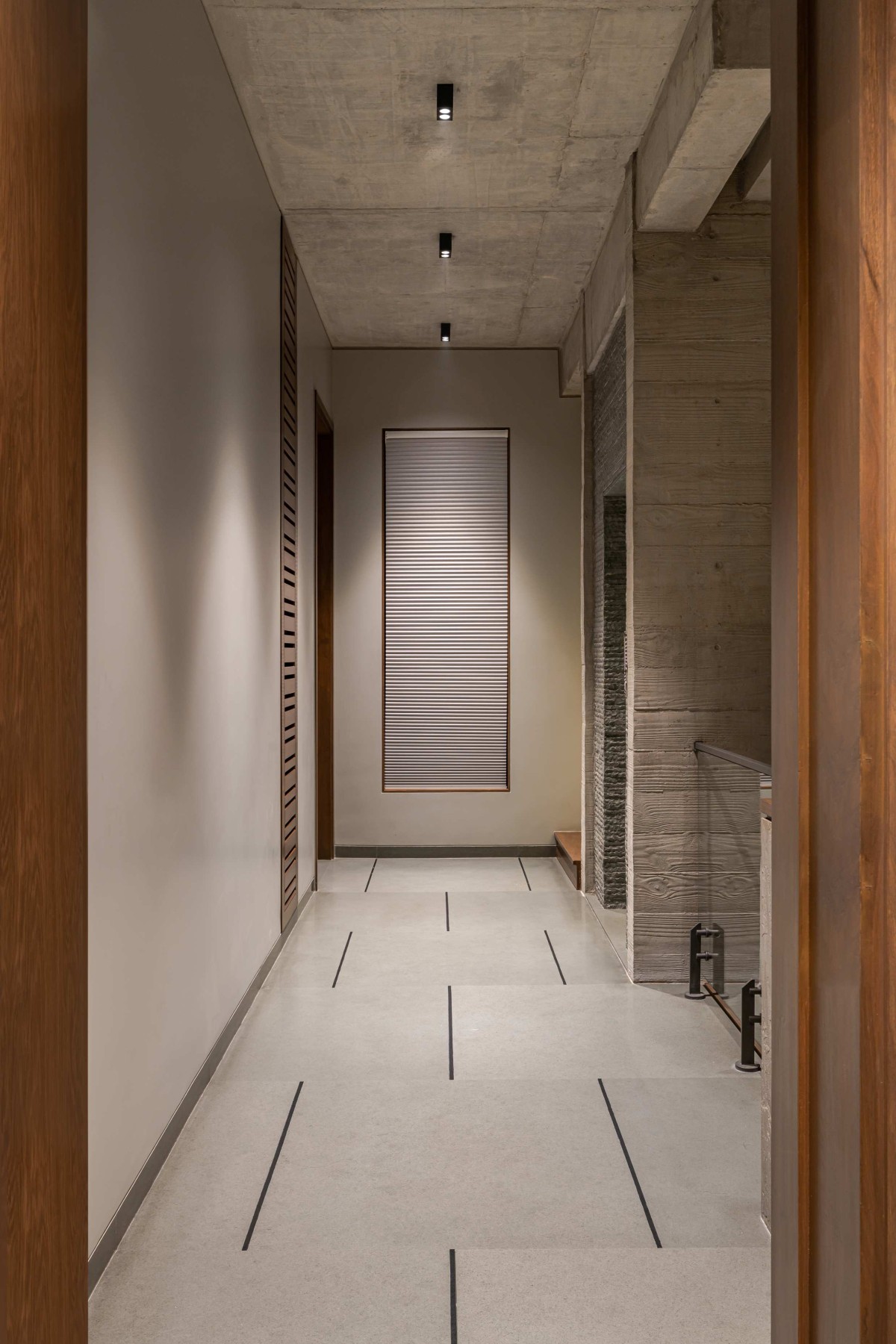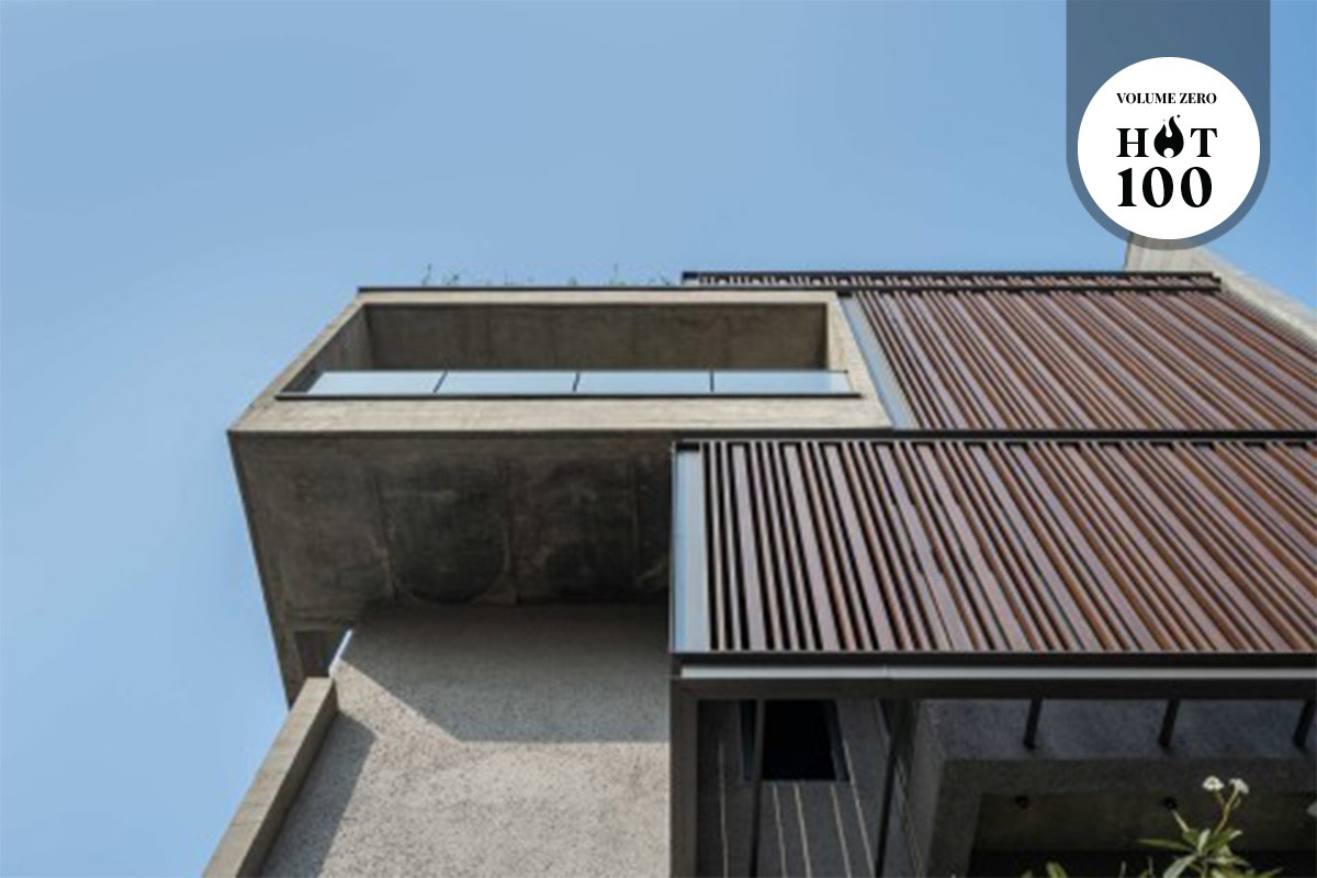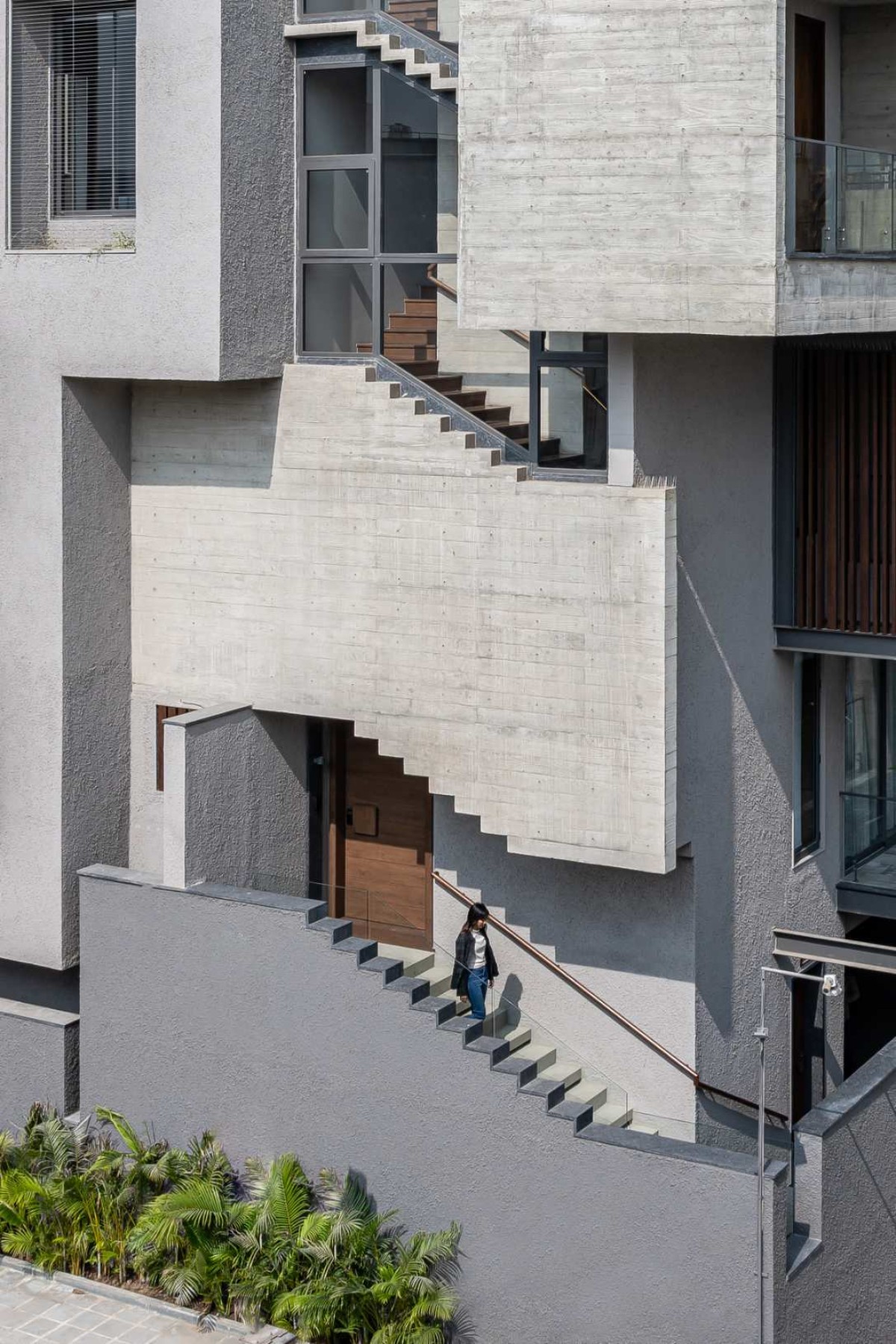 The idea was to design a house which has less carbon footprint and keep the material palette natural and minimal. As you can see it in the façade, there are aluminium baffles given outside 2nd and 3rd floor bedroom windows. It gives a character to the façade and also reduces the view from the surrounding neighbourhood without reducing the window opening as the house is located in a densely populated area.