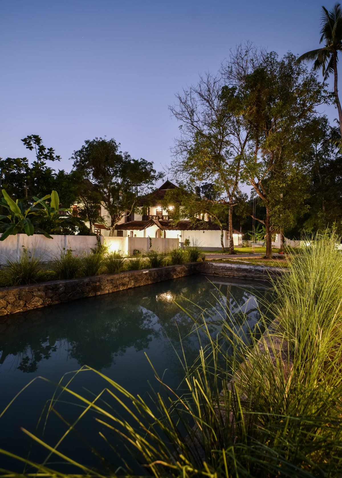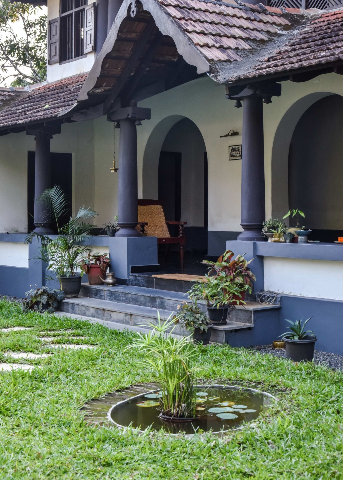 The design intention across the entire home was to maintain the original 200-year-old structure while updating its finishes and enhancing its footprint as inset into the landscape. The oxide flooring was polished, lime wall plasters were restored and repaired, and the timber roof was disassembled and rebuilt, thus addressing water leakage issues on walls and ceilings. The antique furniture with traditional craftsmanship in the attic also complemented the ambience along with the new furnishings sourced from different antique dealers. Besides being a time-consuming process, the bungalow has been successfully conserved into a uniquely warm abode for the intergenerational family that embraces sustainable living.
