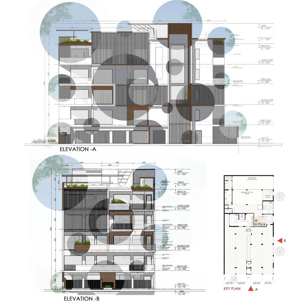 The client is a builder group aiming at creating their footprint in Gurugram with luxurious set of flats. The brief provided by the client required an in depth understanding of real state and seller’s mentality. The building was required to function at different levels – a triplex and subsequent floors. The stilt parking with work from home office, basement and upper ground floor was required to be developed as a triplex whereas the subsequent floors were required to be developed as individual sellout floors. For this, two separate cores were asked to be planned catering to the building requirements.