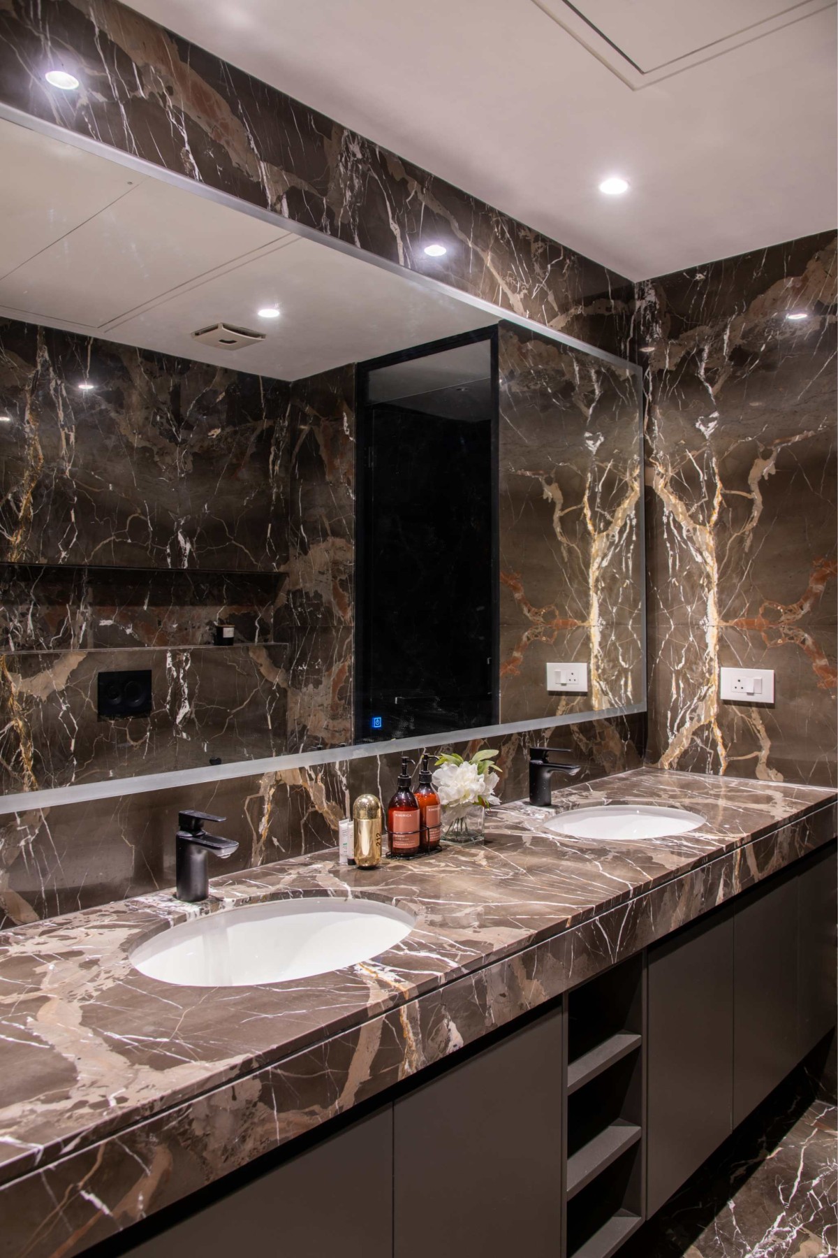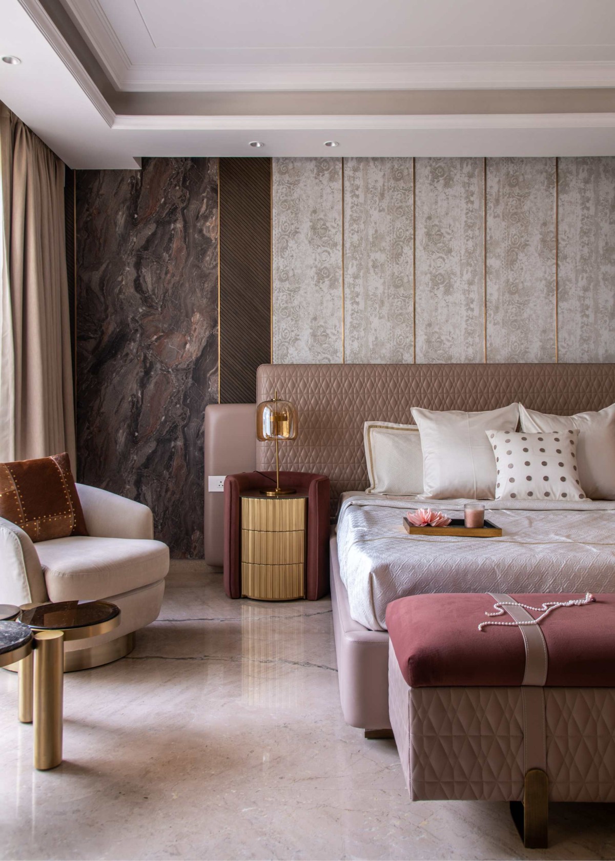 Maangalayam is a luxury builder-floor apartment located in Suncity Gurugram. The building is designed with a deep understanding of the quality and essence of the built environment, with cross ventilation and natural lighting, along with grandeur and luxury. The vertical zoning of the building has been conceptualized to have a harmonious equilibrium of single and double-height spaces, thereby creating a sense of grandeur and an element of surprise throughout the space. The horizontal zoning has been done in a manner so as to have accessible balconies from all the spaces in the building and a good cumulation of private and public spaces. Keeping the client’s input and requirements in consideration, the design has been developed as a set of 4BHK flats and a triplex consisting of the stilt, a basement and the upper ground floor. There are two different cores running as per the vertical zoning of the building, catering to the triplex and the subsequent floors respectively.