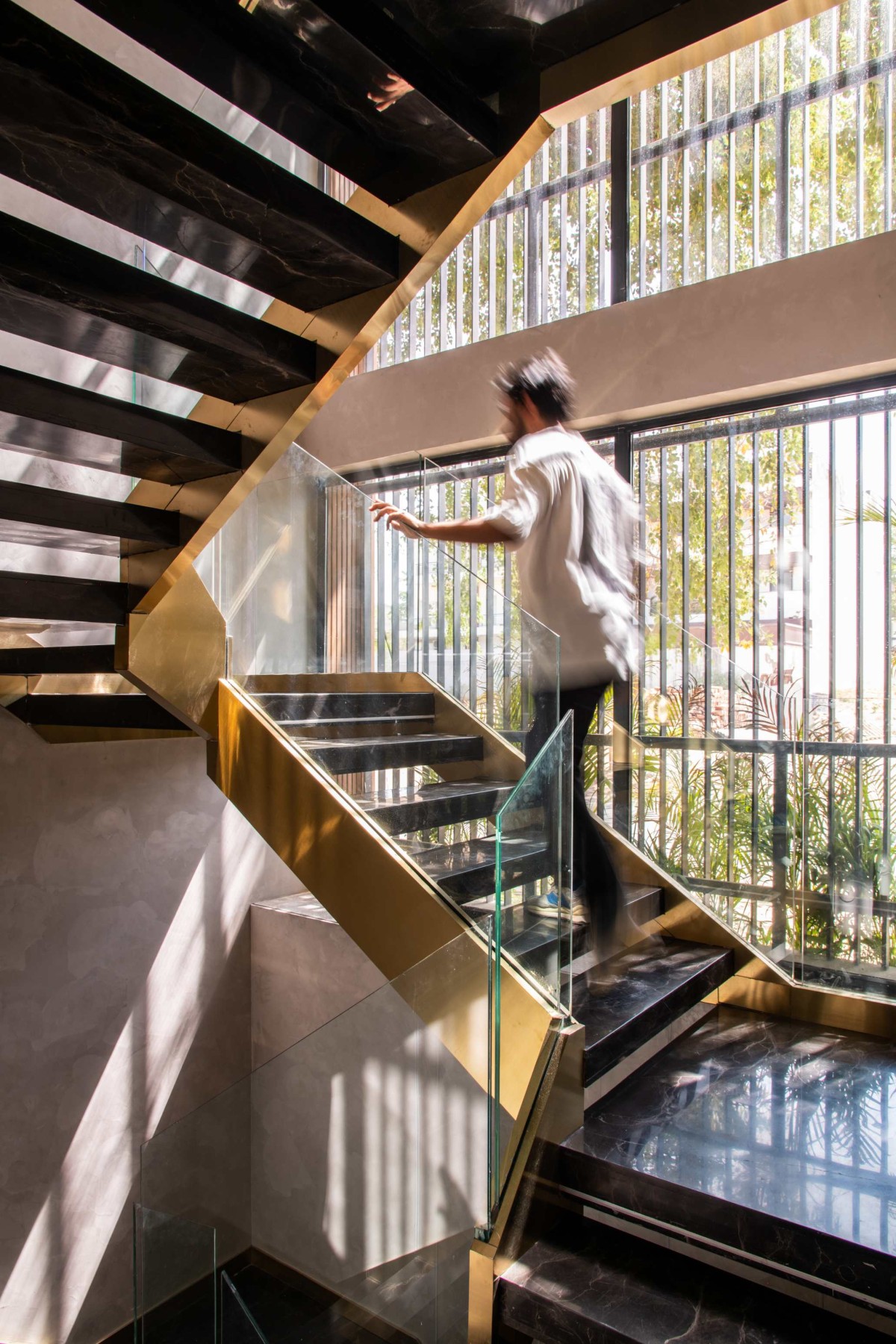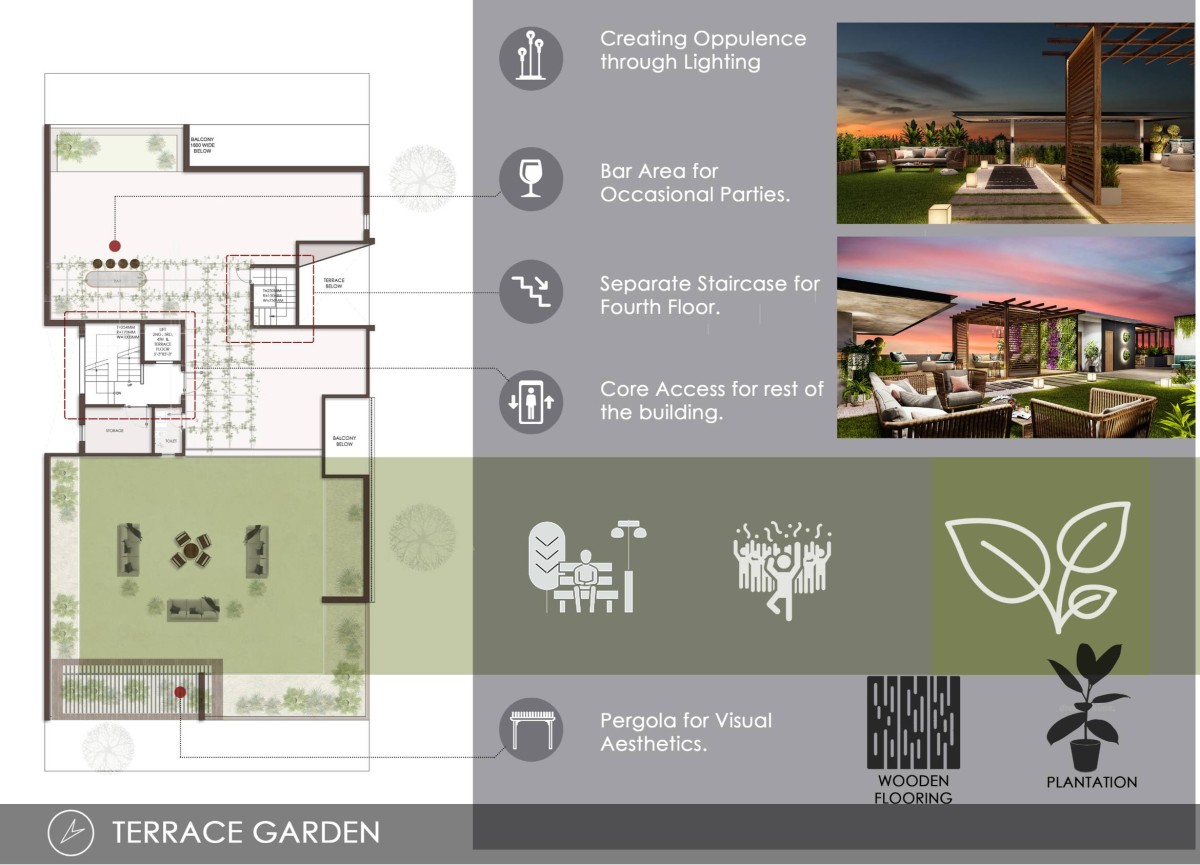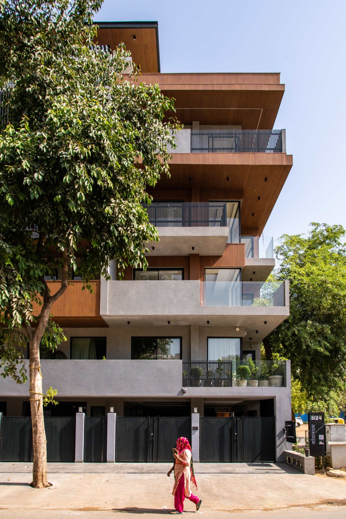 The brief demanded each floor to be planned as a 4BHK flat with powder and a servant room having good special connectivity. For each floor, a separate parking facility for three cars on the stilt floor was required to be developed. The client was very clear in stating that they need luxurious look and feel in each space of the building in terms of the materials and the color schemes. This was essential in designing the elevation keeping in the contextual relevance of Gurugram in mind.