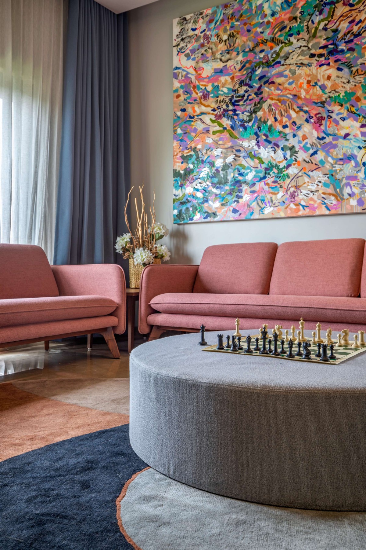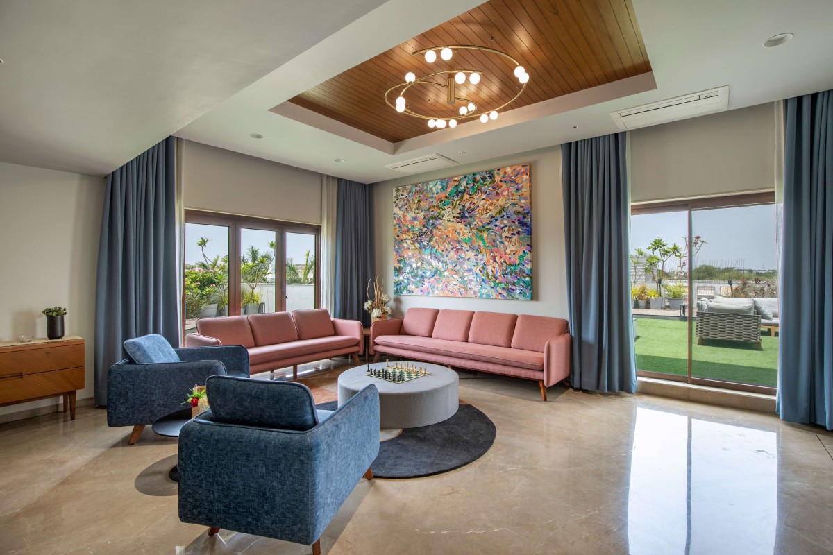 There is a special lounge on the terrace floor, which occupies part of the terrace. With its tall glass walls and pitched roof, the lounge area represents a perfect reinterpretation of French architecture. With a marriage of intimate indoors and great outdoors, this platform fosters social interactions. The beautiful blue and blush pink couches and a spiral chandelier add charm to this area. With large works of art displayed beside concrete walls, the spaces evoke an art gallery-like aesthetic.