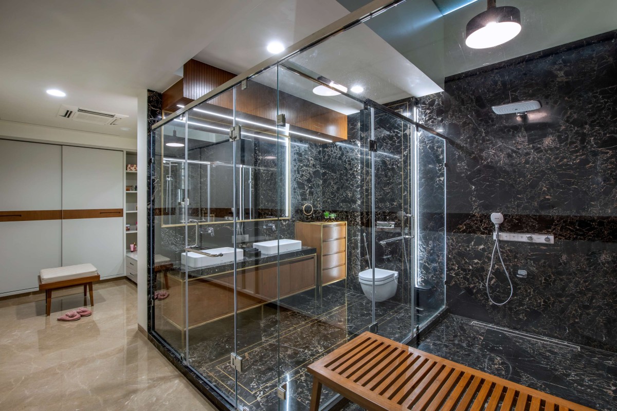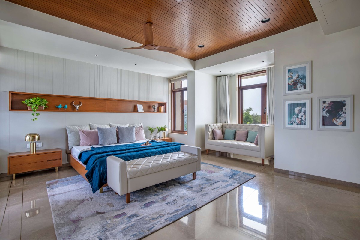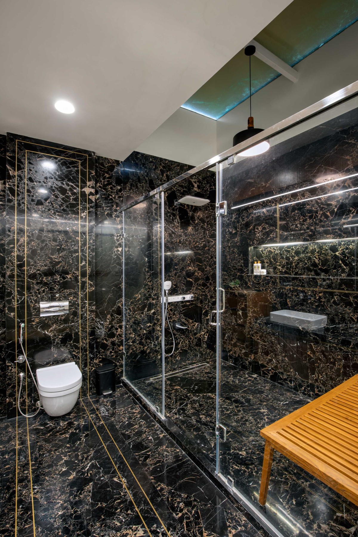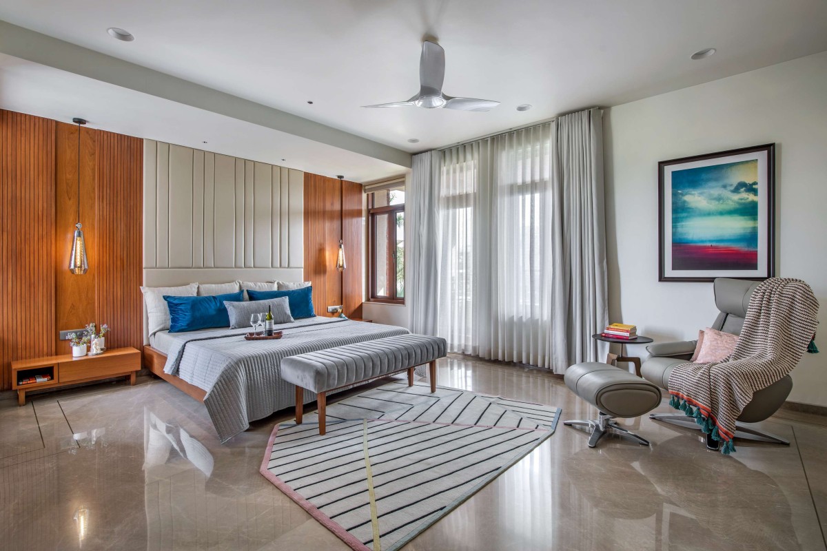 Perfectly separating the private and semi-private space within the Master Bedroom speaks of grace and grandeur, all the while keeping it simple and subtle…and yet, significant! Whites, neutrals, and grey undertones form the base palette for the bedrooms juxtaposed with wooden niche, PU finished panelling, deep hardwood accents seen on the ceiling and select walls. The bathrooms manifest pattern-rich spaces rendered by marble stone veining and complemented by a black Italian marble counter with brass inlay. A brass finished framing in vanity, large glass shower cubicle, wooden cabinetry, and eclectic lighting enhance the space and brings a soft playfulness. The theme of the brother’s bedroom is kept modern with clean lines, minimal design elements, and the use of a selective material-color palette. The room has been highlighted by continuing wooden finish pattern and upholstered back panelling.