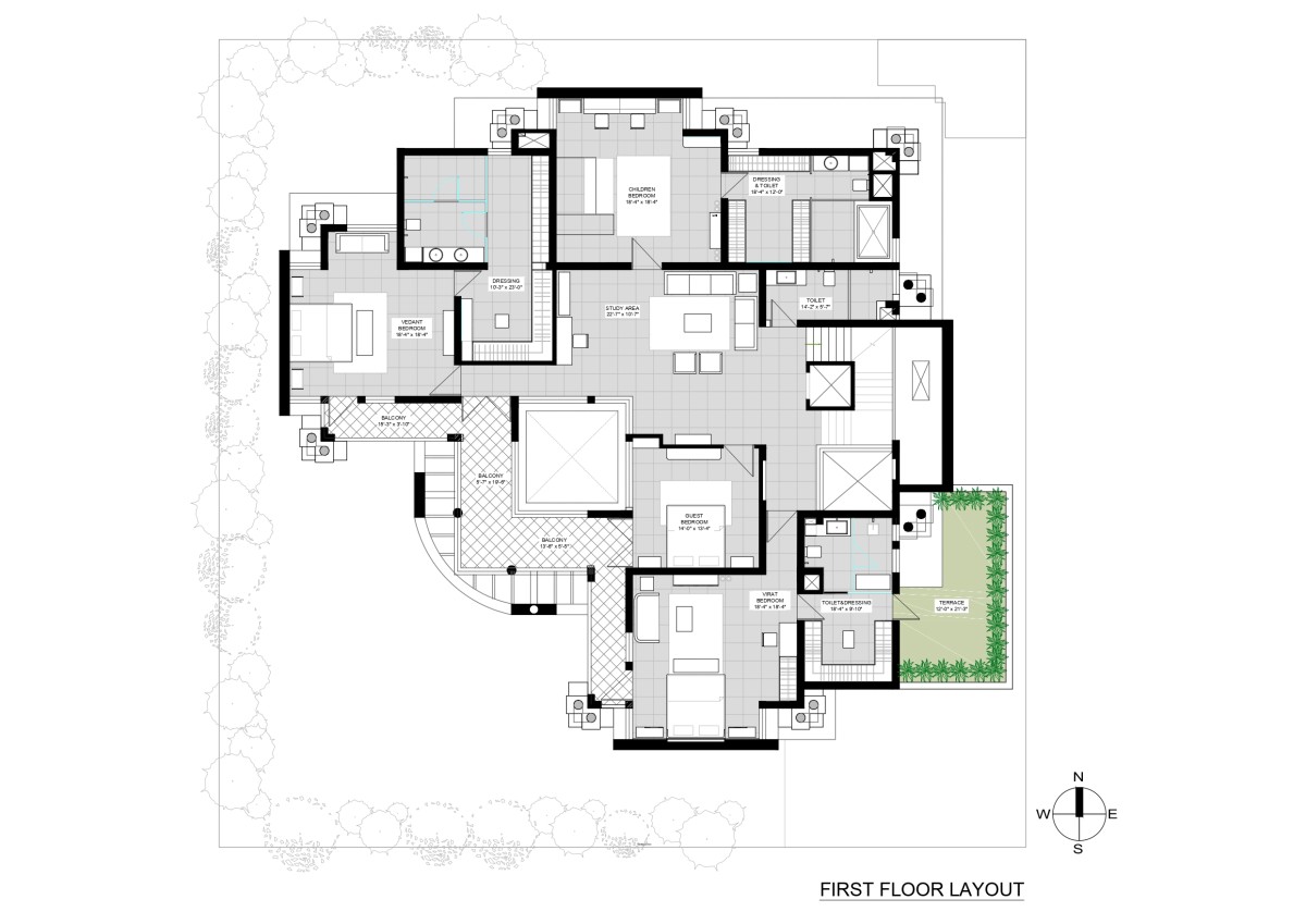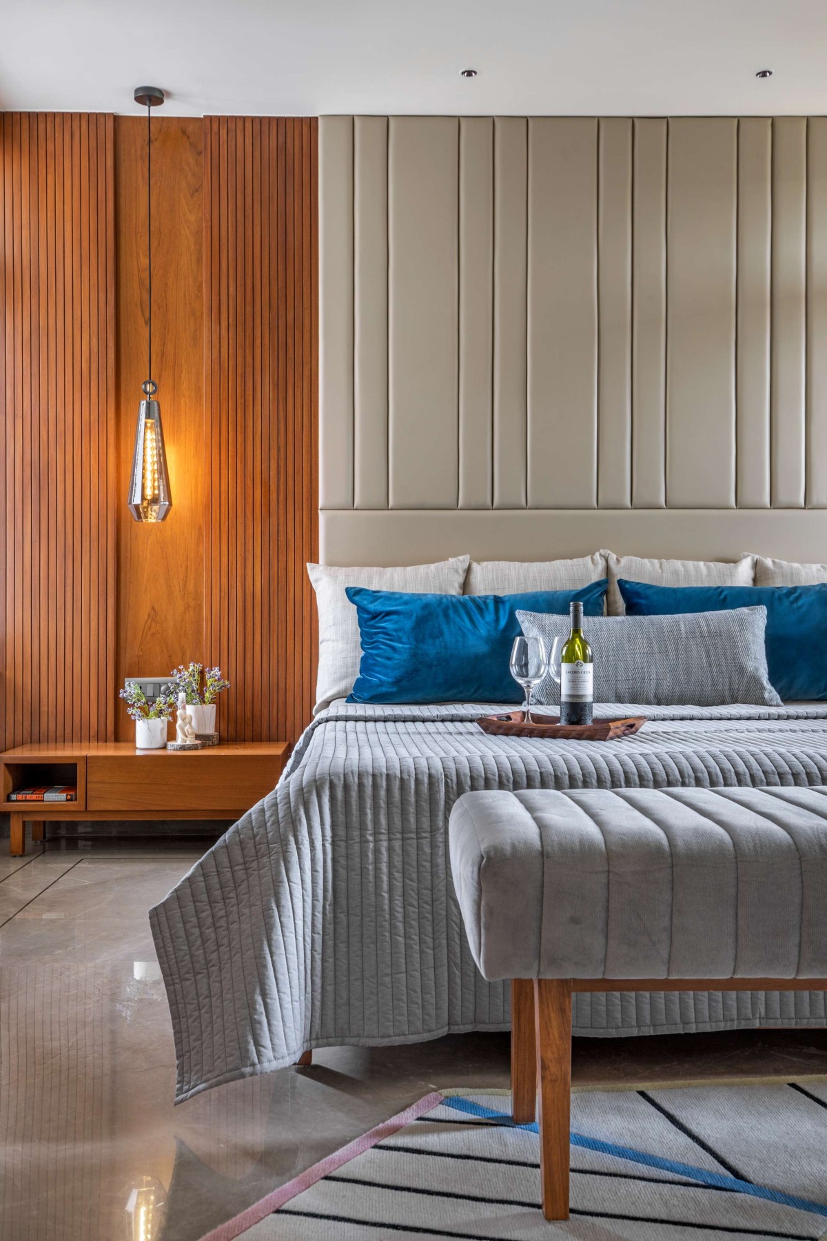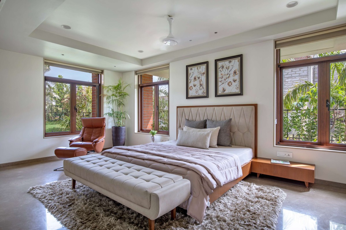 Perfectly separating the private and semi-private space within the Master Bedroom speaks of grace and grandeur, all the while keeping it simple and subtle…and yet, significant! Whites, neutrals, and grey undertones form the base palette for the bedrooms juxtaposed with wooden niche, PU finished panelling, deep hardwood accents seen on the ceiling and select walls. The bathrooms manifest pattern-rich spaces rendered by marble stone veining and complemented by a black Italian marble counter with brass inlay. A brass finished framing in vanity, large glass shower cubicle, wooden cabinetry, and eclectic lighting enhance the space and brings a soft playfulness. The theme of the brother’s bedroom is kept modern with clean lines, minimal design elements, and the use of a selective material-color palette. The room has been highlighted by continuing wooden finish pattern and upholstered back panelling.