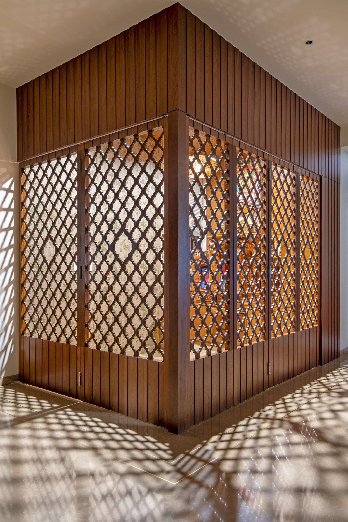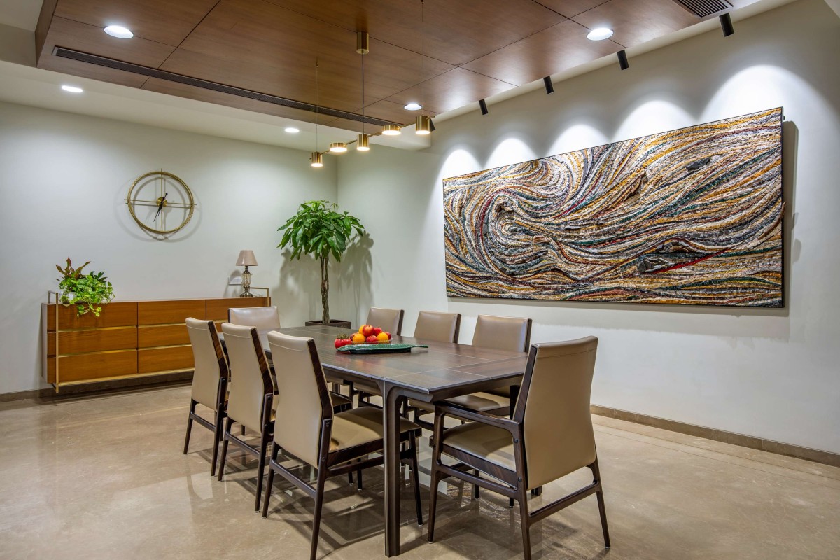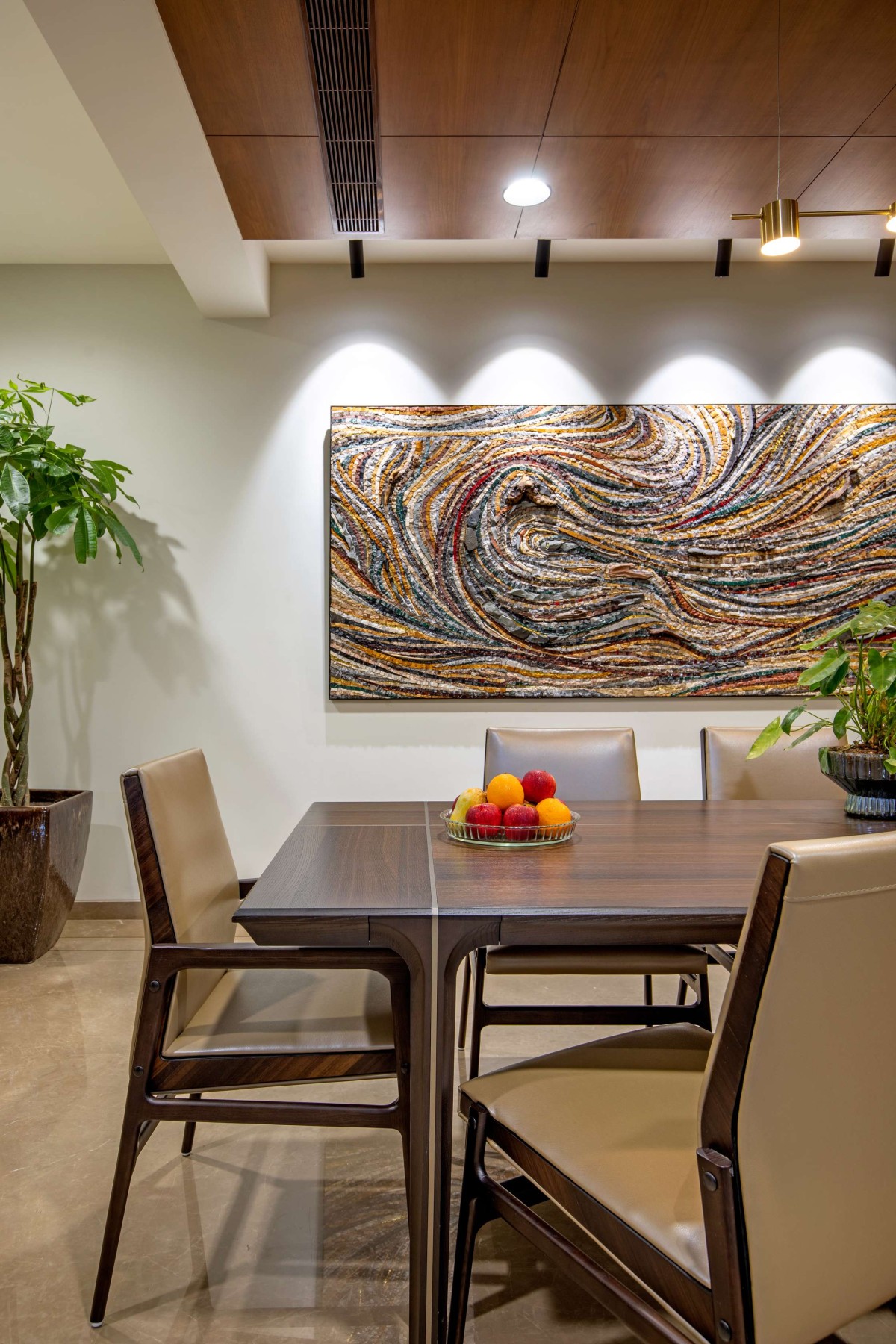 The vibrant wood accent TV unit adds a splash of colour and warmth to the otherwise monochrome design adding briskness to the space. The veneer used on the walls of the passage gives the impression of solid wood and ties the colour palette together. A secluded yet eye-catching camouflage in the passage with a small mandir highlights a dramatic and striking feature of the whole house whilst skillfully balancing the subtlety. Since the client entertains often, the dining space is designed to be soothing and calming as well as warm and welcoming. The dining space is just as functional as aesthetic, wherein wooden and brass crockery cabinets create ample storage while adding to the beauty of the space. The wooden ceiling and pendant lights over the eight-seater wooden dining are both elegant and functional. But what arouses curiosity to the senses as one enjoys the culinary delights is the beautiful wall art portrait.