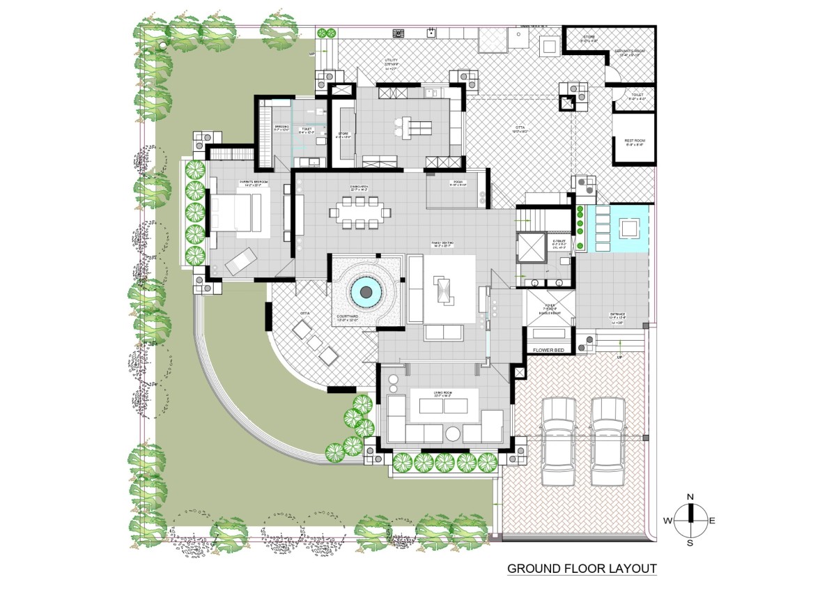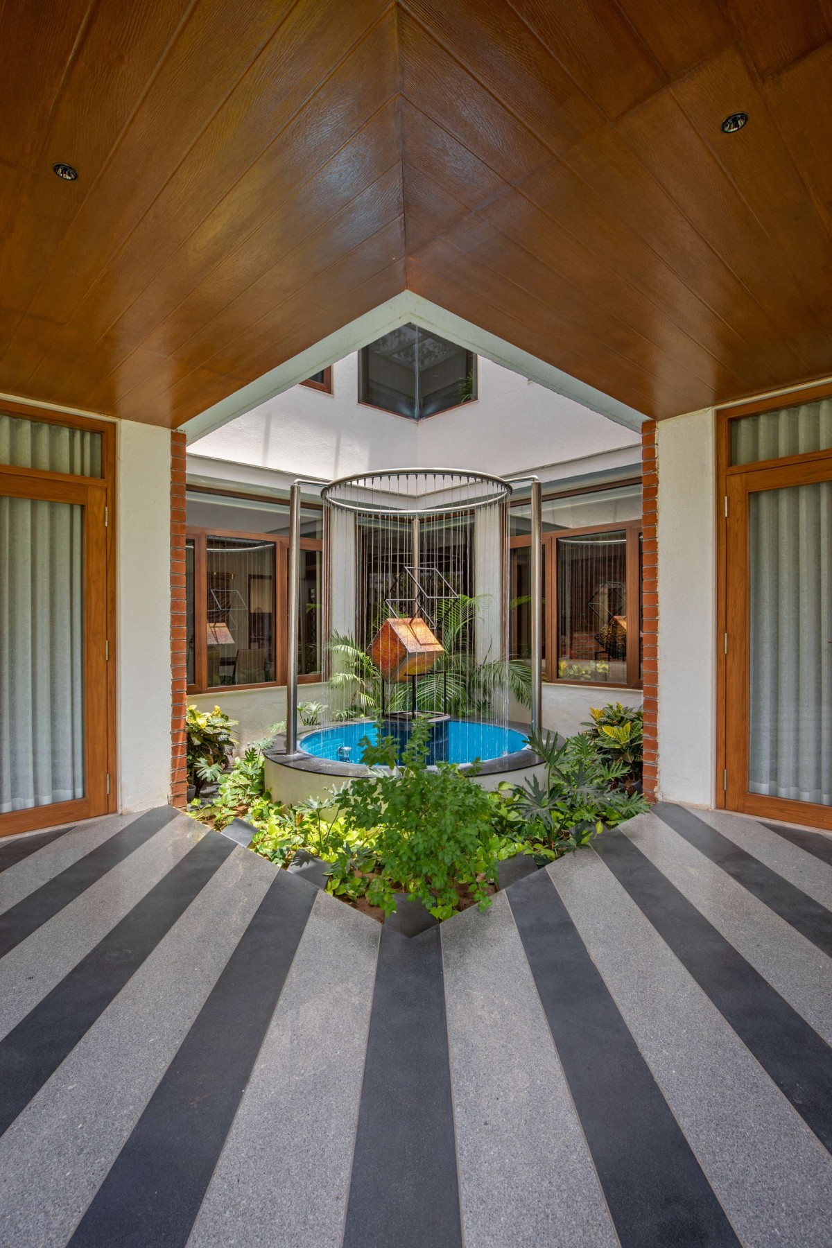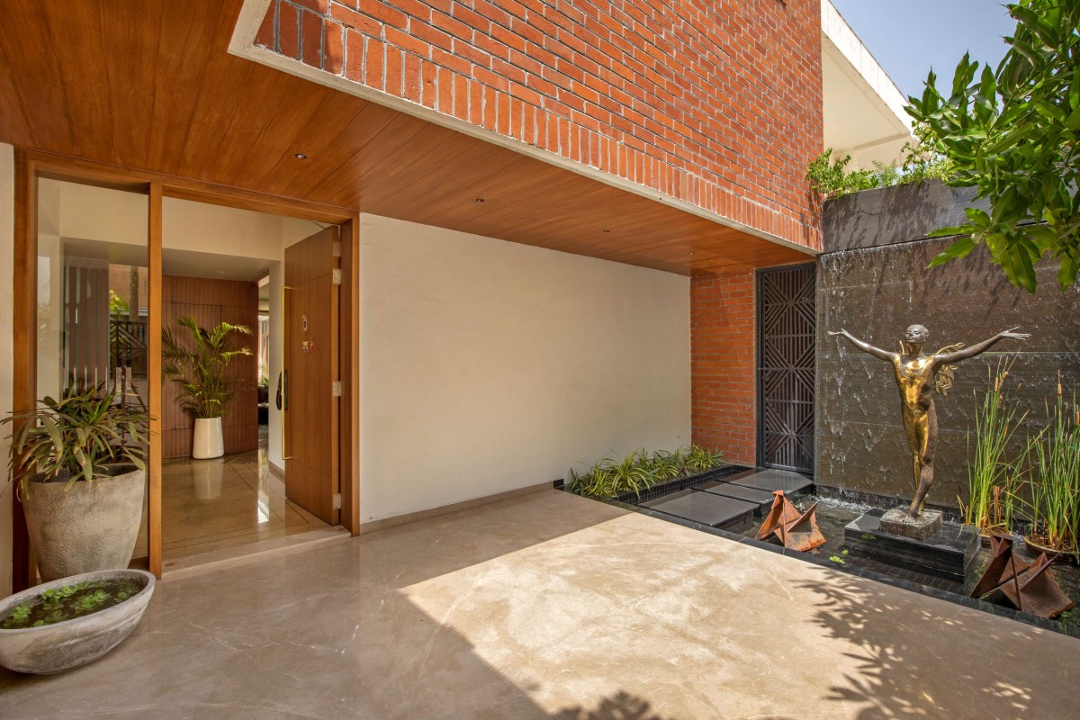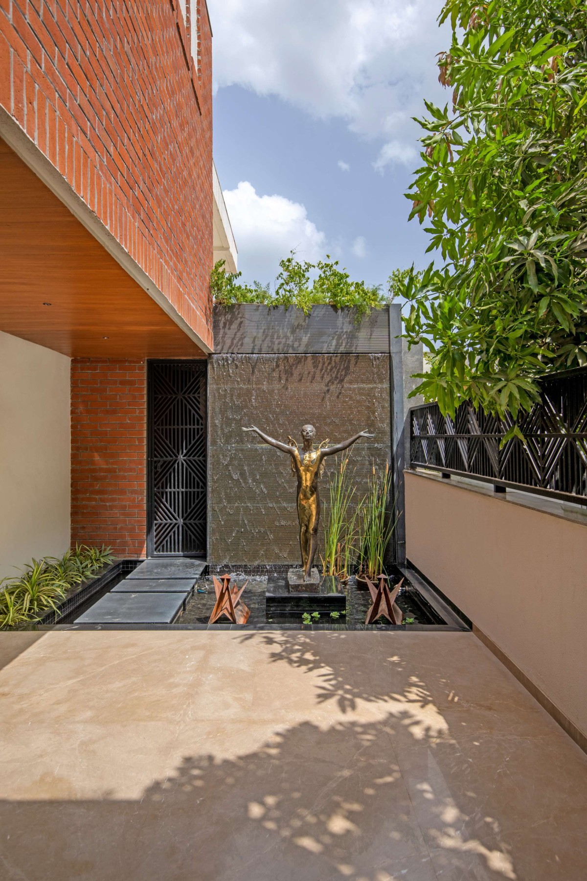 In the entrance of the house is the pièce de résistance of the project, giving one quite an invitation into the house and setting the tone for the rest of the architectural design. A beautiful angel sculpture by sculptor Asish Das, with an artfully crafted waterbody infuses into the composition, distributing hints of elegance, charm, and artistry. Entering into a sky-lit court with a generously canopied tree planter the house pitches itself for a perfect welcome.