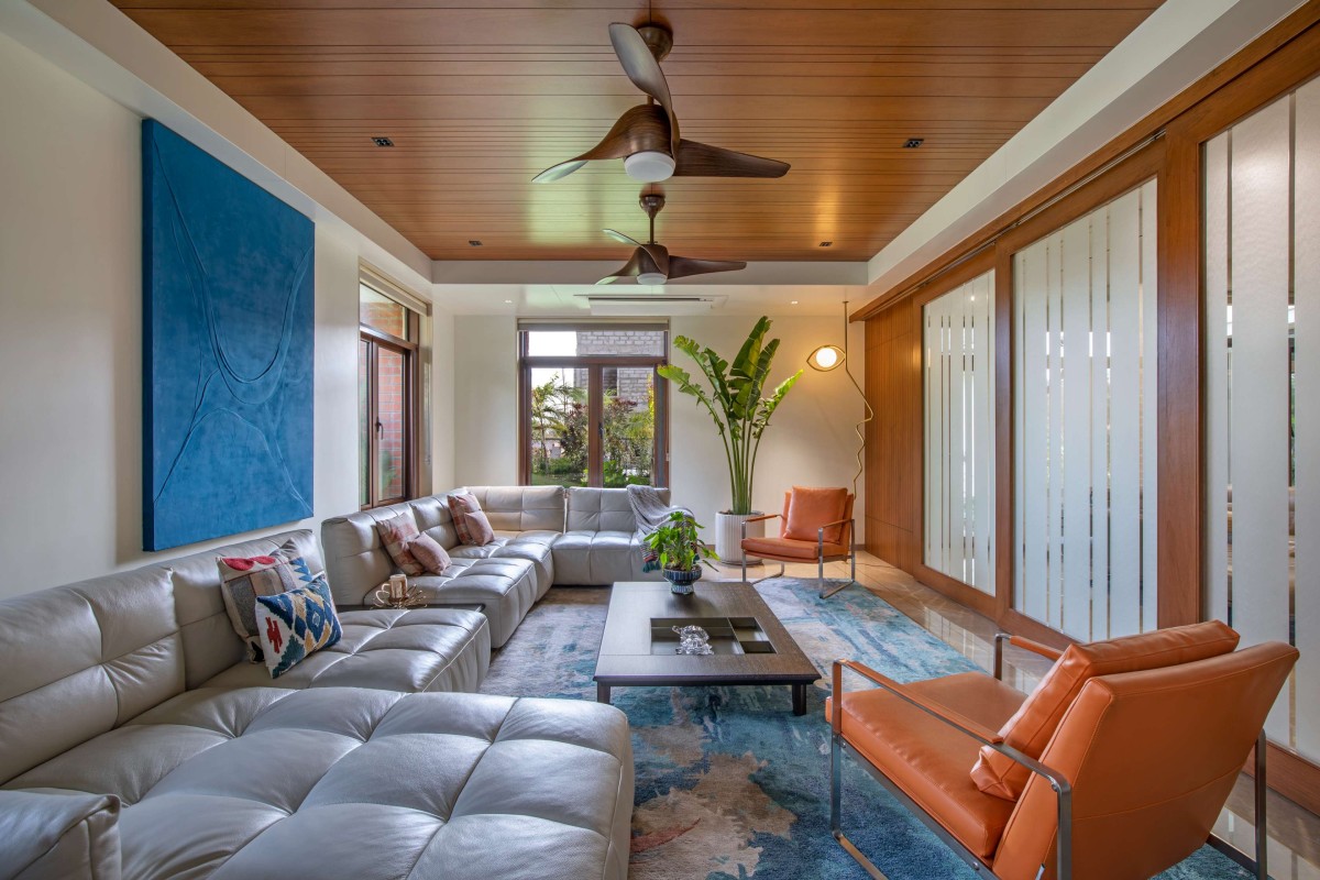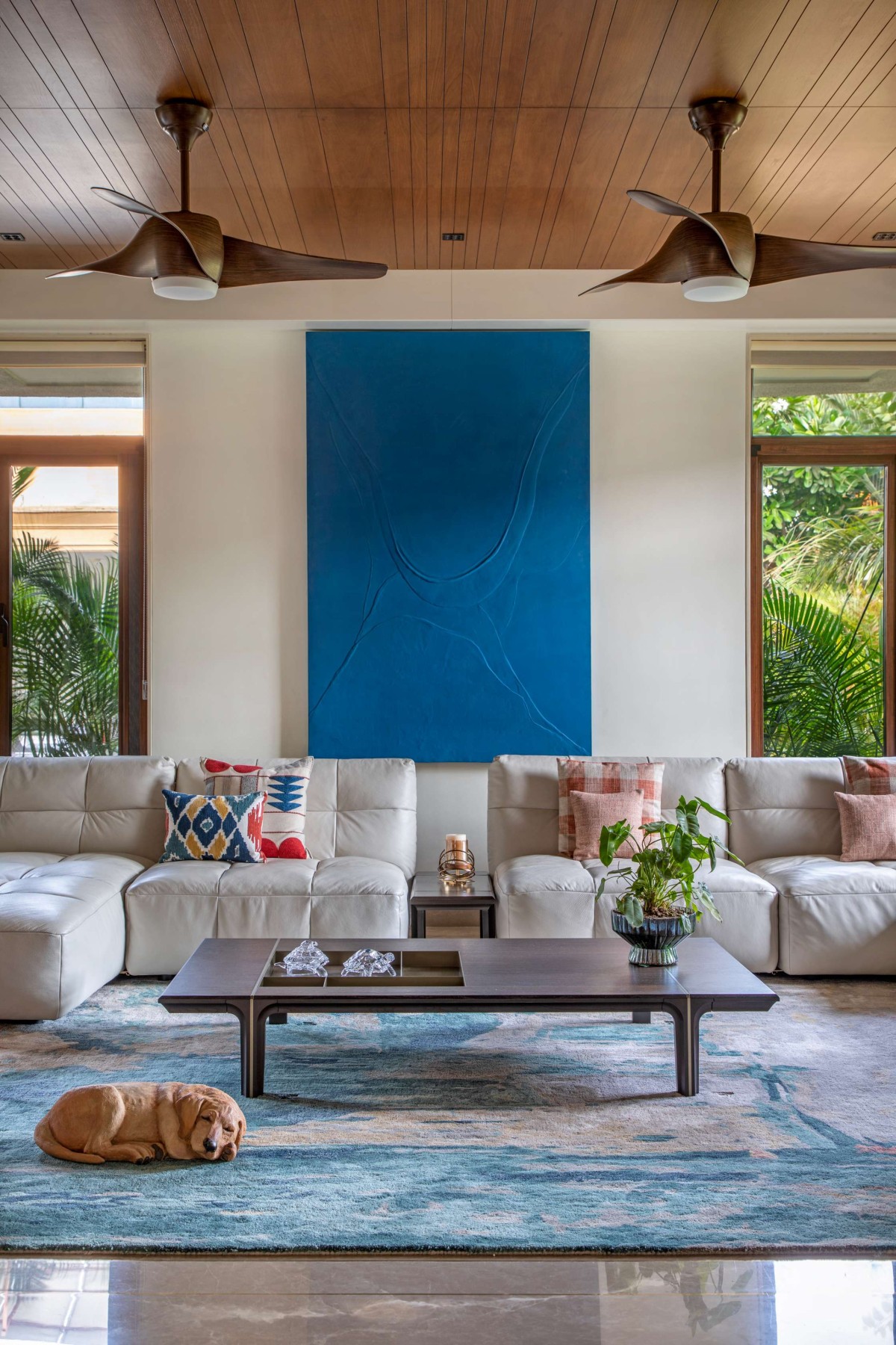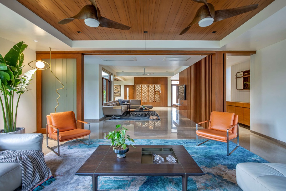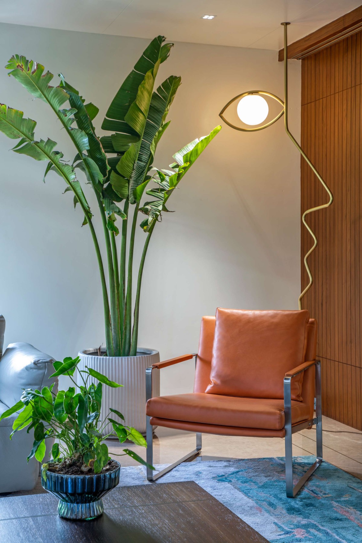 There is a seamless flow between the living room, family seating area, and dining area. The open floor plan creates a welcoming atmosphere and makes it easier to move between the spaces. To create spaces that flow into each other cohesively, the formal living room has been transformed into an open plan. Wooden ceiling as an element is used to create a space that is elegant as well as classic in nature. Subtle furniture elements coupled with marvelous garden elements create a sophisticated as well as elegant interior space. A stunning brass finish eye shape lamp is the highlight accent piece for the space. Bespoke furniture, attention to detail, and a couple of stand-out pieces such as the eye-shaped lamp endow the space with a warm and welcoming vibe.