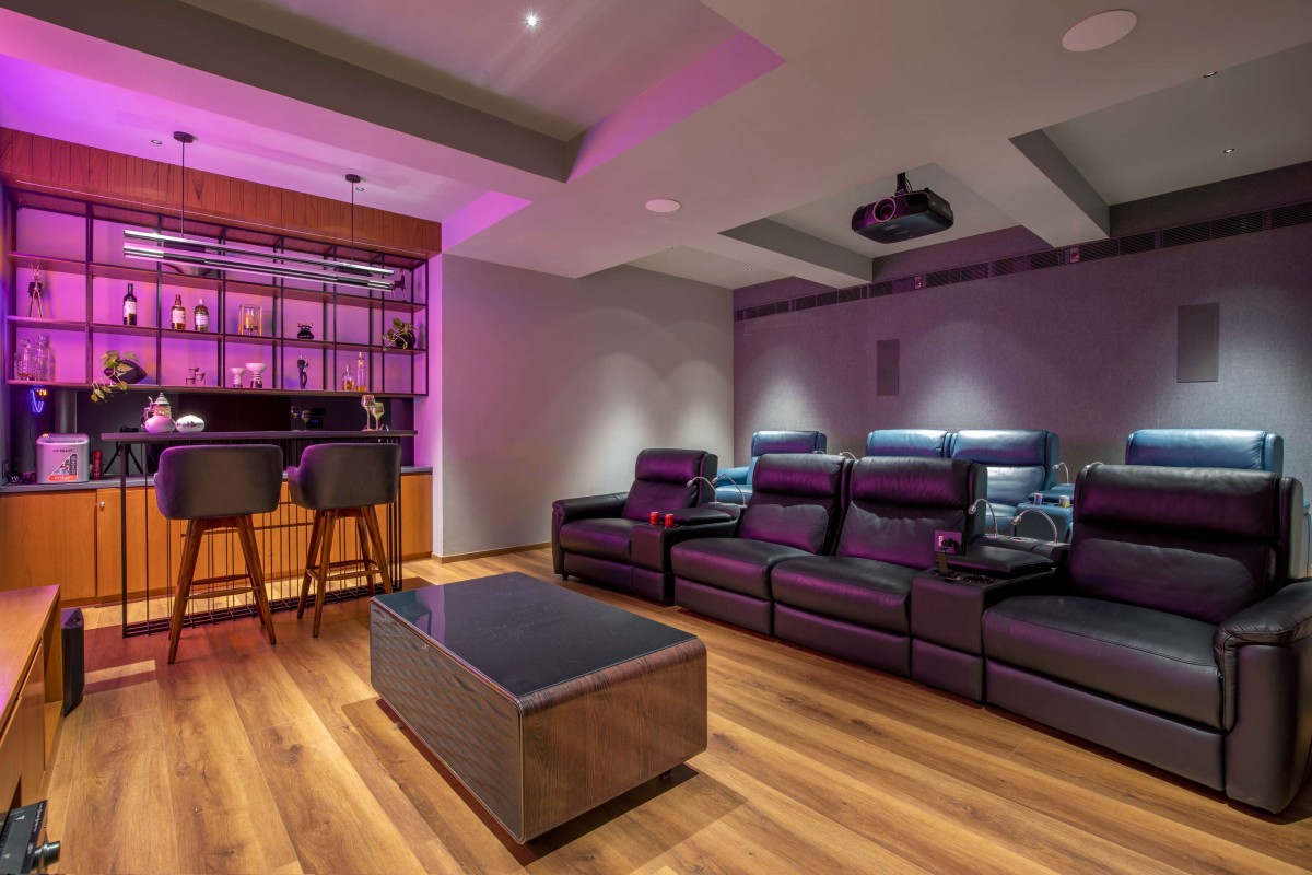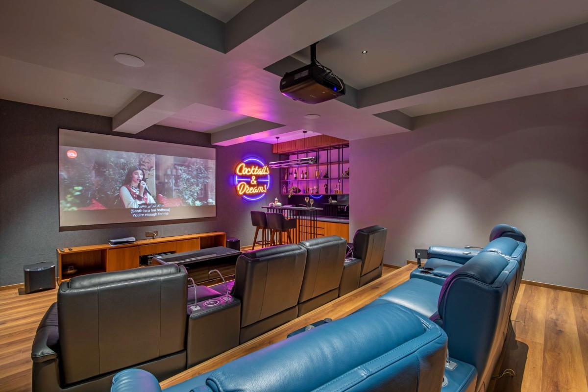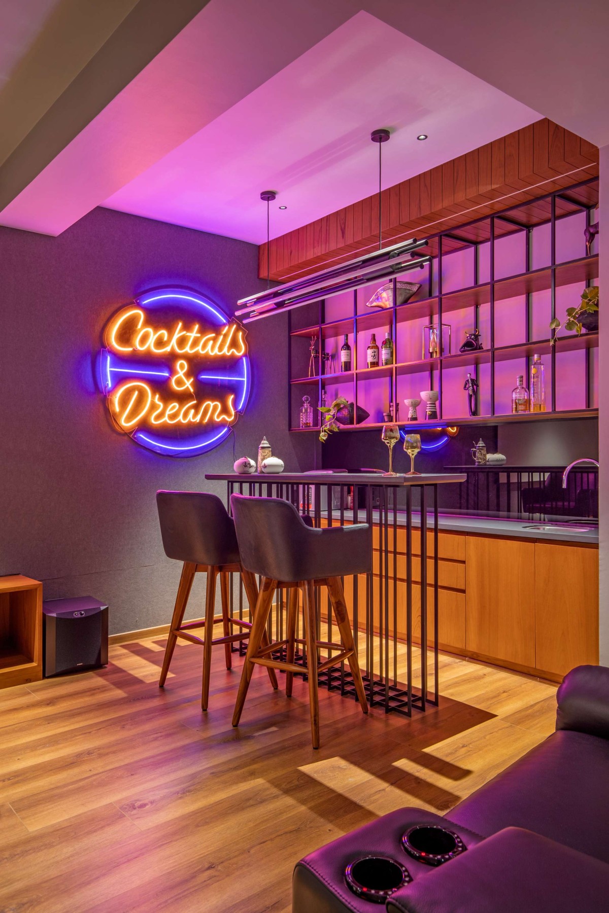 The entertainment room on the second floor is an exciting space to step in. The wooden flooring and acoustic panel on the wall are aesthetically pleasing and also cater to the acoustic requirements as it cuts off the noise. The black and blue lounge chairs elevate the mood making it look lively. As far as bar areas go, this one stands out as a complete stunner. In addition to its placement next to the entertainment screen, it also has a "RAW" appeal. The bar table is cast out of the stone top and metal framing and the bar unit is in Veneer finish and Metal frame – niches. The LED installation of ‘Cocktails and Dreams’ in the backdrop adds glory to the bar.