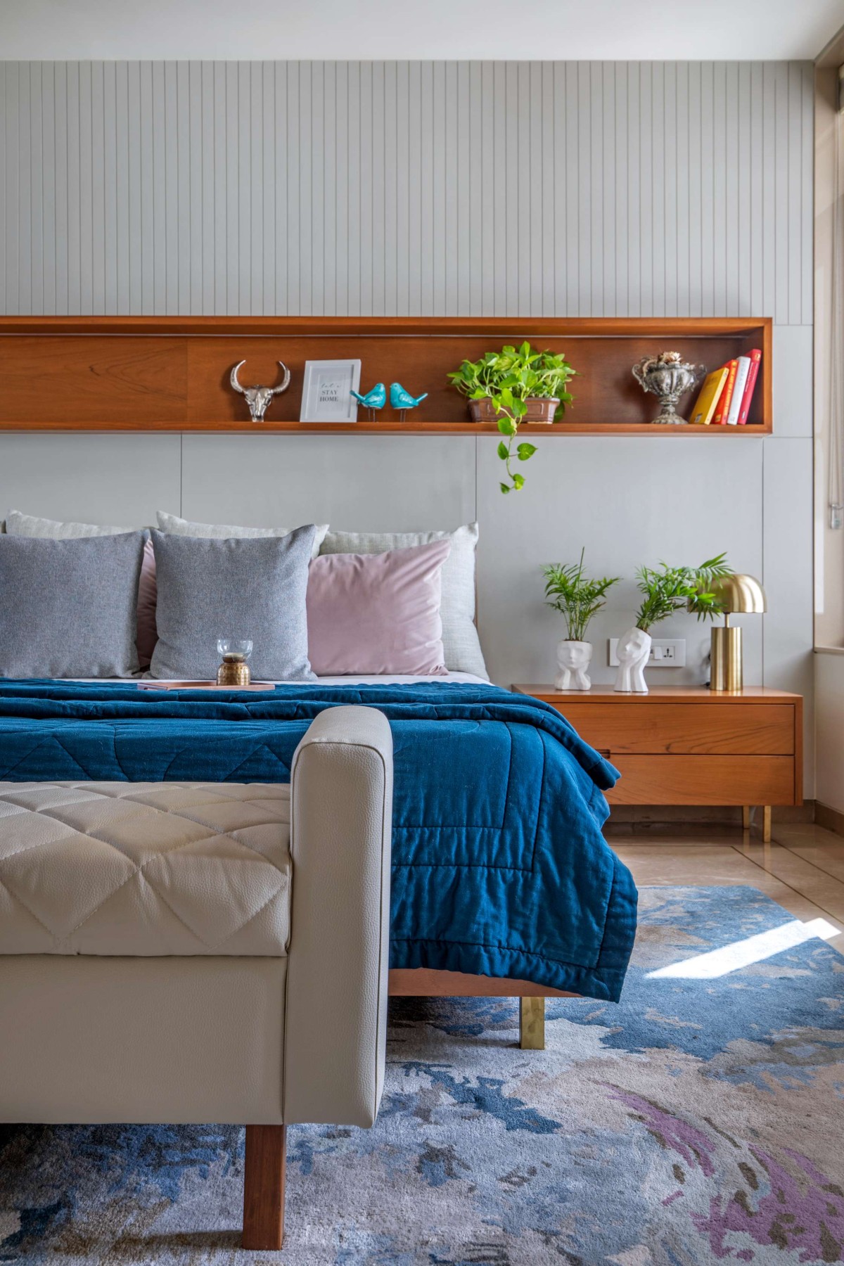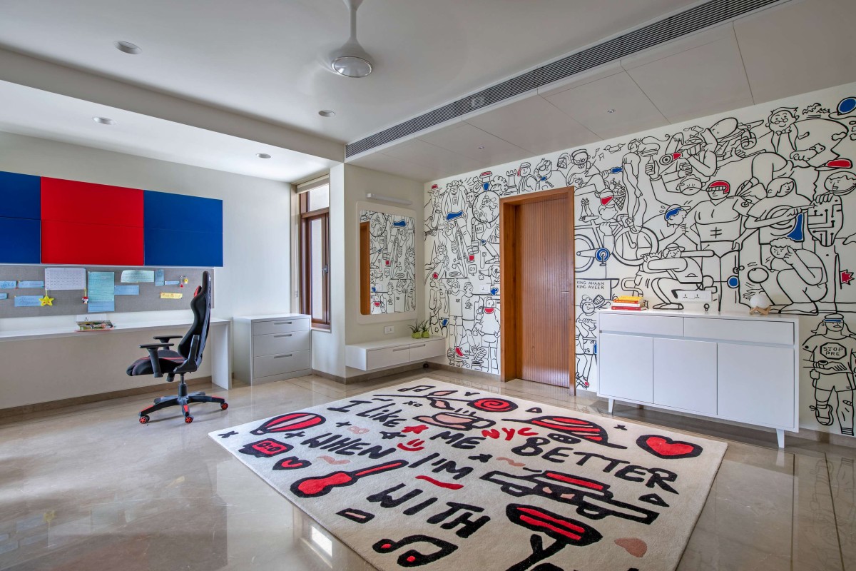 The material palette of the children’s room takes an interesting turn as it consists of a hand-painted wall mural, an artistic rug, and a colourful study corner. Flamboyant mural art is crafted on the wall. The colour scheme is a bit dramatic due to the play of bold blue, black, red, and smoky greys. The study desk is in vibrant blue and red which merges with the overall theme of the room.