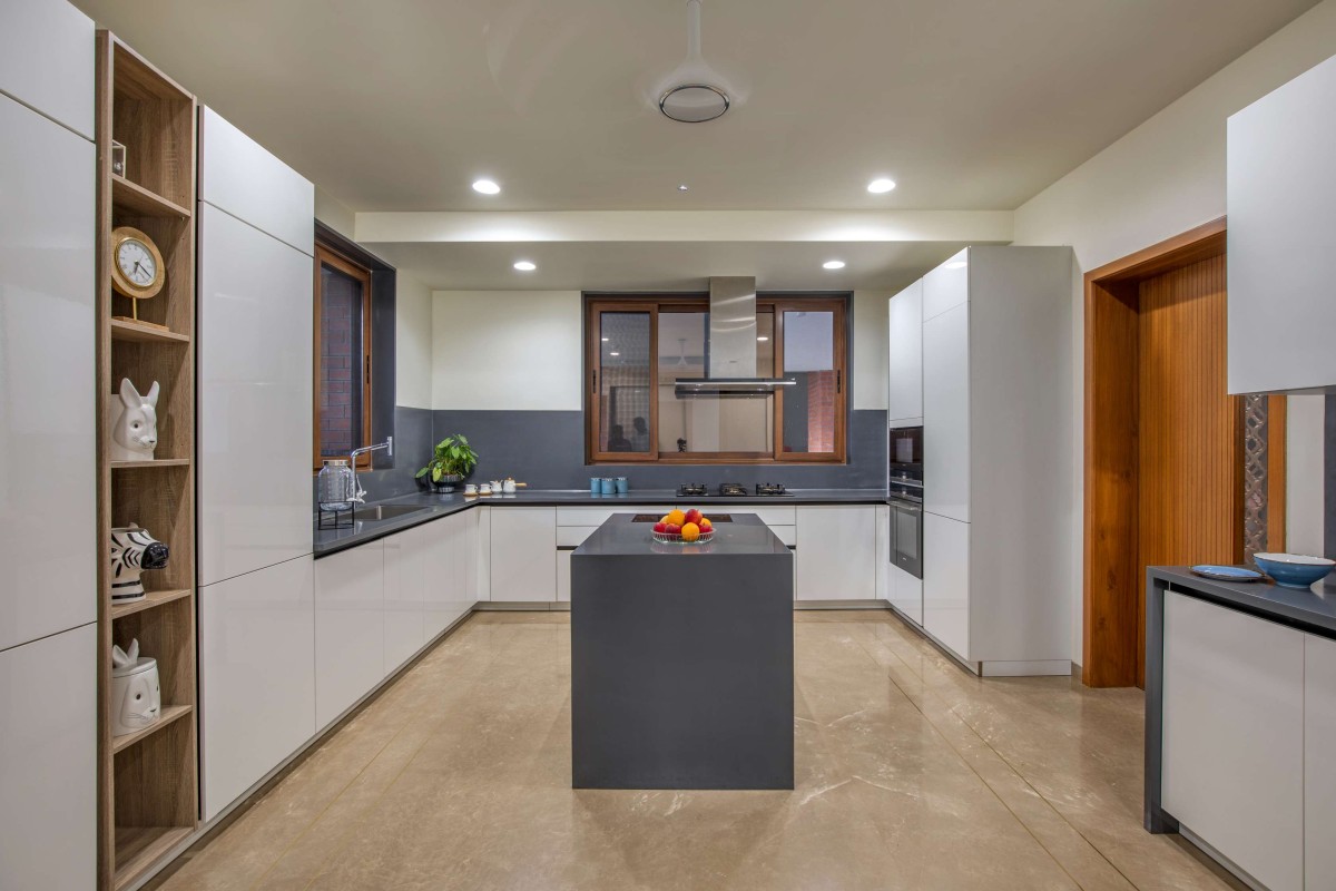 A classic modular kitchen by Nolte - Decoart with a gorgeous island counter and light ambience on the ceiling accentuates the elegance and the overall appeal of the kitchen area. Stunning finishes, an open display cabinet, and an admirable color palette add up to it, making it look clean and sunny. The transitional spaces in between, like the courtyard, are not ignored from the intervention rather it is emphasized by a breathtaking fountain by Outline Studios.