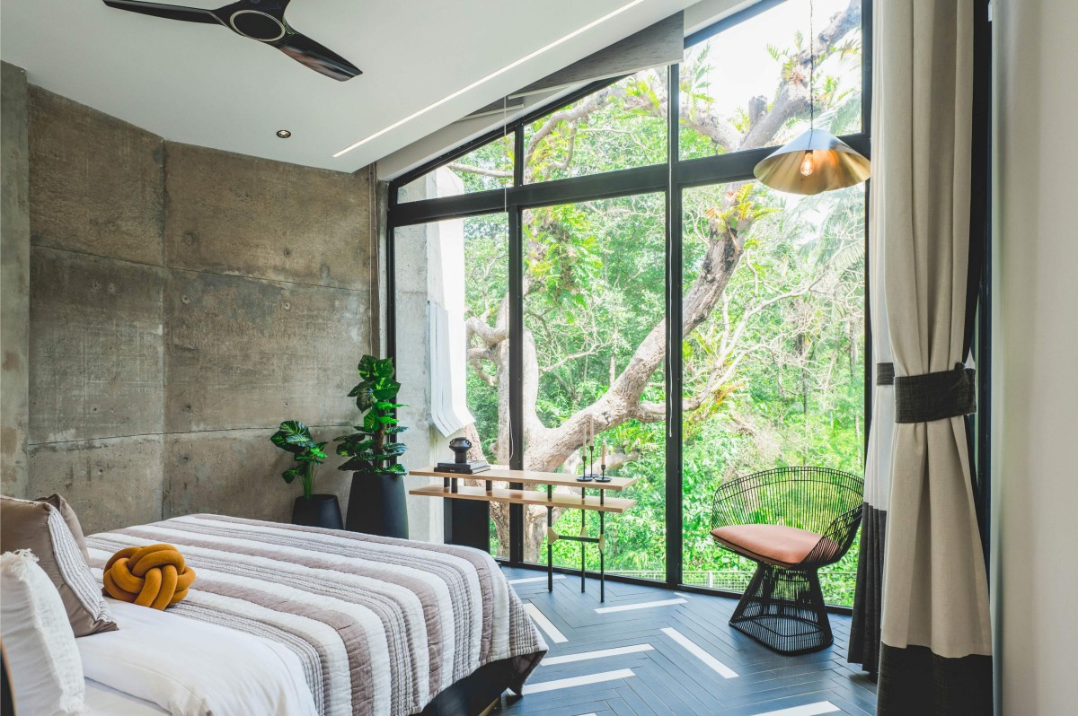 In the four-bedroom configuration, one bedroom on the ground floor boasts a private landscape and an outdoor bath, while the others on the first floor offer panoramic views of the jungle through large framed windows. This layout ensures a serene and relaxing atmosphere within the villa.