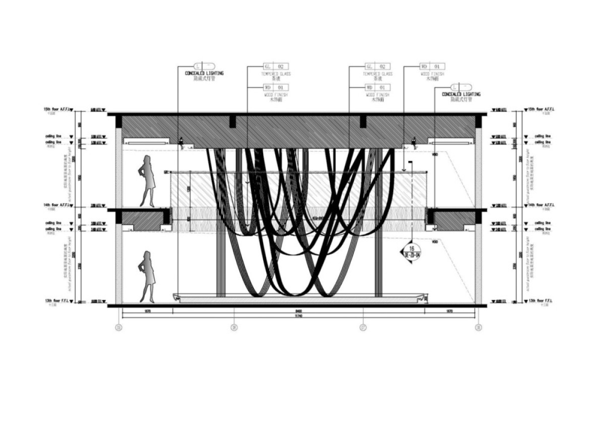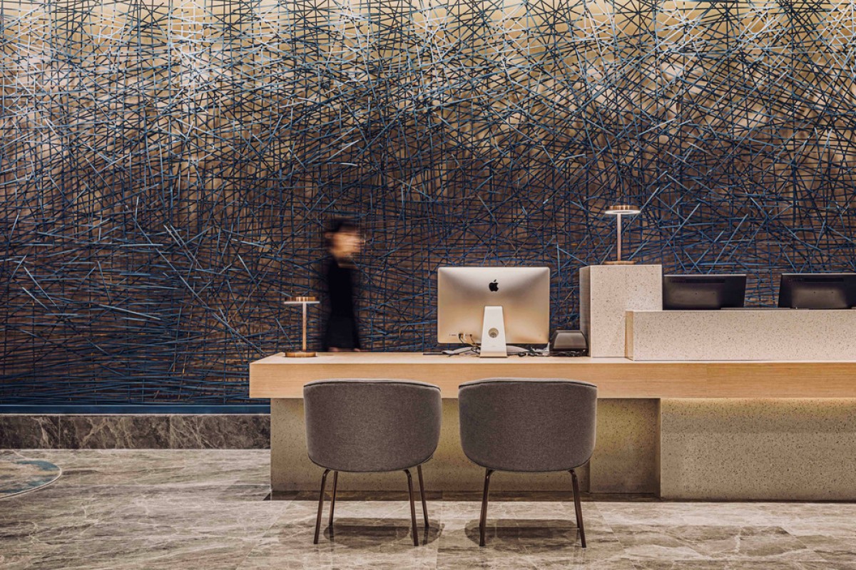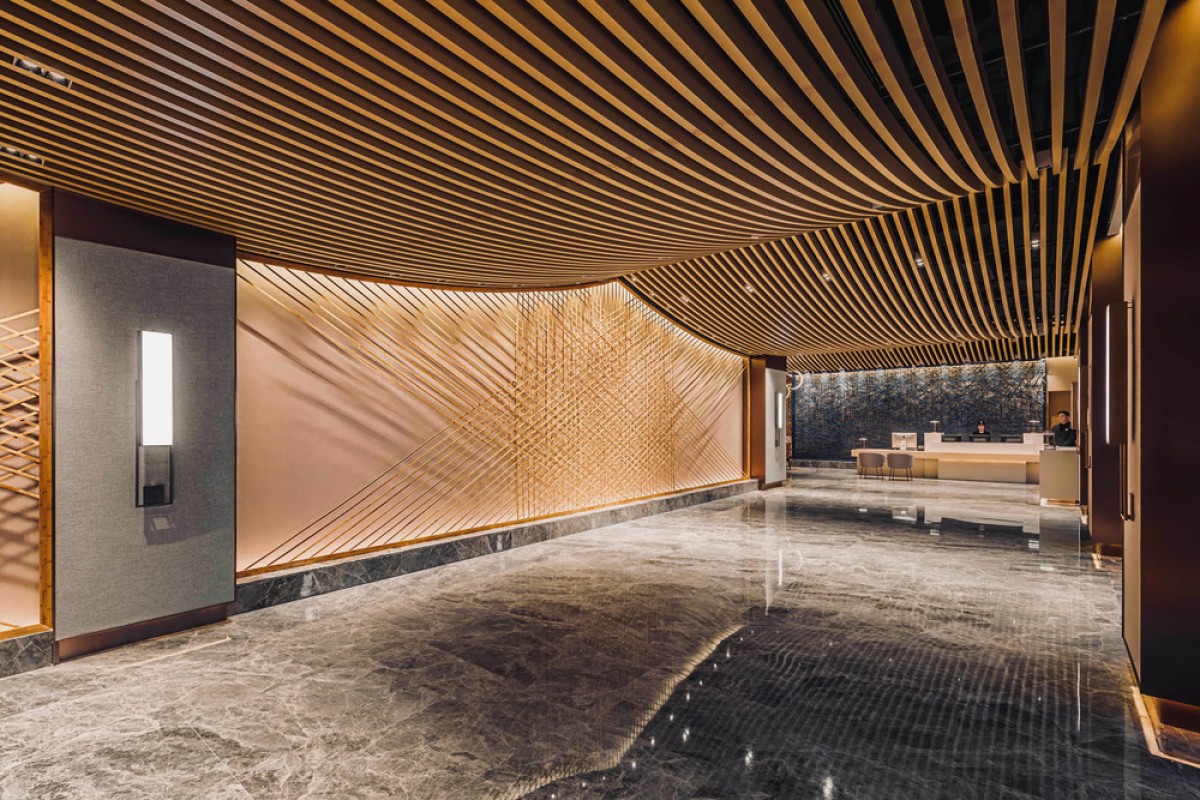 Double height central courtyards were introduced on every two guest-room floors. A reflective lake with a bamboo installation of dancing curves falls naturally, as if clouds are floating in the air. This ceiling-hung structure, produced in consultation with bamboo masters, is curved by making use of its natural elasticity and traditional connection method. Guests will experience the feeling of passing through an abstract bamboo forest before arriving at their rooms.