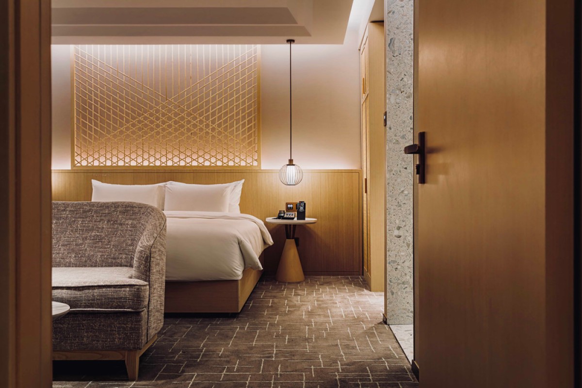 The bamboo and rattan applied to all guestroom headboards are in the same pattern as those in the lobby, but with different dimensions and thickness. Floated by concealed lights, it aims to provide guests with a peaceful environment and an elegant atmosphere.