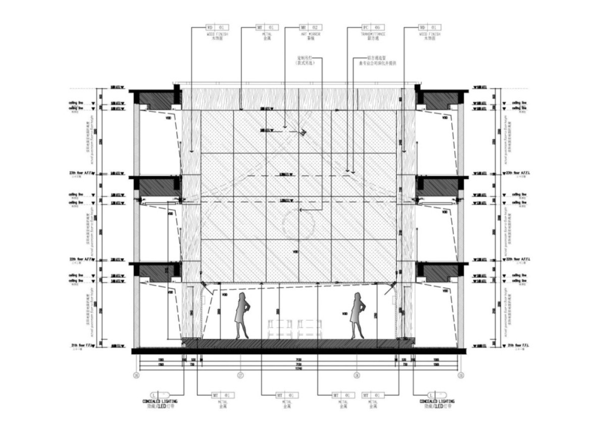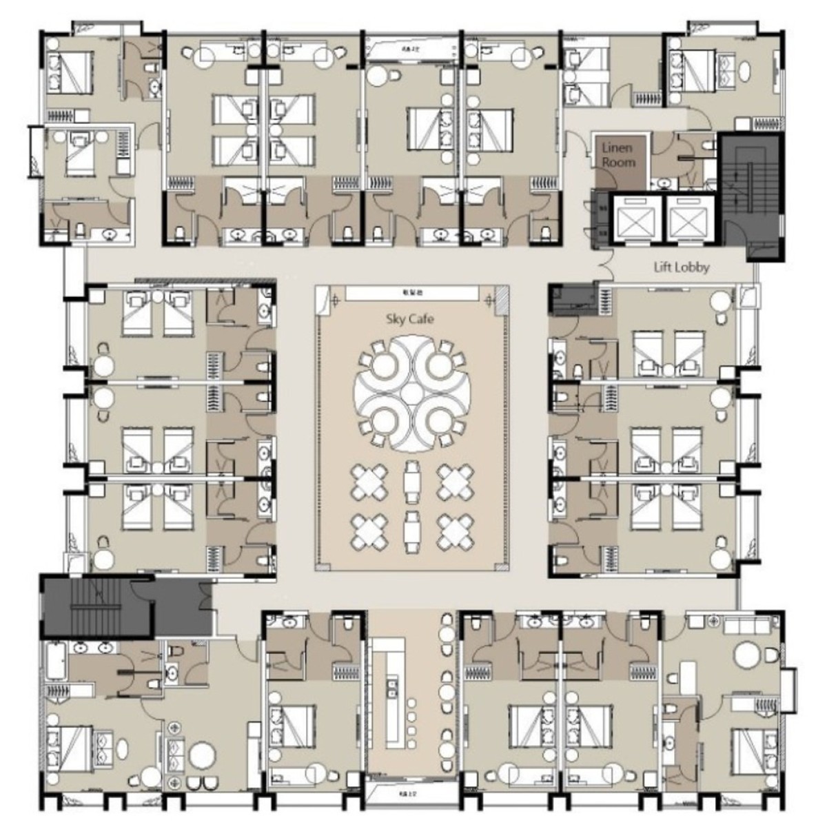Sky Café is located on the top floor and is a zen and church-like space constructed as a full height bamboo structure. A skylight above allows natural light to descend through the middle of the seating area during the daytime. Ceiling suspended circular LED lights form a set of endless glowing moons, providing guests with a poetic nighttime experience.
