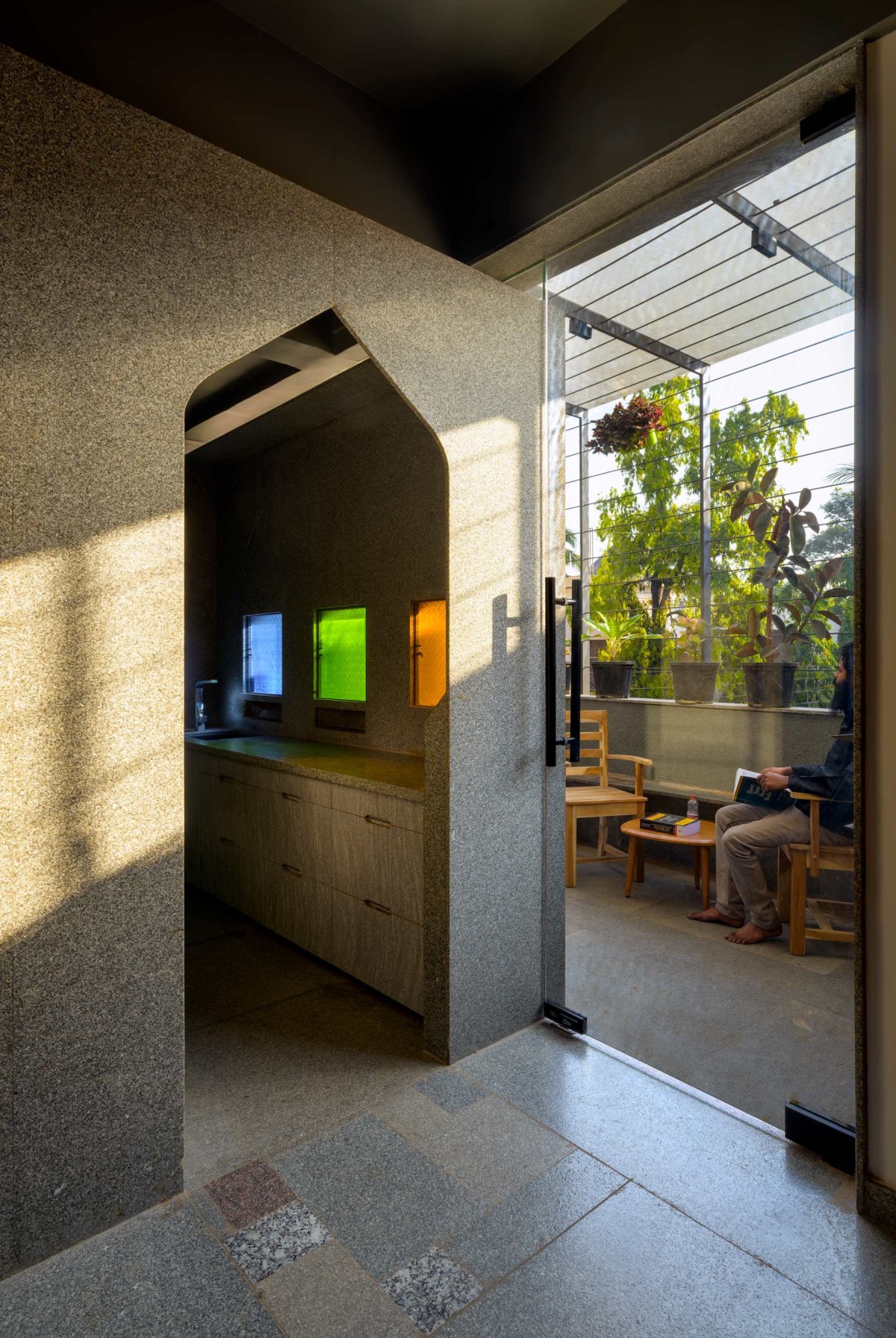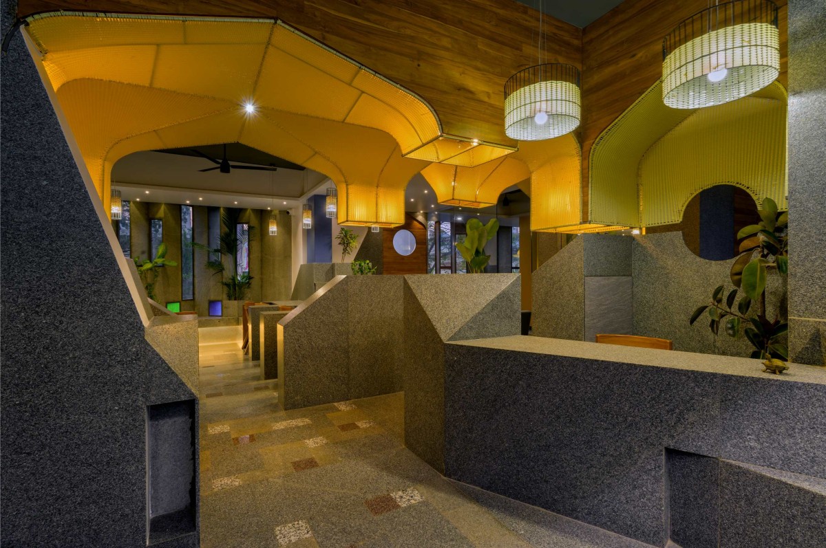 The decision of utilizing stone as primary material, in every element has led to maximize customization and has reduced the out-sourcing of furniture. Minimal material variations were considered with stone, glass, wood and woven mats. The approach to utilize locally available material and regional artisans for work has anchored in making the project cost efficient.
