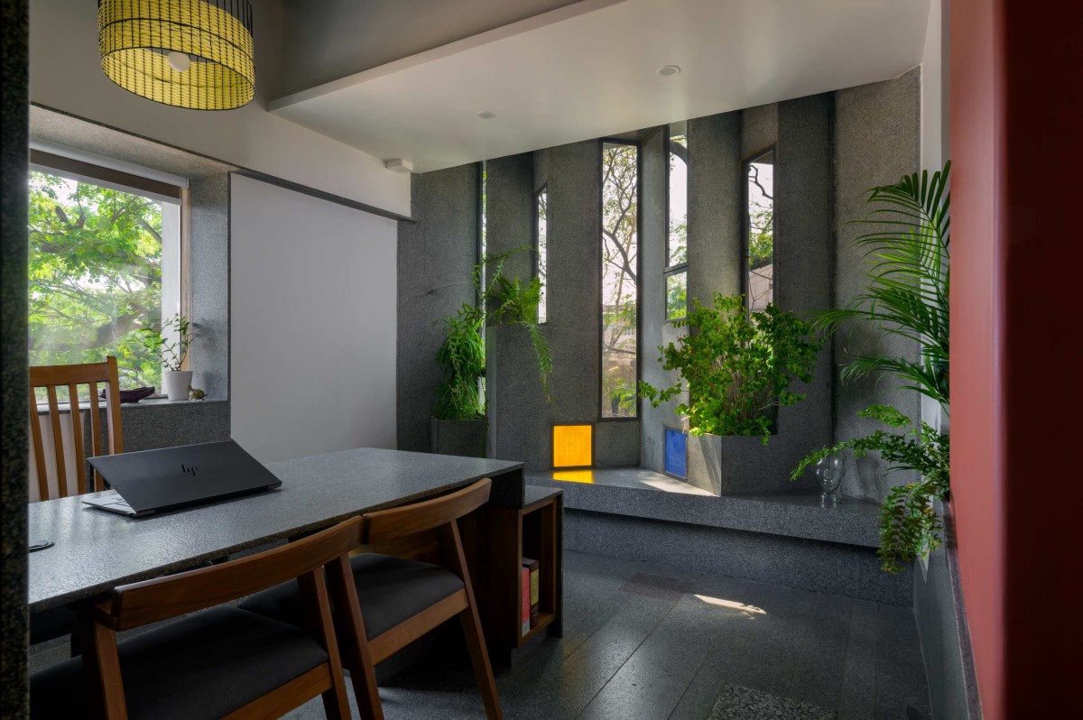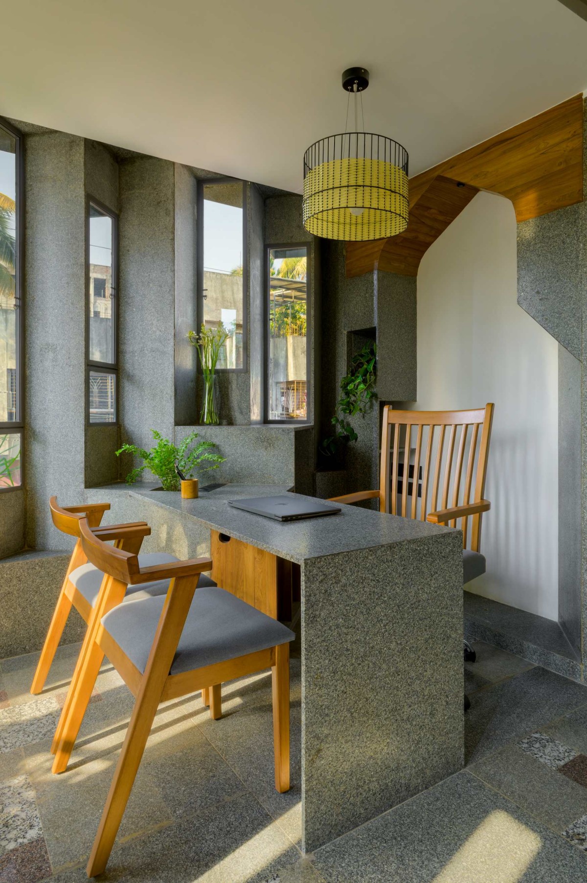 The client, a Chartered Accountant, envisioned the need for an open working space to encourage communication and interaction among each other, enhancing the productivity of the firm. This initiated the thought of zoning the workstation in centre and placing the cabin and other spaces around it which act as buffer zones ensuring a balanced blend of privacy and collaboration. Further for this workstation a modular grid was developed according to the space required for a single person. The grid was detailed into “L-shaped units” providing a personal enclosure for each individual. The central workstation is constructed entirely from granite stone, a material chosen based on the traditional architecture of the city. This choice helps create a monolithic appearance and eliminates the visual clutter of a crowded furniture assembly in the workspace.