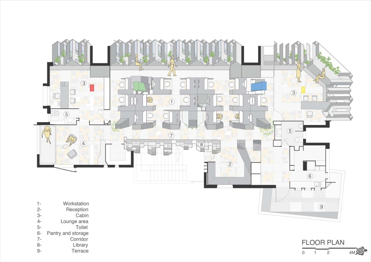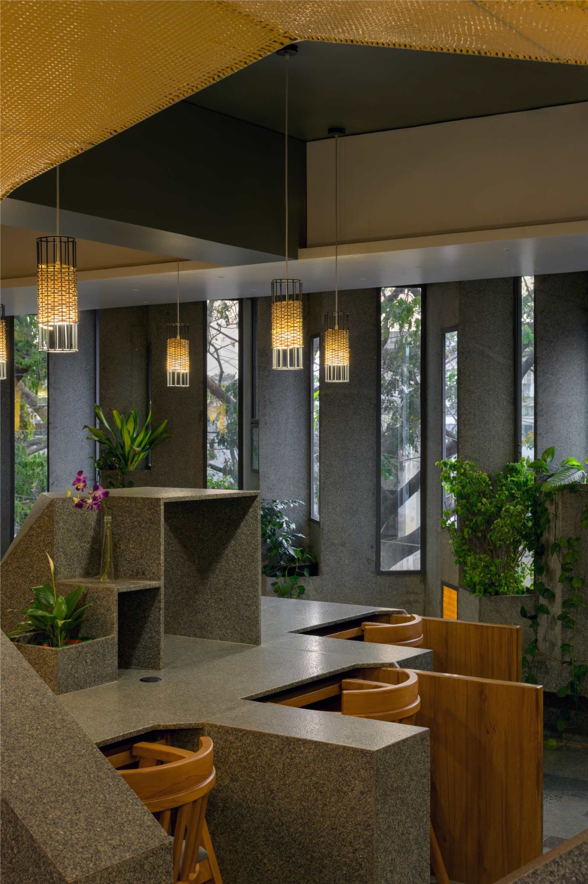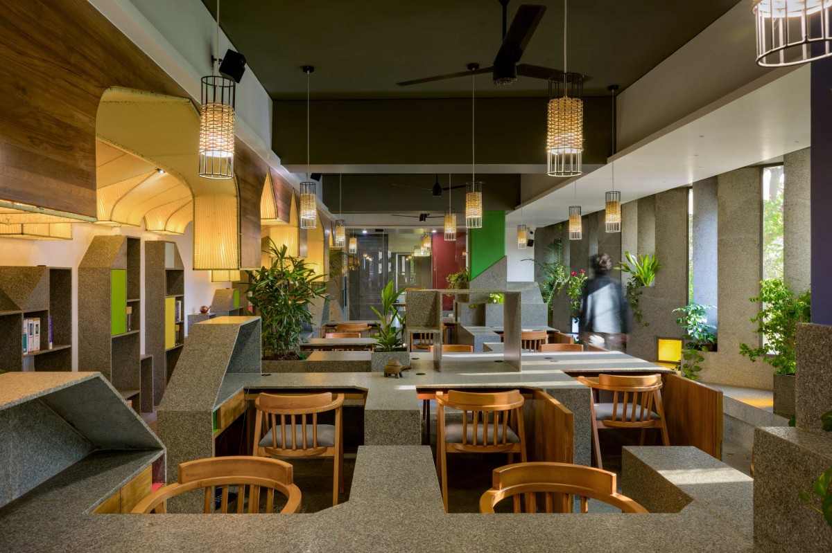 The screen on the west façade binds all the spaces together. The angular placement of interlocked stone planes helps in reducing the heat from the west while the mist cooling system helps to enhance the passive cooling measures. The stone-woven screen also integrates a seating area, that creates a spill-out space between the formal workstation and the extended informal seating. The intertwined stone screen with planters and varied fenestrations creates a scenic play of light and shade throughout different time frames of a day.
