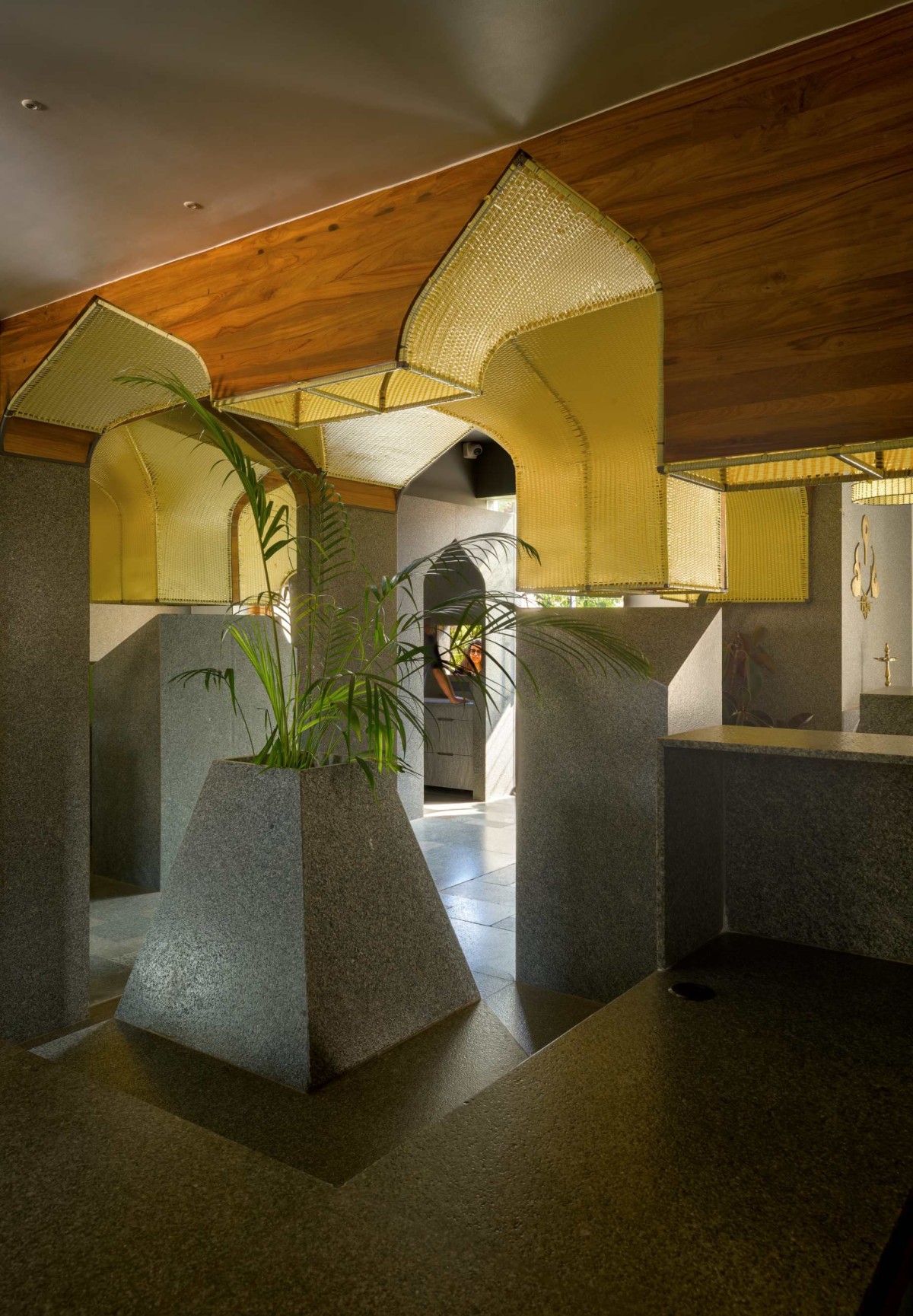 The monolithic usage of material and depiction of cultural heritage evokes a sense of permanence, grounding, and tranquillity, while also connecting the space to its origins.