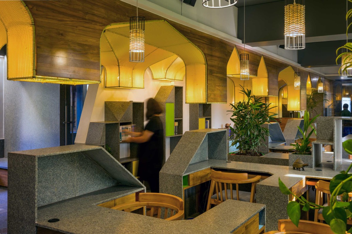 The corridor on the east is the main spine connecting all the spaces that creates a pause along the way by hosting a library. Crowned with an assembly of arches, the passage draws its impression from the traditional archways of the Raj-Wada Palace, this background of local identity enables a hidden connection with the users. These arch modules of distinct sizes are fabricated, assembled and suspended from the ceiling, thereupon weaved by local artisan on-site, which aims to capture the city’s culture and rich heritage of handloom industry, accomplishing a notion of abstract presence of traditional art and craft forms in present time.