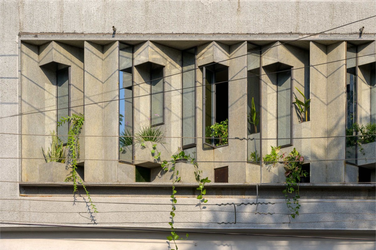 Detailed shot of facade of Modular Monolith by PMA madhushala