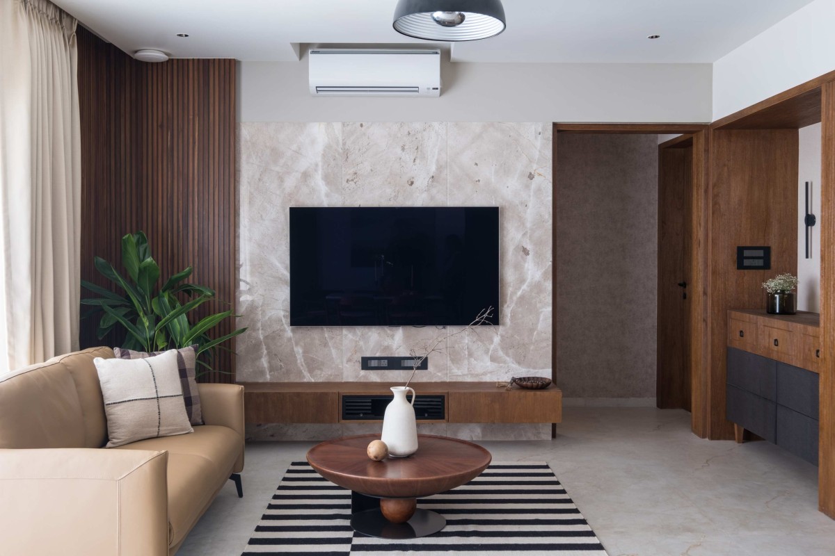 The master bedroom offers quite an incredible fabrication with a patterned flooring element and a fluted backdrop in nut brown with an accent marble stone finished pendant on one side of the bed, forming a gentle ambiance. A concealed storage unit behind the bed on the other side adds to the utility of the space without hindering its beauty. Apparently, waking up with a pleasant cherry blossom sight outdoors and a calming aura inside the master bedroom makes NEER extraordinary.