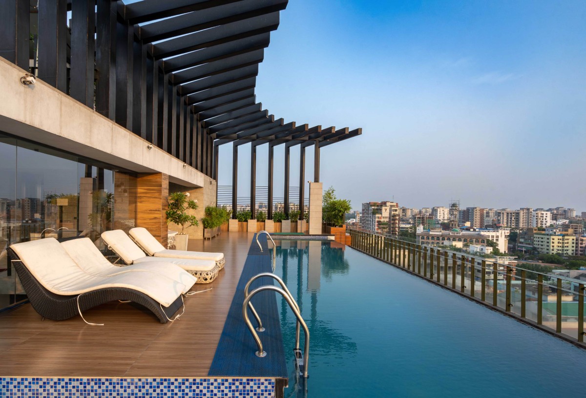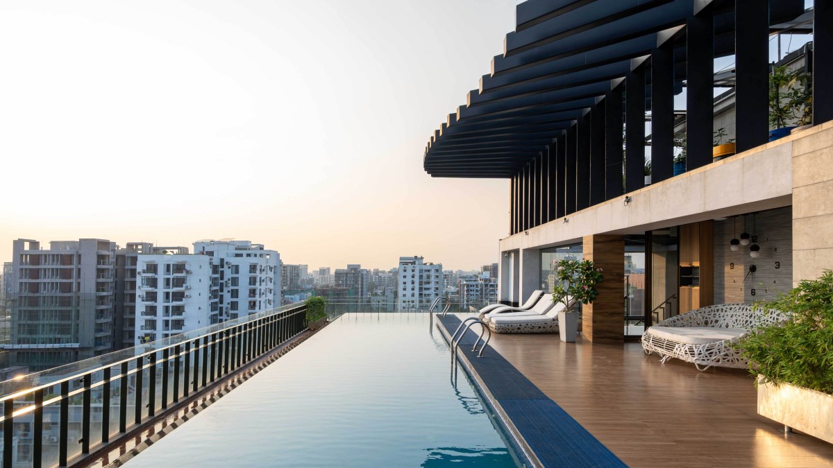 Try incorporating natural elements in small quantities to improve the properties of the roof integrated natural elements like wooden tiles, stones and greenery to create a space that feels deeply connected to nature. The elements not only soften the urban backdrop but also demonstrate a perfect balance between design and the natural world and encourage tranquility. On the other side, a swimming pool has been designed through a mezzanine floor to which an internal staircase and elevator are connected. This pool is located at the highest point in the Dhanmondi area Where the pool water appears to seamlessly blend with the city skyline creating a stunning infinity effect to enjoy the surrounding view beautifully. The design emphasizes luxury and tranquility with loungers lining the pool deck inviting relaxation in a tranquil setting. The glass railing enhances the illusion while maintaining safety allowing for uninterrupted views of the city.