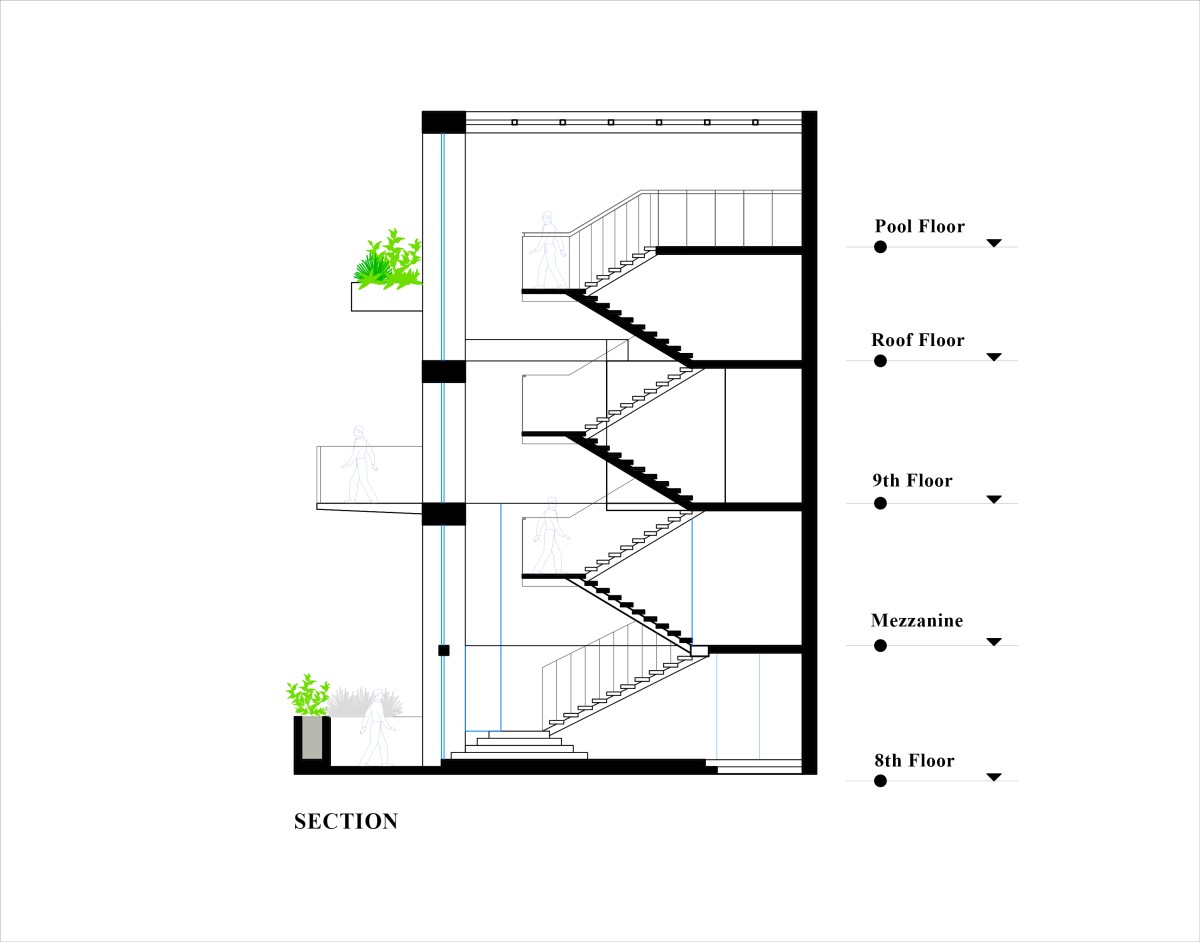 The core of the project is a penthouse of Approx. 15,500 square feet starting from the 8th floor. The inner courtyard on the inner side of this floor connected with the 9th floor, Roof floor and with a pool. During the renovation they added a steel and wooden staircase from the inner courtyard that unifies the entire house into one space. Being a floating staircase, it has more space on bottom and added some plants stones to bring life to the interior space. The entire part is open to the courtyard and the most precious beauty of the house can be enjoyed from here. The exterior facade in the Inner courtyard used Transparent glass that allows you to the sky, city view and everything that happens in nature from each floor. As this part is in the South West, thermally insulated glass is used here and windows for ventilation to air in and out.