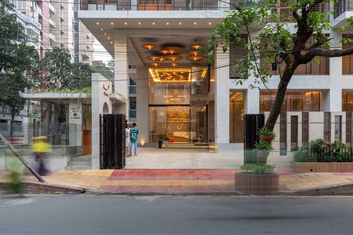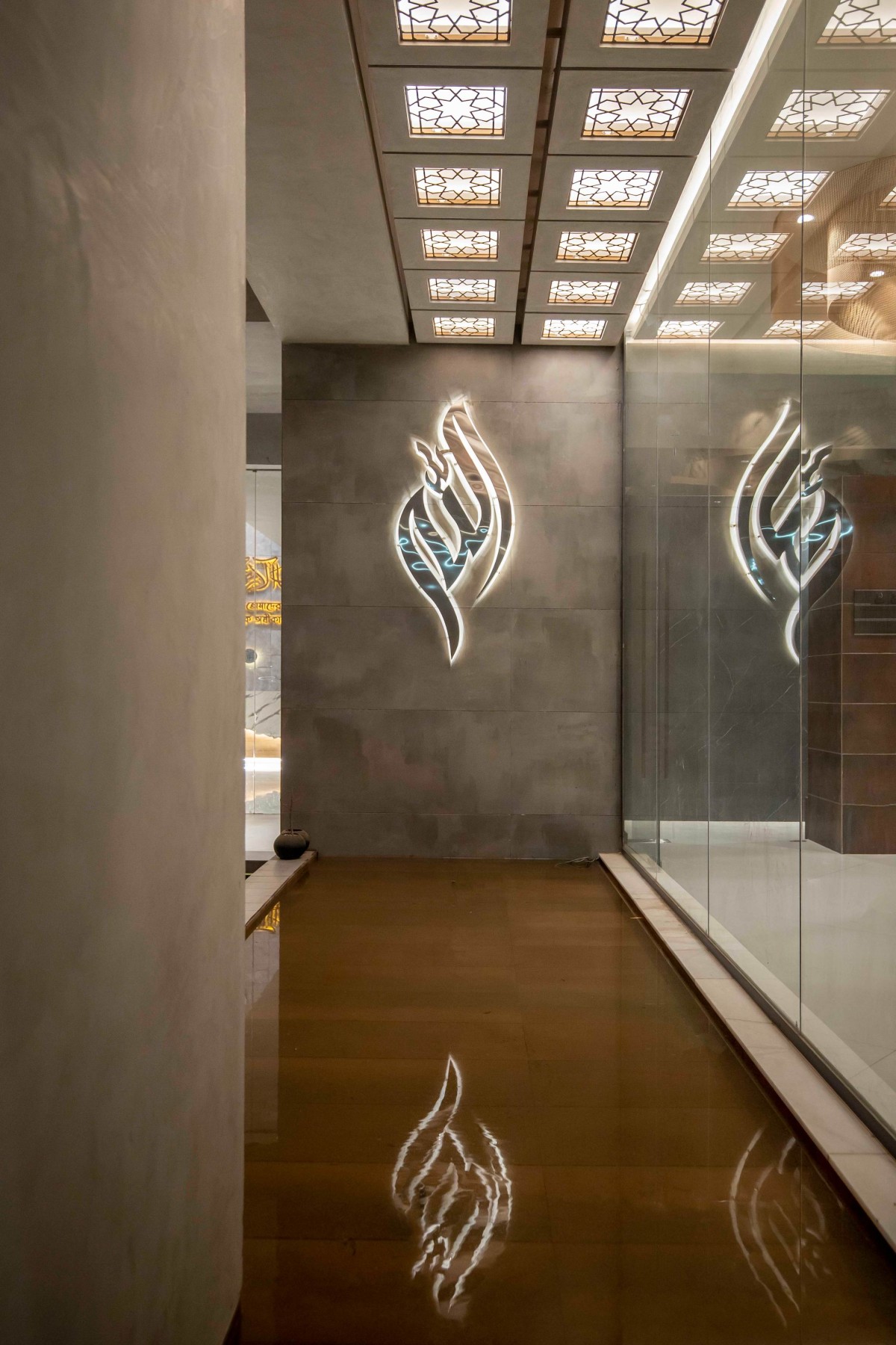 Entrance, reception and prayer area on the ground floor. Stairs connected to the main lift and reception room. The entrance ceiling design uses a cane chandelier. A shallow Water bodies are built around the prayer area to provide a bit of a natural feel. Here they used some flexible elements for interior design, color of the wall and some messy texture tiles to evaluate the prayer space. The Height of the reception and waiting area created a vibrant look by highlighting the walls through the interior design, lighting, tiles cutting and placing randomly. To design the boundary wall used an RCC wall, a type of calligraphy pattern and perforated sheet. This creates a harmony with the design of the entire building facade and maintains a visual relationship with the sidewalk.