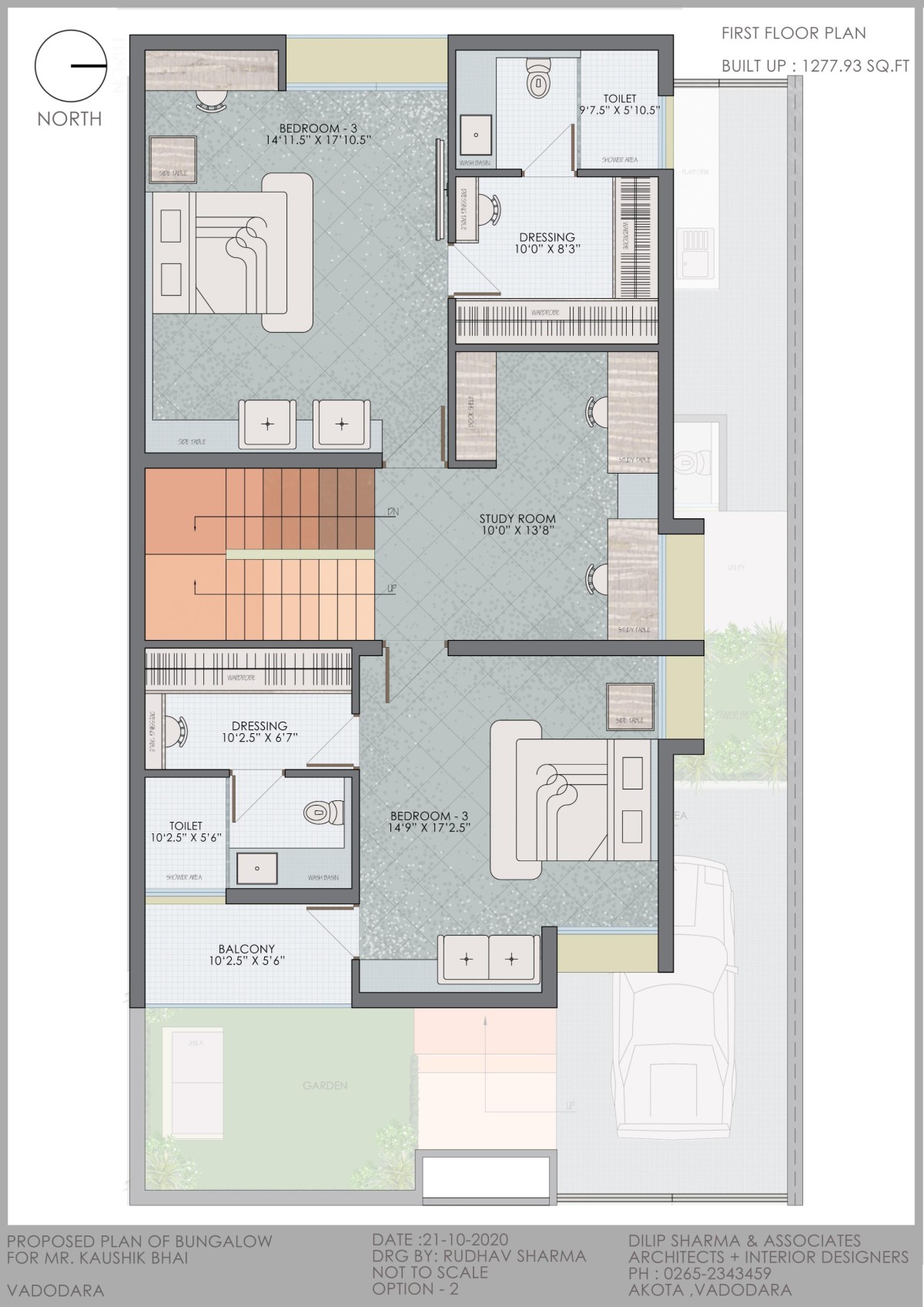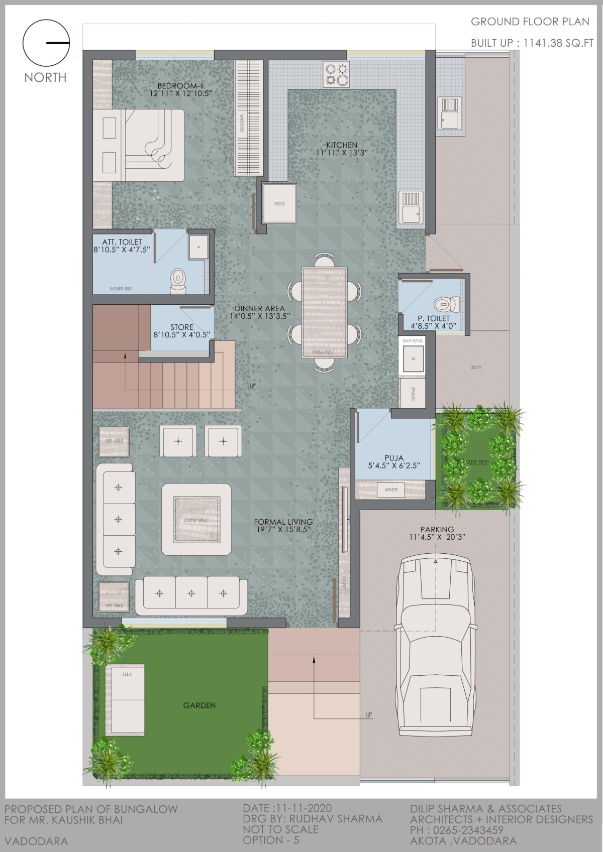 The planning was started such that it firstly full filled the clients' requirements starting with the living room and kitchen on the ground floor with a parent's bedroom and a puja room all laid in a simple grid plan, the stair cabin was being a barrier in the passage of light so the steps were exposed to the living room further a store was adjusted below the stair cabin due to lack of space.