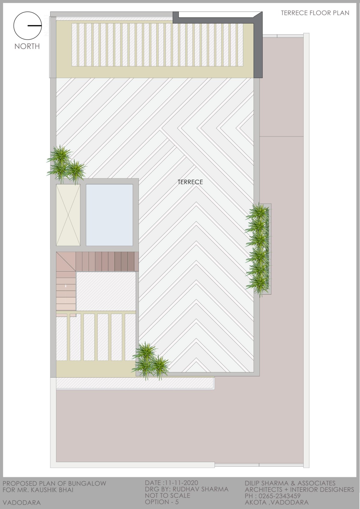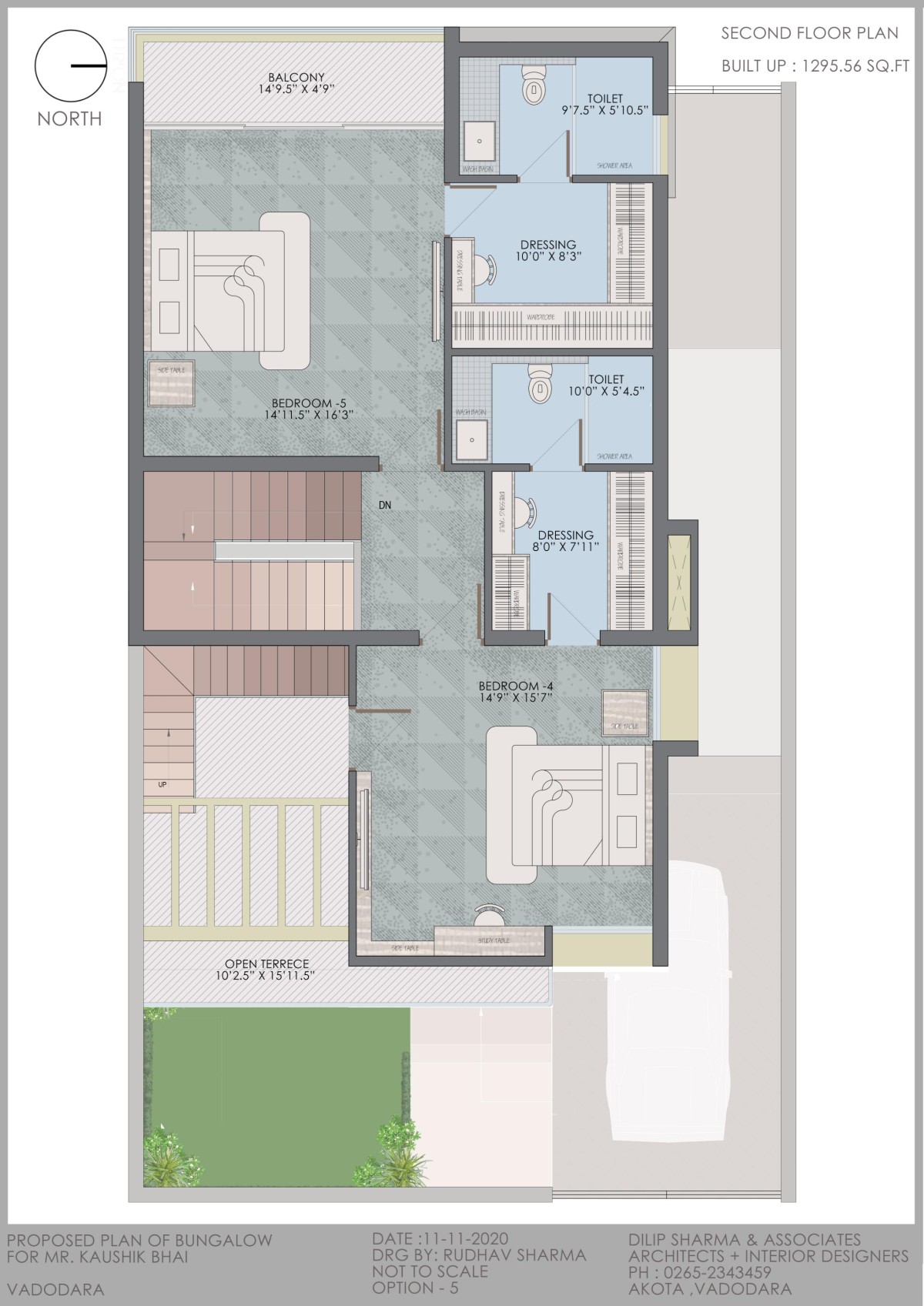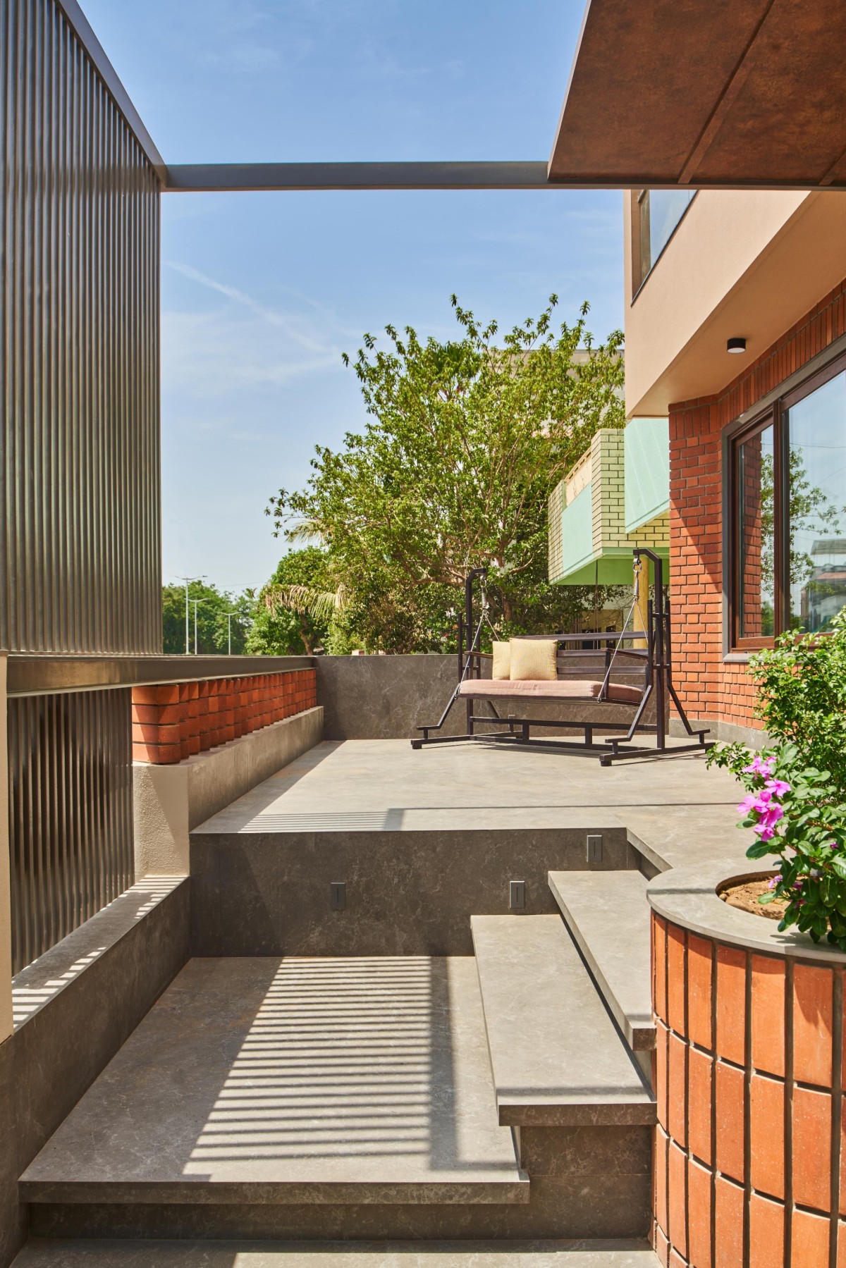 Further we go up to the last floor of the house having 2 bedrooms in the same orientation and a lower terrace, the stair cabin was built with a cut-out looking up to the sky, this presented a good amount of light throughout the stair well full height windows and balconies helped the house to be well lit and properly ventilated.
