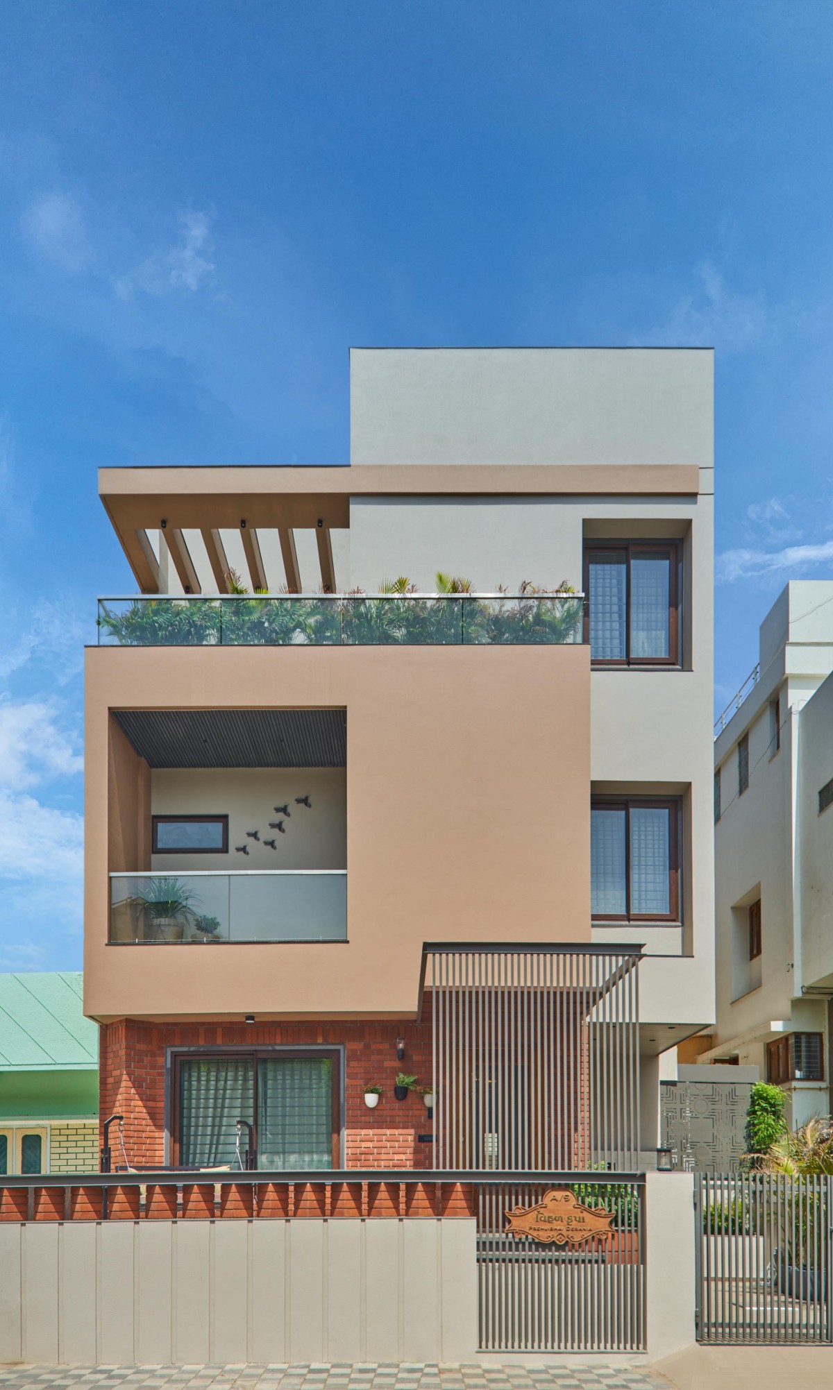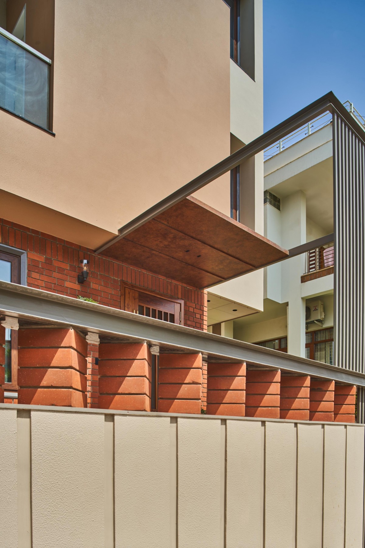 The client asked us to treat the elevation with non-white colours, we took our colour book in hand and started matching some earthly shades of brown that went along with the exposed brick elements. The job was not easy we got some samples done on the site and got the best combination for the house.